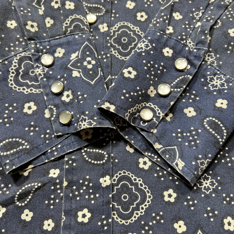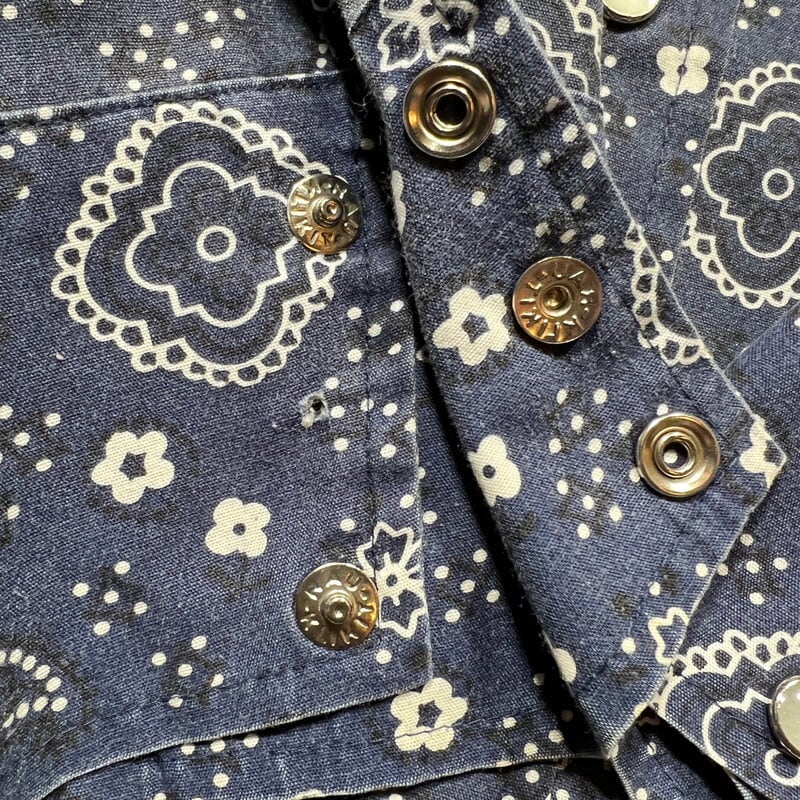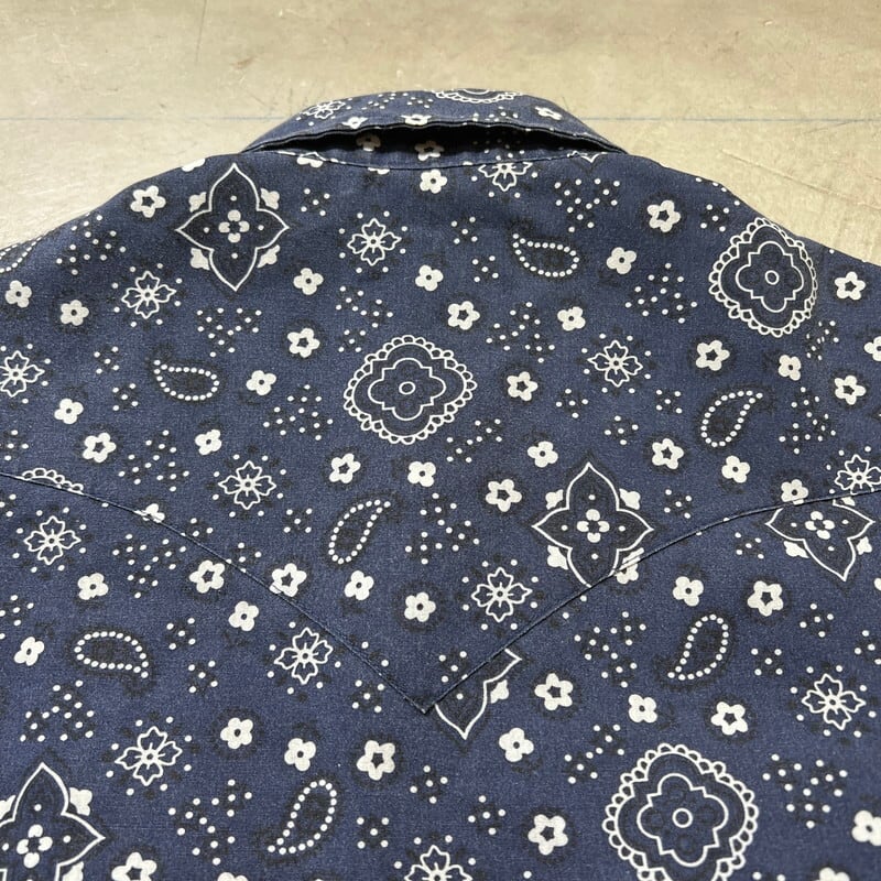 70年代頃のH BAR Cバンダナ柄ウェスタンシャツです。1897年にテーラーブランドとしてブルックリンで創業した老舗ブランドです。ご紹介するこちらは、人気の高いバンダナ柄があしらわれた1着です。バンダナ柄のウェスタンシャツでは珍しいネイビーカラーです。ホワイト部分は抜染、ブラック部分がプリントだと思われます。右袖のスナップボタンの裏側が1つ欠損しています。ボタンを閉じていればあまり気にならないと思います。全体的に色褪せはございますが、過度に褪色している訳ではなく程よいユーズド感がありますので、ヴィンテージウェアとの相性は抜群です。オーバーオールのインナーやデニムジャケットと合わせてみてはいかがでしょうか。サイズ表記が曖昧ですが、恐らくM相当です。ネイビーカラーはなかなか見つからないかなと思いますので、お好きな方は是非この機会にいかがでしょうか。