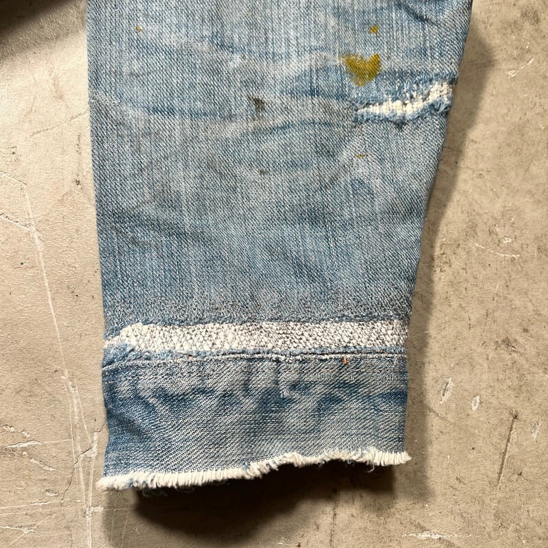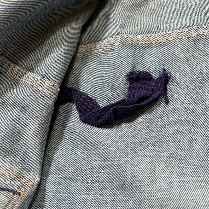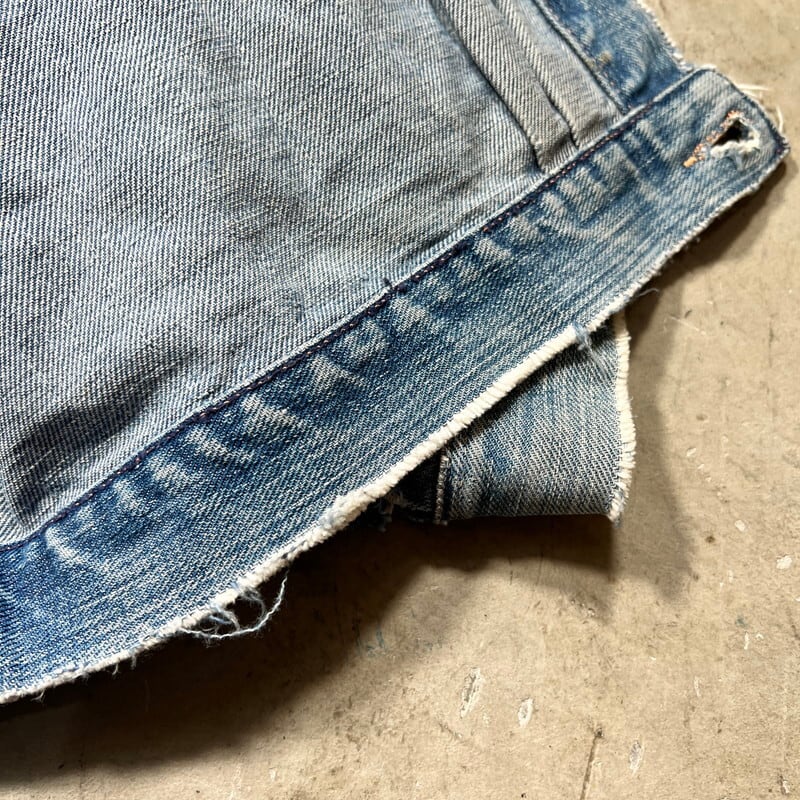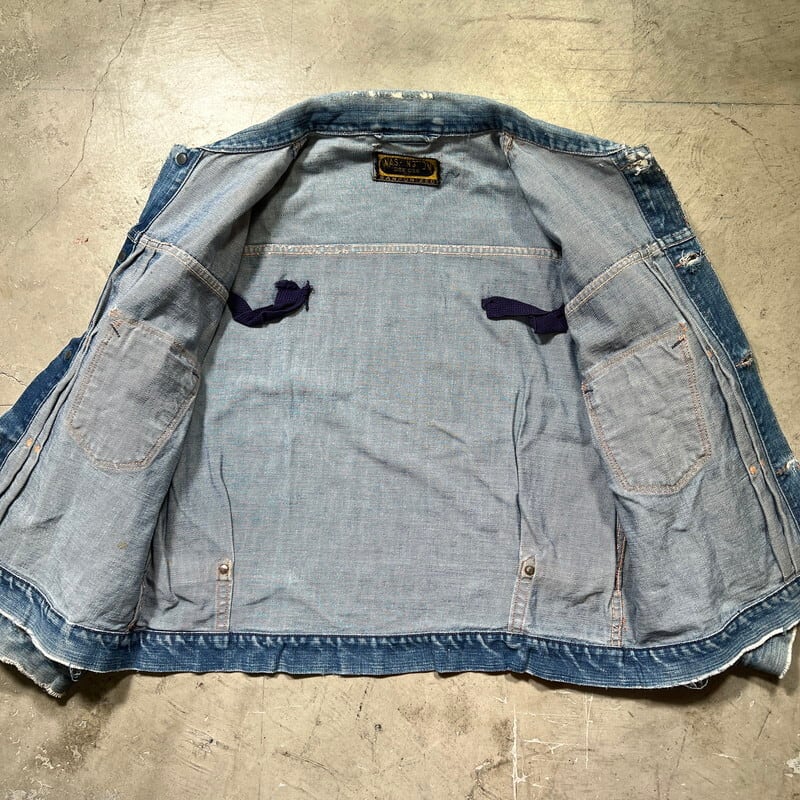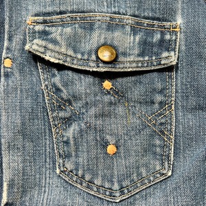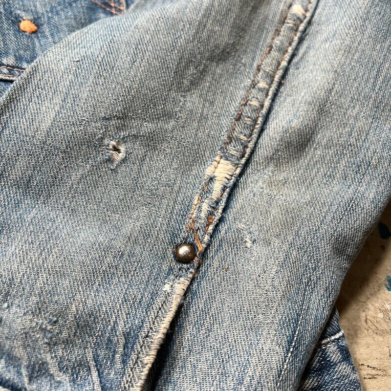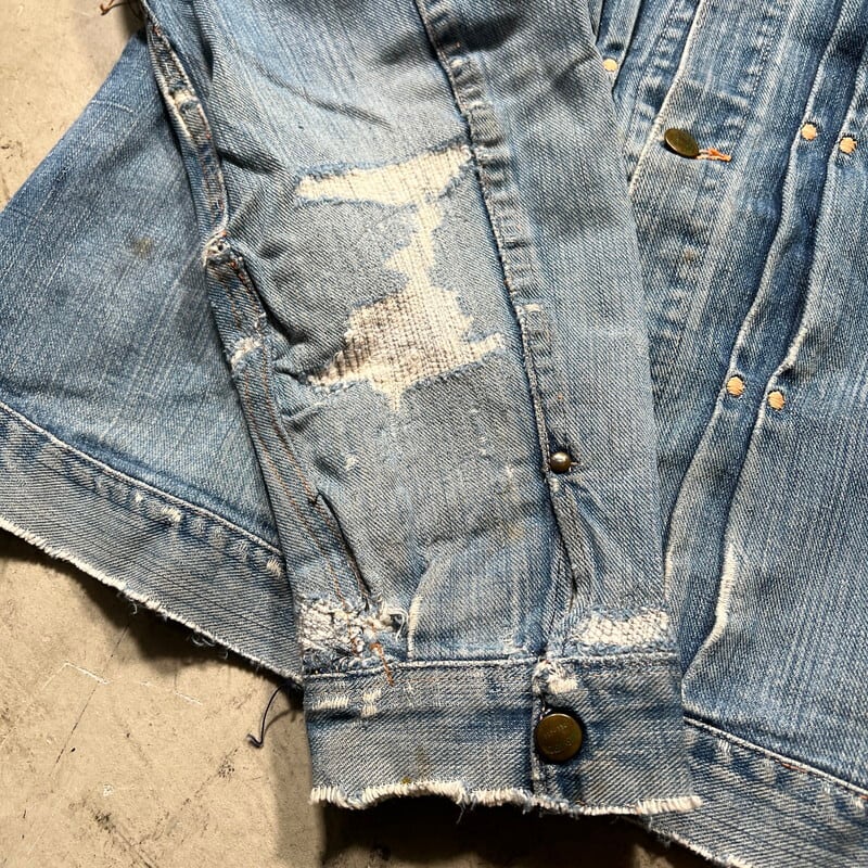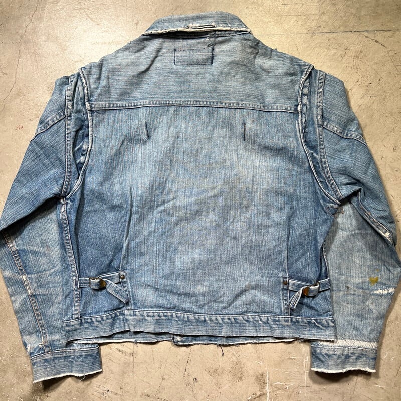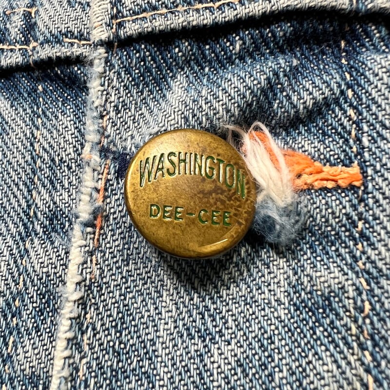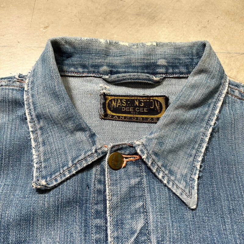 50年代頃のWASHINGTON DEE CEEデニムジャケットです。WASHINGTON DEE CEEとは1900年代初頭にテネシー州ナッシュビルのワシントンマニュファクチャリングカンパニーが所有していたワークウェアブランドです。OLD KENTUCKYやBAREKAT等も同カンパニーが所有していた所謂兄弟ブランドとなります。ご紹介するこちらのジャケットは、WRANGLERの111MJ(通称1stモデル)をモチーフに作られた珍しい1着です。古着で良く見かけるこちらのタグは®表記では無くREG表記の為恐らく60年代以前のモデルだと思われます。フロントは首振りボタンに2ポケ、プリーツ、丸い閂留め、丸いリベット、内側はゴムバンド、背面アクションプリーツにサイドアジャスター。胸元のポケットには丸カンとクロスステッチが施されていますが、それ以外のディティールはほぼ111MJと同じ作りをしています。全体的にリペアやダメージが多く、色残りも2割程で決して状態は特ありませんが、44-46位はあると思われるビッグサイズです。ラングラーの111MJ自体現存数は少なくなかなか実物を見る機会は少ないですが、こちらの個体は111MJに比べるとさらに珠数は少ないのではないででょうか。再度リペアでお直ししたりと何かと手が掛かる個体ですが、このタイプでこのサイズ感の物は本当に見つからないと思います。リペアやダメージは多いですが、持っていて損の無いアイテムだと思います。状態特価ですので、気になる方は是非お早めに。