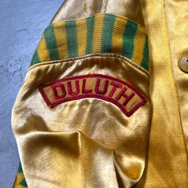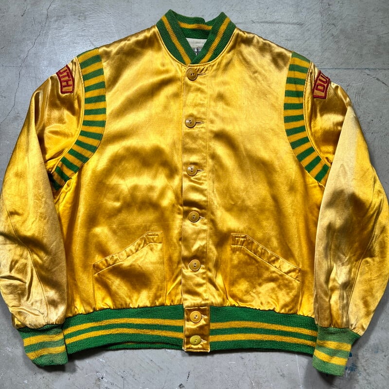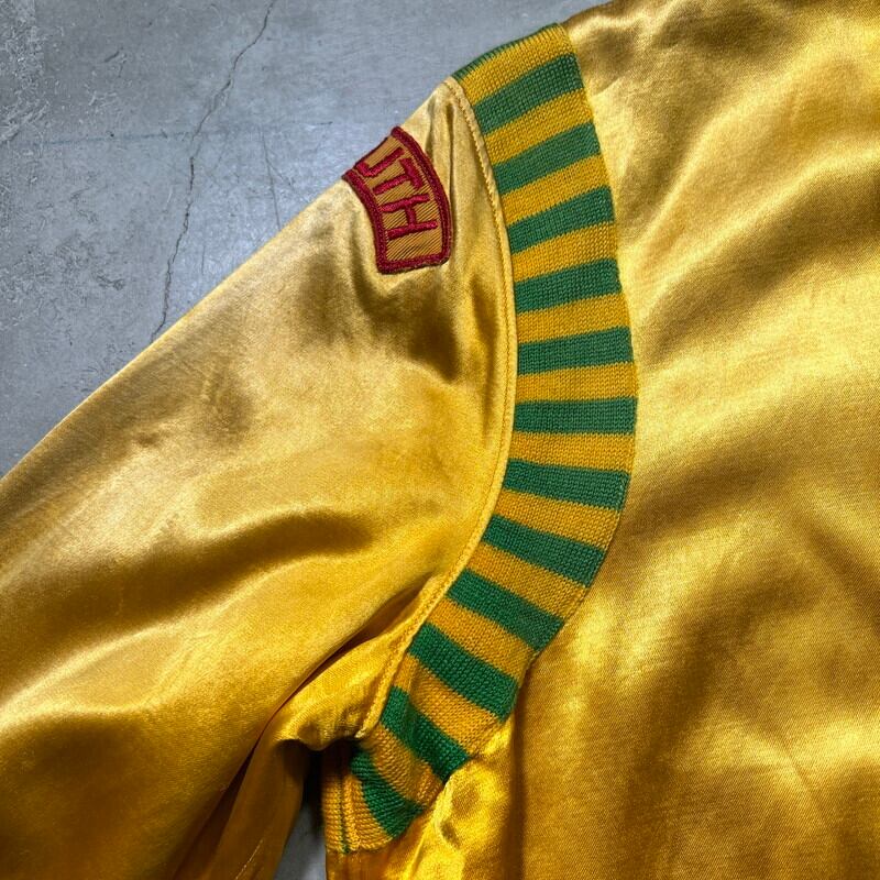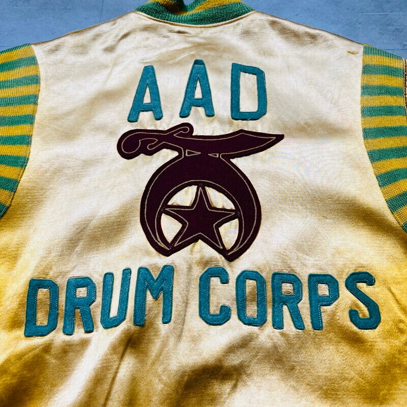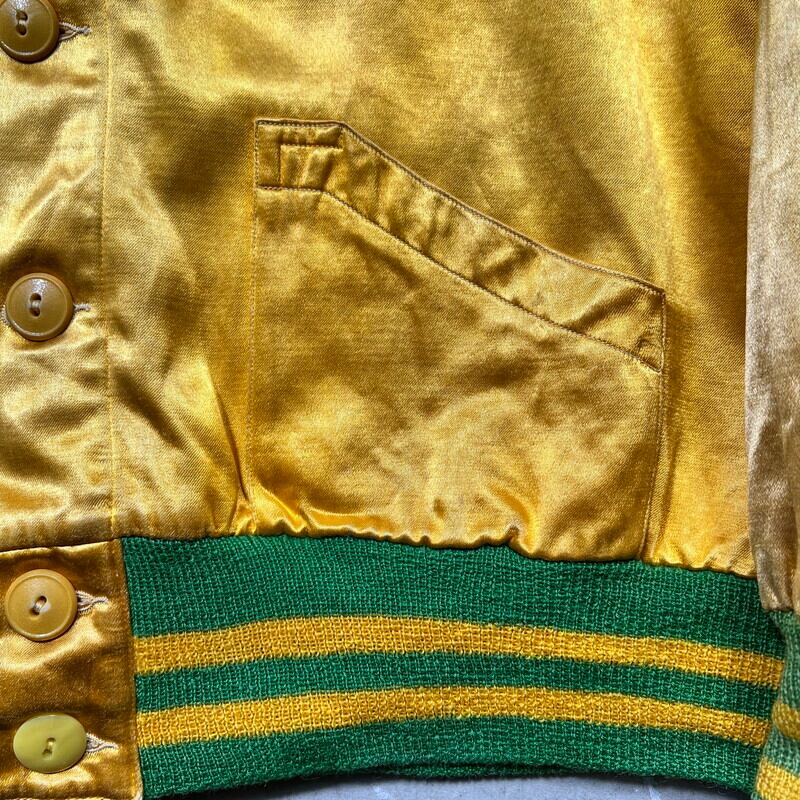 40年代頃のNELSON SPORTS WEAR サテンボタンスタジャンです。ミネソタ州DULUTHの拠点があったNELSON KNITTING MILLSが手掛けていたスポーツウェアラインのアイテムです。フロントがスナップでは無く縫い付けのボタスタで、小ぶりな変形パチポケが付く古い仕様の1着です。イエローゴールドのサテンにグリーンが映えるカラーリングで、両肩にはDULUTHのワッペンが縫い付けられています。見返り内側にはネームパッチが付き、ナンバリングが手書きされています。背面にはフリーメイソンから派生したシュライナーのマーチングバンドの一種であるDRUM CORPSのフェルトパッチが施されています。細かな傷やヤケ等があり、リブに小穴やハンドリペア等ございますが、致命的なダメージは無く年代を考慮するとかなり状態は良いと思います。サイズは42表記ですが、身幅にゆとりがあり44-46位はあるかと思います。古い年代のボタスタで、この大きさの物はかなり珍しいのかなと思います。シュライナーらしいカラーリングでほとんど人と被る事は無いと思います。フリーメイソンやシュライナー関連のコレクターの方は是非この機会にいかがでしょうか。