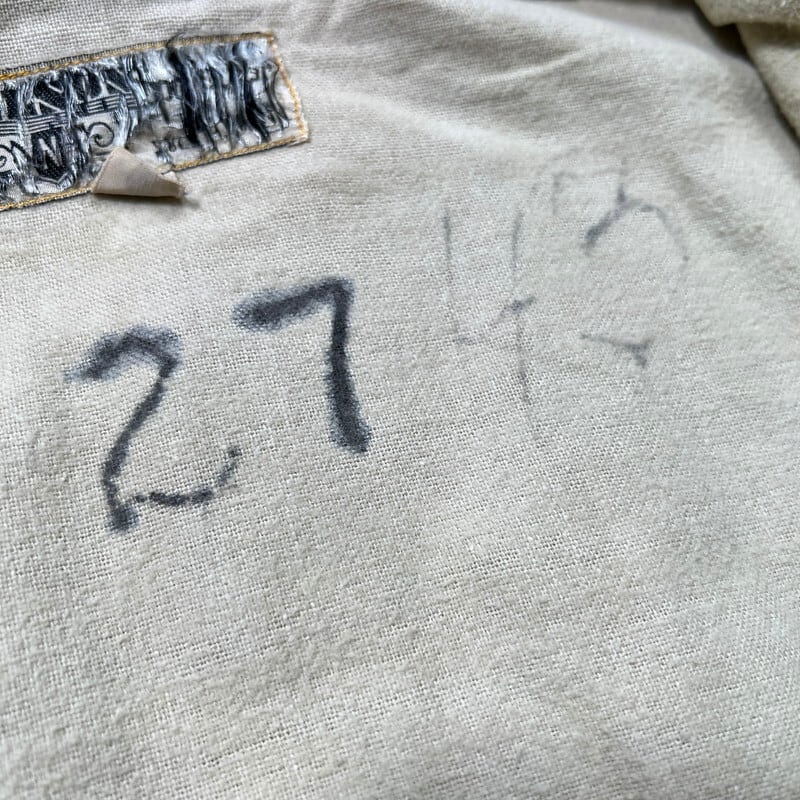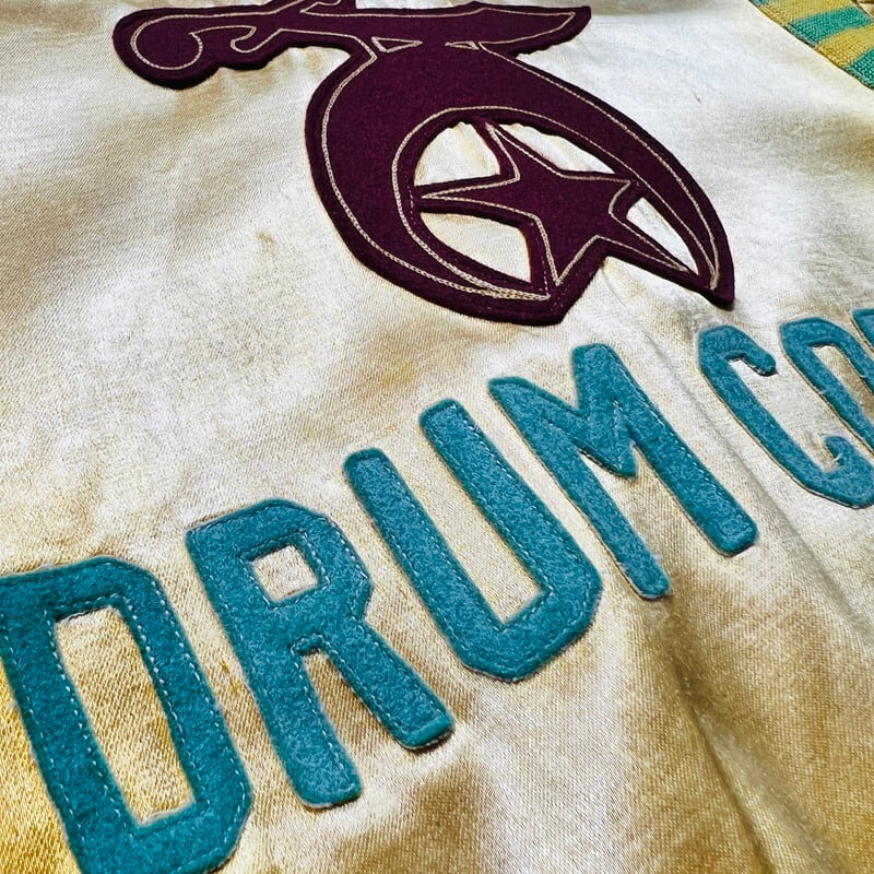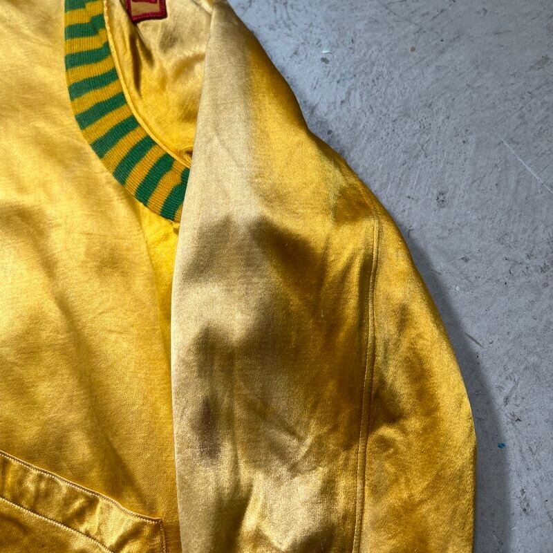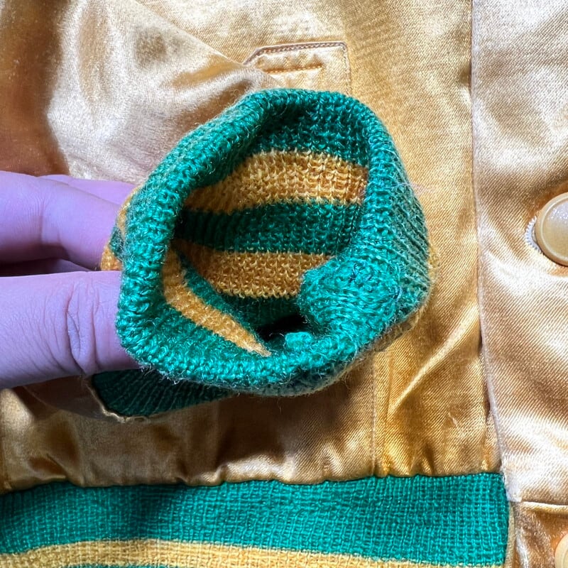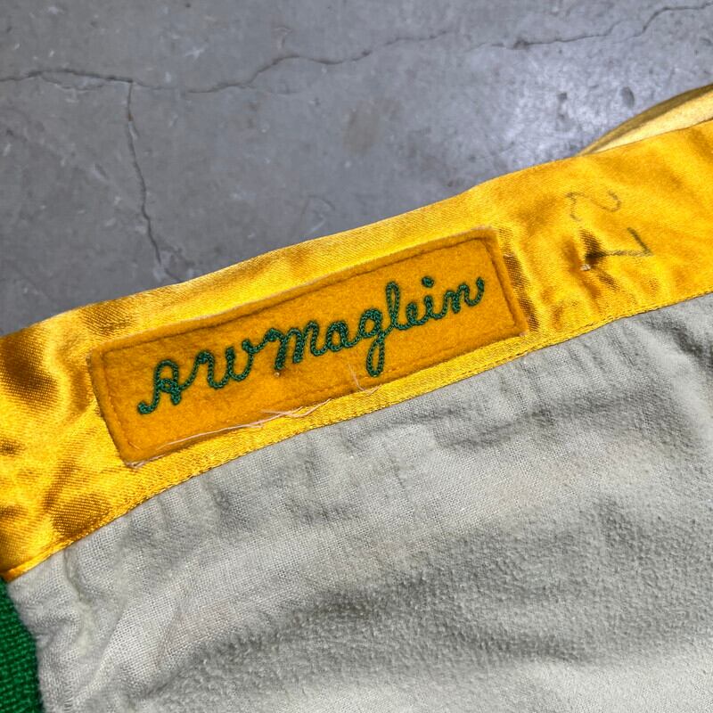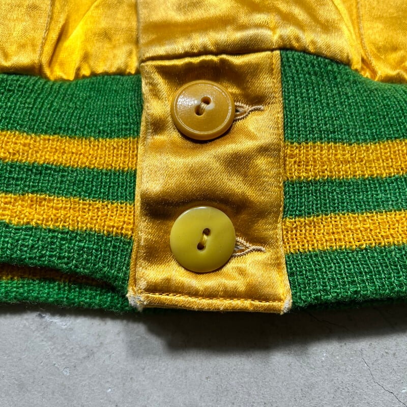 40年代頃のNELSON SPORTS WEAR サテンボタンスタジャンです。ミネソタ州DULUTHの拠点があったNELSON KNITTING MILLSが手掛けていたスポーツウェアラインのアイテムです。フロントがスナップでは無く縫い付けのボタスタで、小ぶりな変形パチポケが付く古い仕様の1着です。イエローゴールドのサテンにグリーンが映えるカラーリングで、両肩にはDULUTHのワッペンが縫い付けられています。見返り内側にはネームパッチが付き、ナンバリングが手書きされています。背面にはフリーメイソンから派生したシュライナーのマーチングバンドの一種であるDRUM CORPSのフェルトパッチが施されています。細かな傷やヤケ等があり、リブに小穴やハンドリペア等ございますが、致命的なダメージは無く年代を考慮するとかなり状態は良いと思います。サイズは42表記ですが、身幅にゆとりがあり44-46位はあるかと思います。古い年代のボタスタで、この大きさの物はかなり珍しいのかなと思います。シュライナーらしいカラーリングでほとんど人と被る事は無いと思います。フリーメイソンやシュライナー関連のコレクターの方は是非この機会にいかがでしょうか。