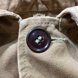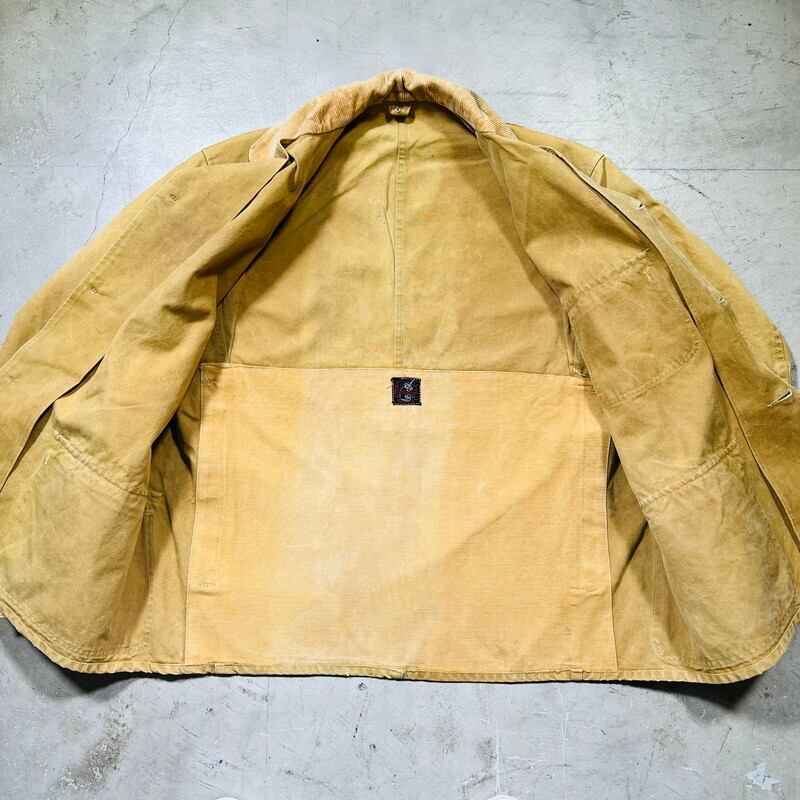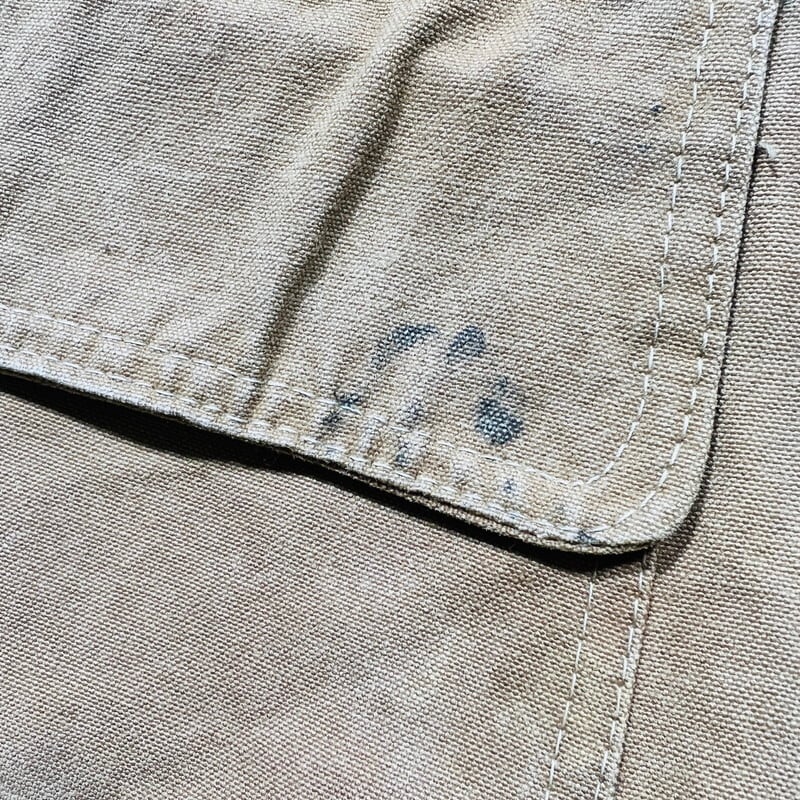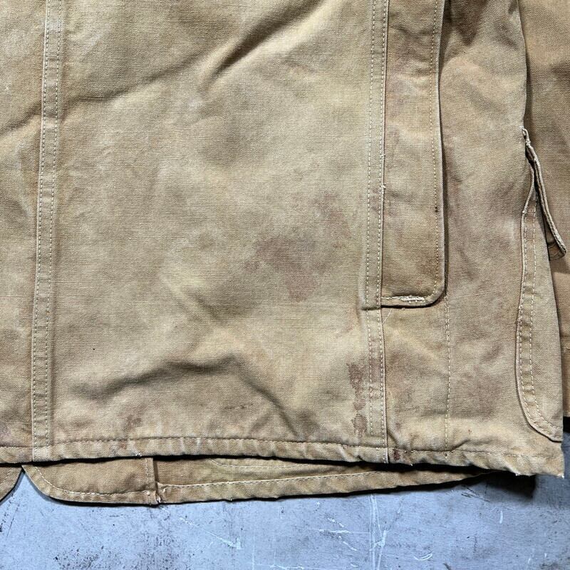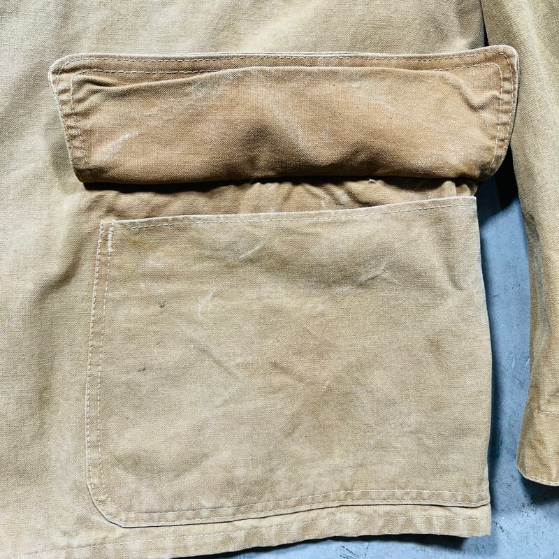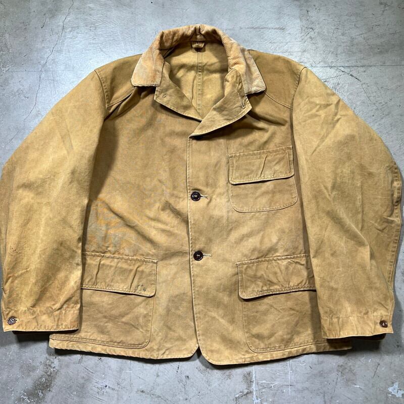 30年代頃のWeatherBakキャンバスハンティングジャケットです。WeatherBakというブランドのタグが付くこちらは、フロント4つボタン、3ポケット、コーデュロイ襟と非常にシンプルながらもクラシカルな印象の1着です。フラップポケット内部にはカートリッジホルダーは付かない簡素な作りをしています。フロントの4つは樹脂製、袖は塗装された木製のボタンが使用されています。生地は1枚仕立てなので、ごわつきは無くさらっと羽織りやすいです。シルエットは古いジャケットで見られる綺麗なAラインです。肘付近はゆとりのある太さのアームで、背面にはアクションプリーツも入りますので、肩周りはストレス無く可動できます。袖はやや短めな作りの為袖先がもたつかずすっきりとしています。着丈も長くは無いのでかなり着やすいシルエットだと思います。所々にシミ汚れはございますが、この年代のハンティングジャケットとしてはかなり状態の良い個体です。背面のゲームポケット内も比較的綺麗です。アウトドアウェアの中でも人気の高いハンティングジャケットは色んなスタイルのコーディネートでも合わせやすいシンプルなデザインですので、1着あると大変重宝します。すでにお持ちの方はコレクションとして手に入れられるのも良いのでは無いでしょうか。サイズ表記hあございませんが、L相当だと思います。80年から90年近く前のアンティークに近い古いアイテムがお好きな方は是非。