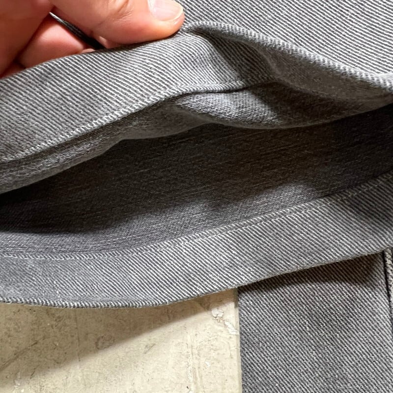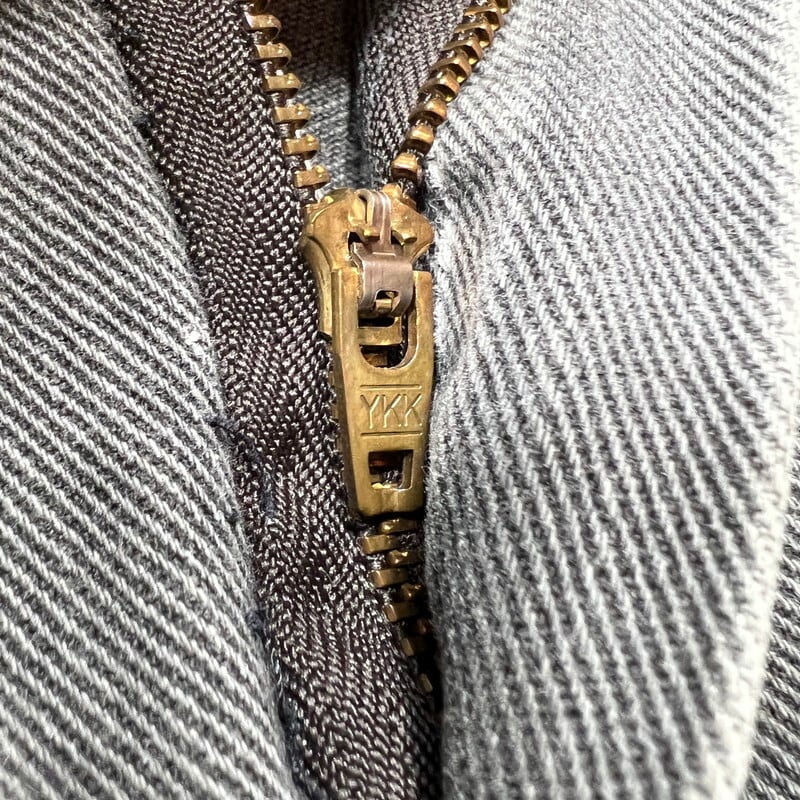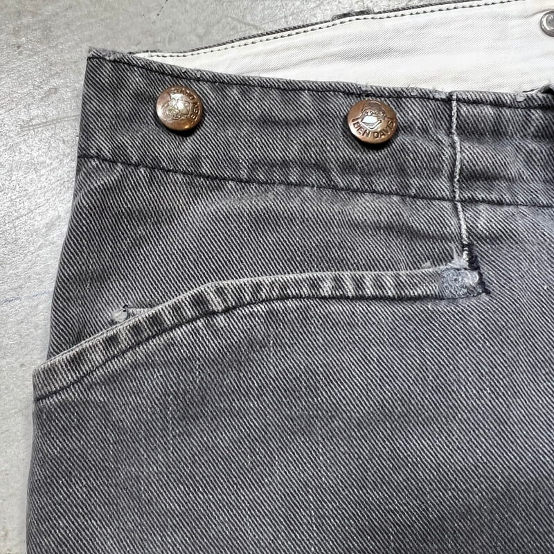 50年代から60年代頃のBEN DAVIS ワークパンツです。BEN DAVIS は1935年カリフォルニア州サンフランシスコで設立されたワークウェアブランドです。ご紹介するこちらは古い刺繍タグが付くモデルで、ウエストにサスペンダーボタンが付く仕様の1本です。フロントのジッパーはYKKに交換されています。フェードしたグレーが雰囲気良く、うっすらとヒゲが入ります。ベルトループやウエスト縁、内股部分などに擦れや細かなダメージがいくつか見られます。右ポケットの付け根にリペアが施されています。ウエストは実寸W36インチとゆとりのあるサイズ感です。レングスはやや短めに裾上げされています。擦れなどございますが、この年代辺りのBEN DAVISはなかなか見つかりづらいと思いますので、サイズが合う方は是非この機会にいかがでしょうか。