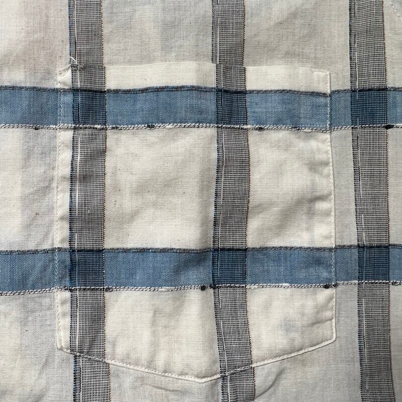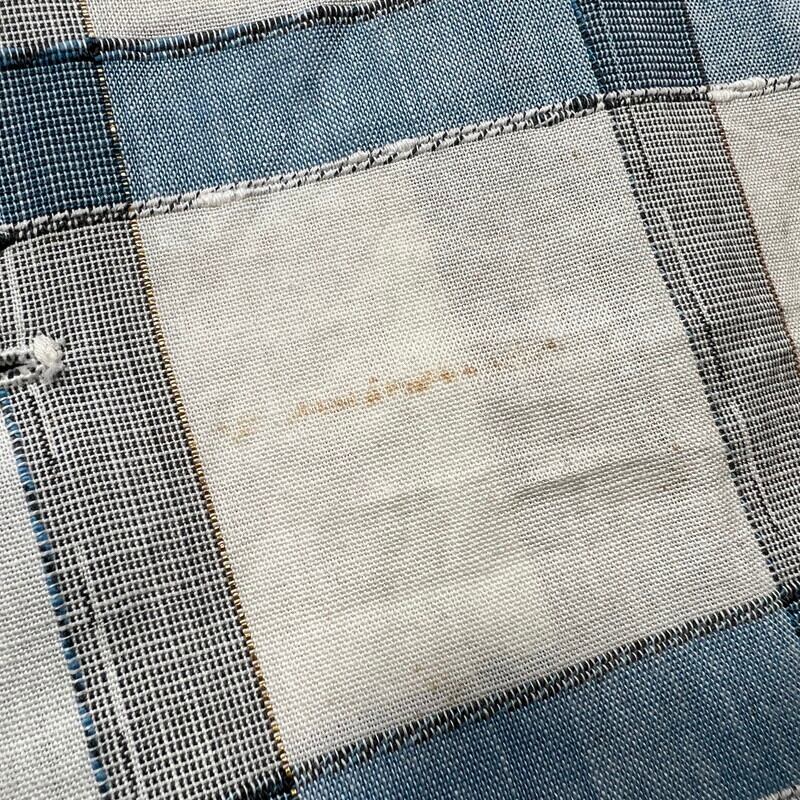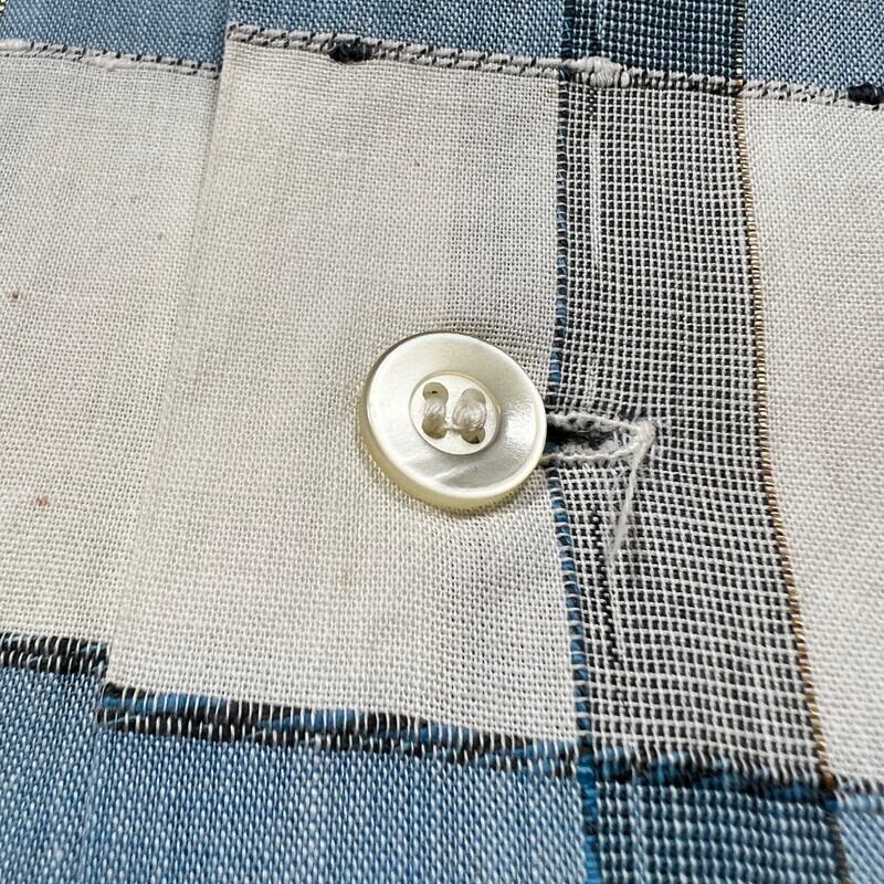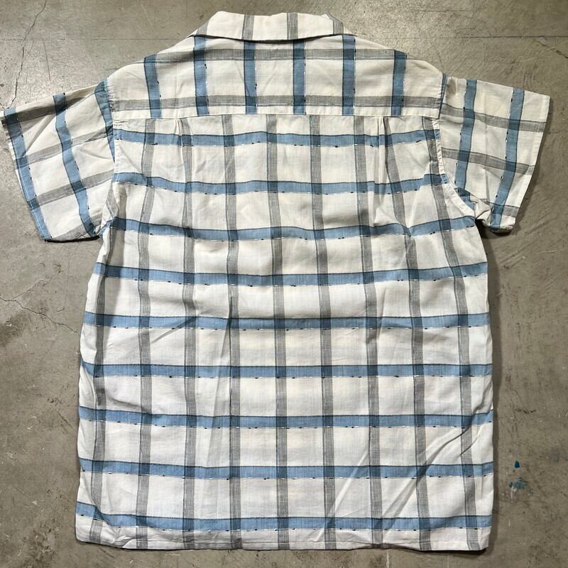 50年代から60年代頃のAmberleyチェックオープンカラーシャツです。ブランド詳細は不明ですが、襟芯の入らない開襟スタイルで、サイドはダブルステッチで縫製されています。コットンのホワイトボディにブルーとグレーのチェック柄で、アクセントに金糸が使われています。ポケットは柄合わせされています。フロントや肩回りに細かなシミが見られます。袖の内側にステッチほつれが見られます。恐らくですが、袖は丈直しされているようでやや短めですっきりとしています。シンプルなデザインで涼し気な印象ですので、これからの季節にとても使い勝手の良い1着です。表記はMサイズです。インナーは無地のタンクトップでさらっと羽織ってみてはいかがでしょうか。