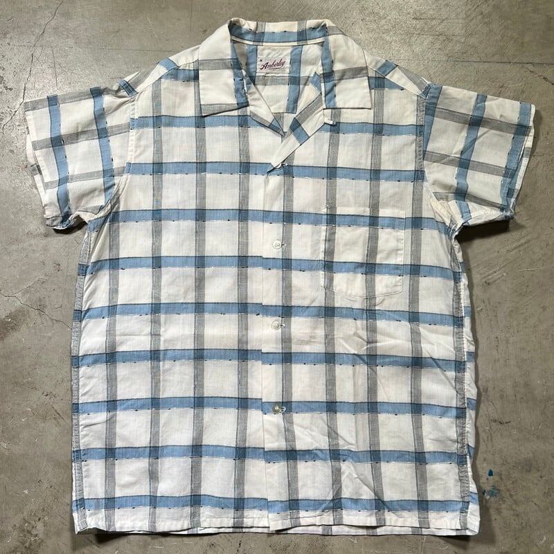 50's 60's Amberley チェックオープンカラーシャツ 開襟 ボックスシャツ 金糸 襟芯なし ホワイト ブルー Mサイズ 袖丈カスタム 希少 ヴィンテージ BA-1908 RM2327H