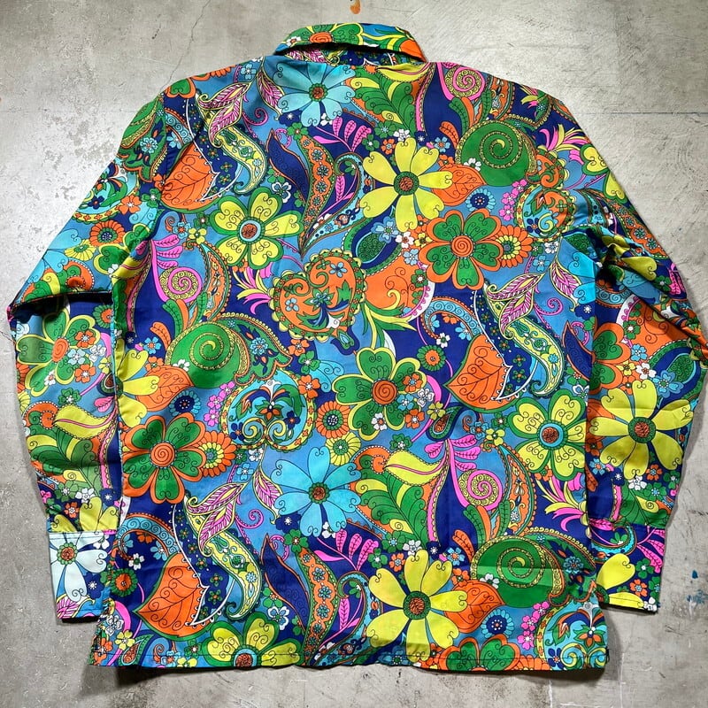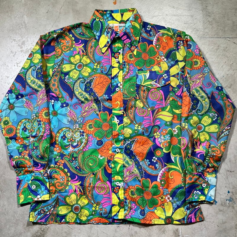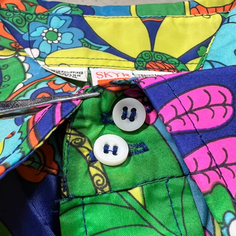 70年代頃のSKYR総柄ナイロンシャツです。1963年初頭にアメリカのマサチューセッツ州ウィンチェスターで設立されたSCANDIA TRADING CO INCが展開していたブランドで、1964年にこのSKYRのロゴマークが商標登録されています。ご紹介するこちらのアイテムはナイロン100%で全面にプリントが施されています。60年代後半にアメリカで生まれたヒッピーカルチャーに焦点を当てたといっても過言ではない、色鮮やかでサイケデリックなピーターマックスを彷彿とさせるデザインがとても目を惹く1着です。花やペイズリー等の図柄も一癖も二癖もあるタッチで描かれており、当時の時代背景を反映した素晴らしいデザインだと思います。サイドにはスリットが入り、このタイプのシャツでは珍しく裾がラウンドしていないタイプとなっています。ボックスシャツのようですが、ウエストがややシェイプされたシルエットです。多少の薄汚れはあるもののダメージは特に無く状態は良好だと思います。「The 70's」というデザインですので、あれこれ工夫はせずフレアパンツで合わすのが一番カッコ良いかもしれません。サイズはメンズのM表記でM~L相当位のゆとりはございます。ディスコシャツっぽいデザインですが身幅はタイトでは無いので着やすいサイズ感だと思います。久々に心が躍るグッド70'sに出会えた気がします。Peter Maxやブラックライトアート等がお好きな方にも是非ともオススメしたいアイテムです(※本品はブラックライトには反応しません)。