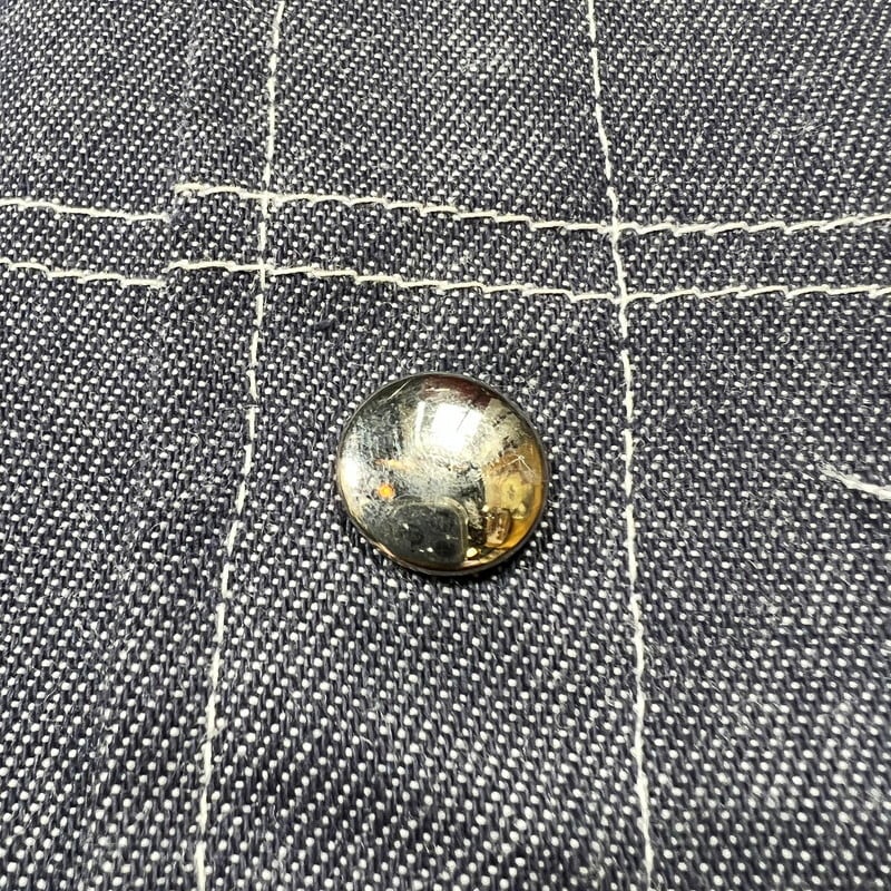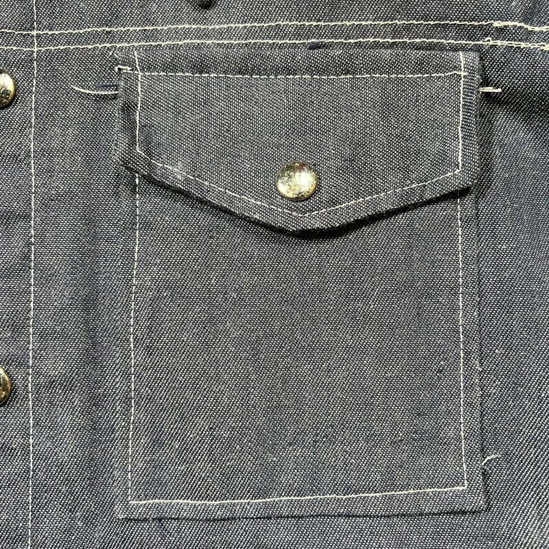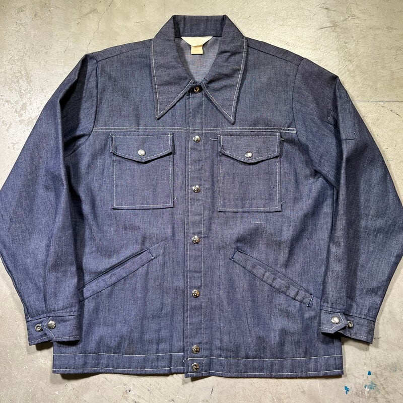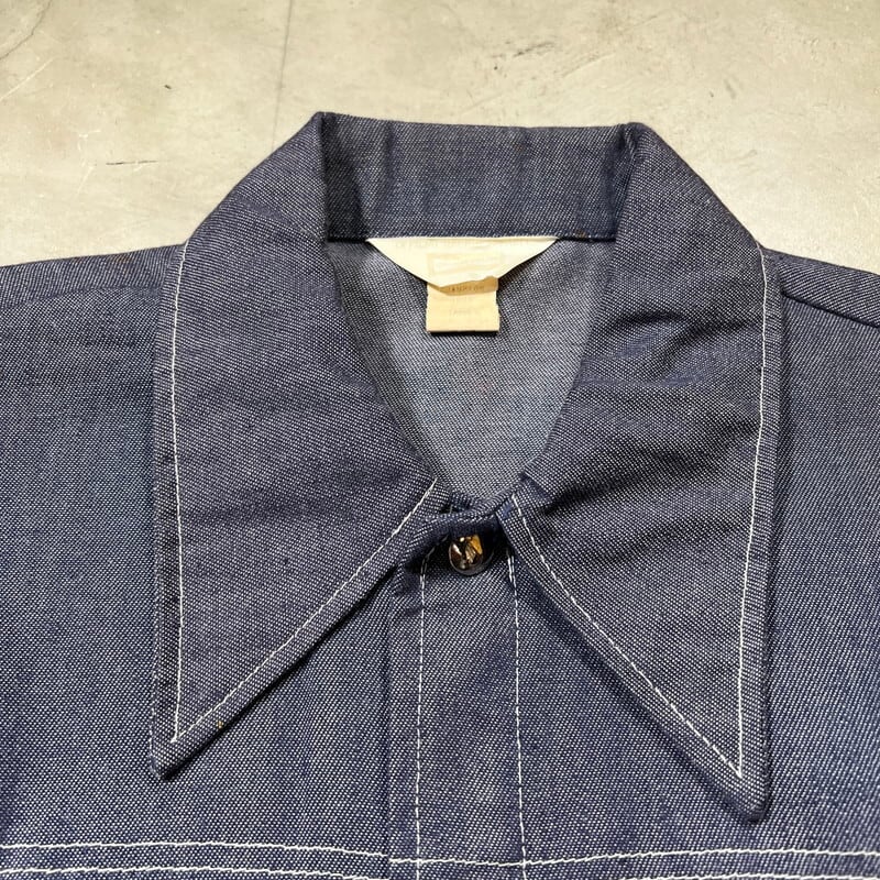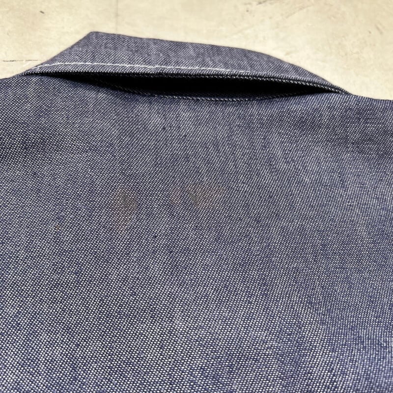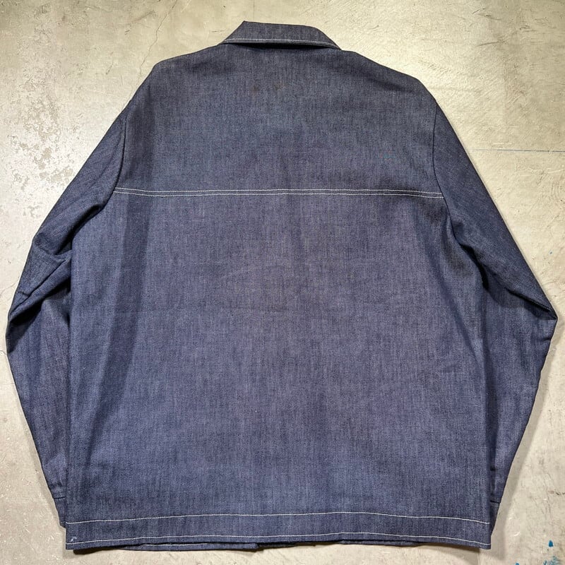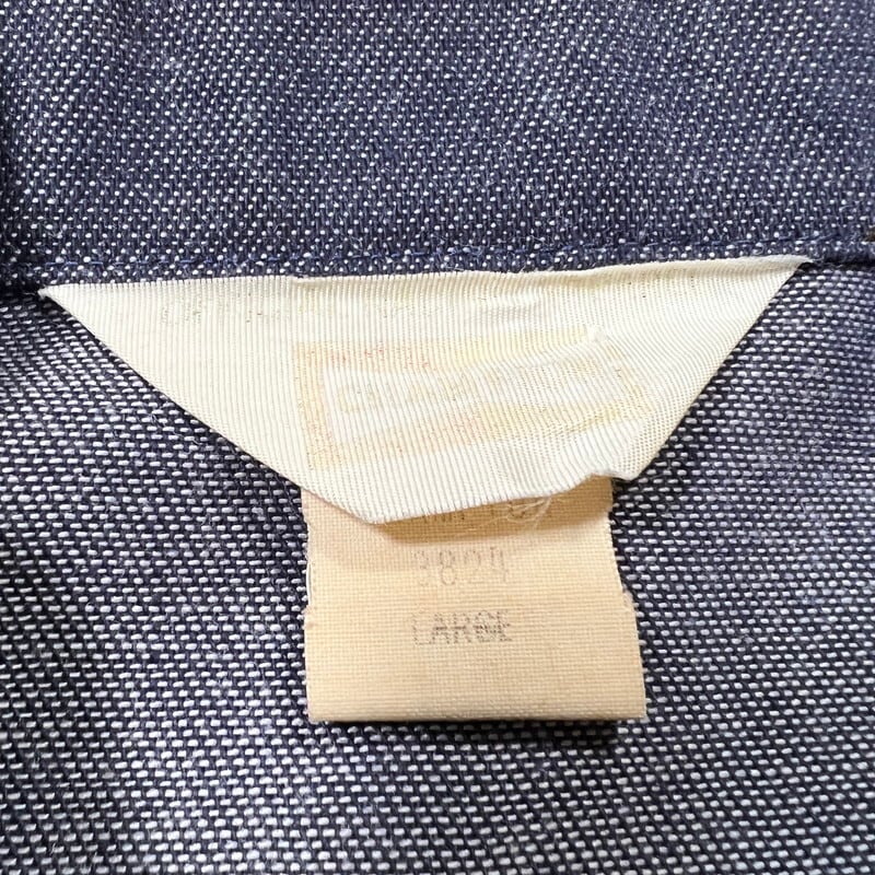 70年代頃のCHAMPION OFFICIAL RACING APPARELのデニムジャケットです。1907年アメリカボストンで設立された点火プラグを製造する会社です。ご紹介するこちらのアイテムはコットンポリのデニム地を使用したジャケットで、バットダイのようなグレーがかった色味をしています。元々は左胸に同社のワッペンが付いていたと思われますが、取り外された形跡がございます。左袖にはシガーポケットが備わっています。右胸ポケットに一部ステッチの縫い直しがございます。一部糸の継ぎ目や細かな毛玉等ございますが、目立つダメージや汚れはほとんど無く状態は良好だと思います。カバーオールとコーチジャケットを足したようなデザインで、シンプルながらも使い勝手の良いアイテムです。綿100%のデニムに比べ生地感は柔らかいのでストレスなく着用していただけます。Lサイズですので、需要が高いのではないでしょうか。車関連では人気の高くコレクターも多いブランドですので、お探しだった方は是非いかがでしょうか。