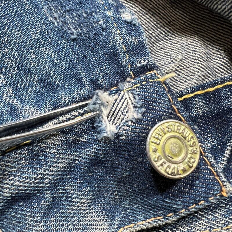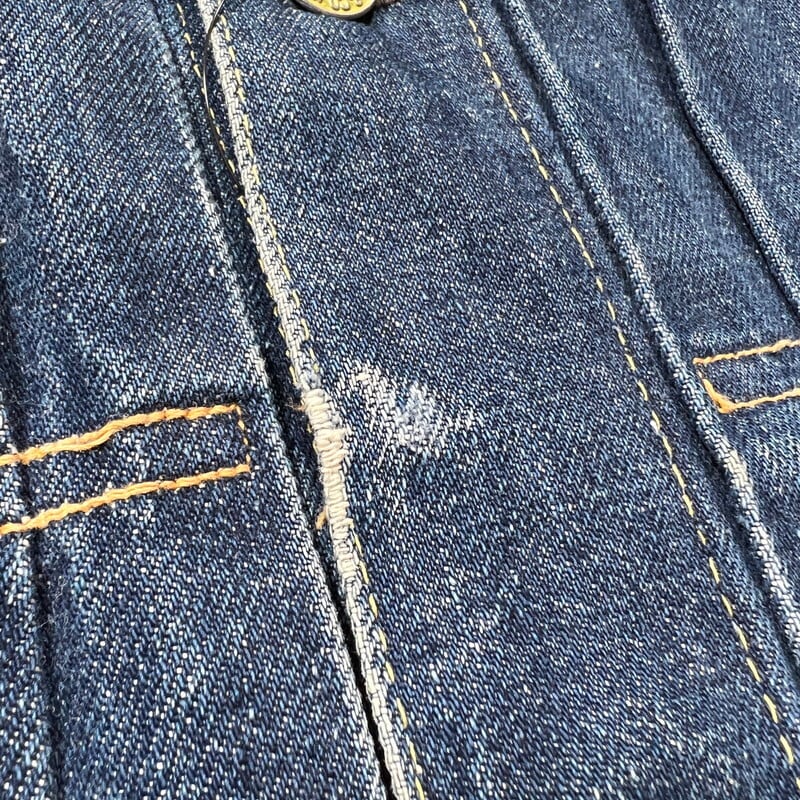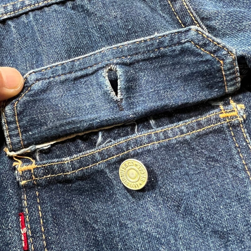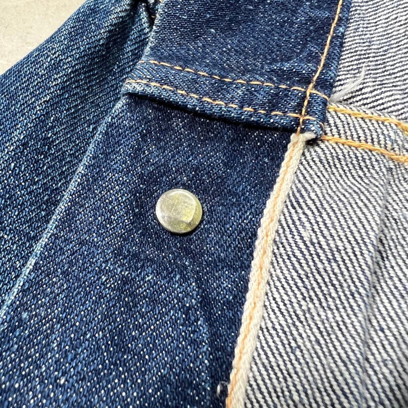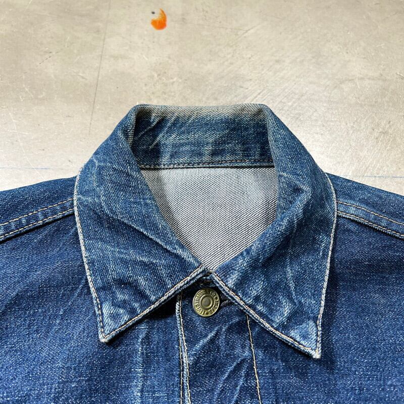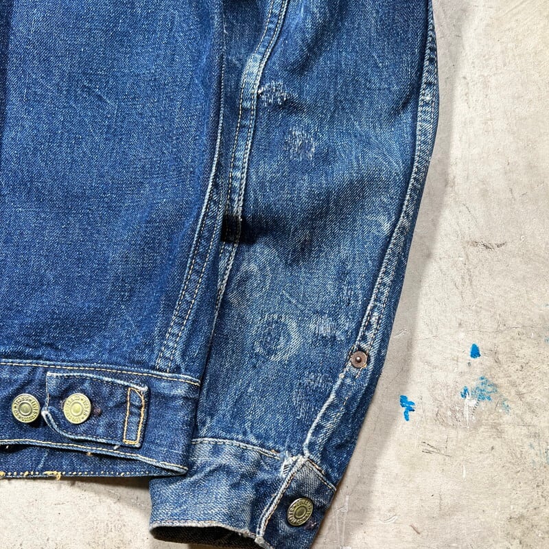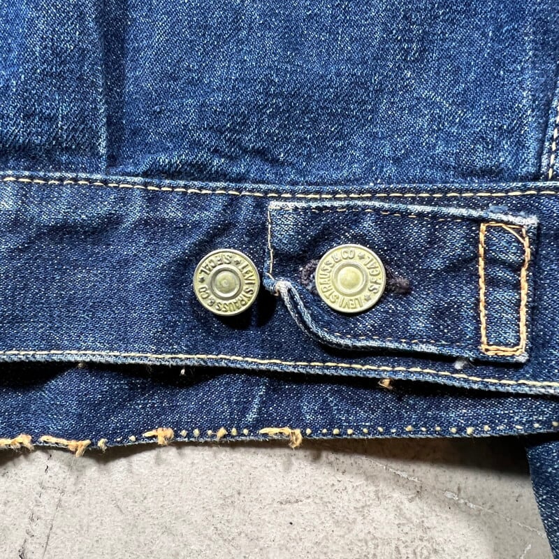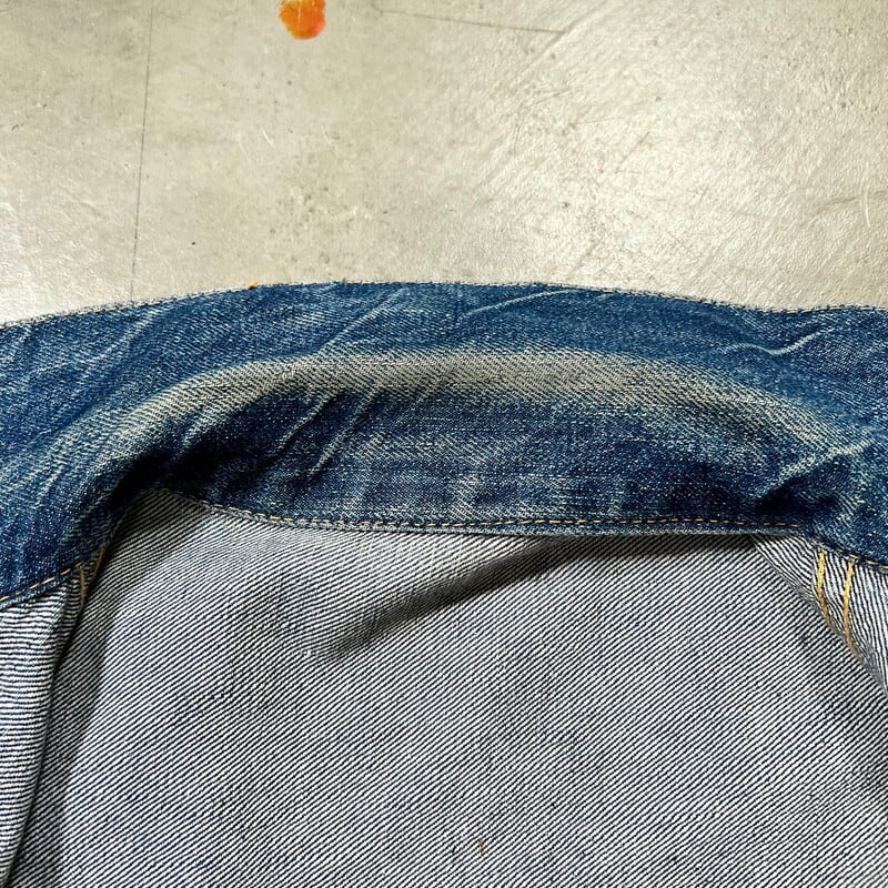 50年代のLEVI'S507XXデニムジャケットです。こちらもヴィンテージリーバイスの名作として名をはせた通称"2ndモデル”です。1952年頃からそれまでの506XXの後継として誕生したモデルで、胸ポケットが左右対称に付くデザインへと変更となりました、ご紹介するこちらは、両面赤タブBig E、均等V、フラップ裏ライトオンス、鉄製リベット、刻印17。セカンドモデルとしては紙パッチのギャラ入り中期頃のモデルだと思われます。6~7割色が残りまだ濃さを感じる希少な1着です。襟元や袖の色落ちも雰囲気が有り非常に魅力的な色合いです。右袖や左脇付近に小さなタタキがいくつかございますが、致命的なダメージでは無く小さなダメージが広がる前にリペアで塞いだという感じなので、長くお使いいただけると思います。右袖のボタン付近の生地に1cm四方のダメージが見られますが、こちらもリペアしていただくと目立たなくなると思います。細かなリペアはがあり、裾のステッチ飛びも見られますが、全体的にはかなりコンディションが良いと思います。サイズは前回出品していたセカンドよりも一回りは大きく、恐らくですが表記40の縮み38位のグッドサイズです。今後もさらに価格は高くなると思われますし、色が濃いめでサイズが良いものはどんどん枯渇していくと予想されますので、お探しだった方は是非この機会にいかがでしょうか。これから先の入荷はさらに厳しくなるであろうアイテムの一つです。