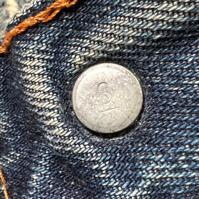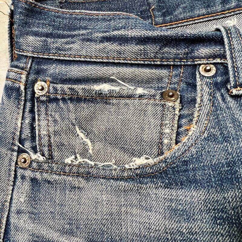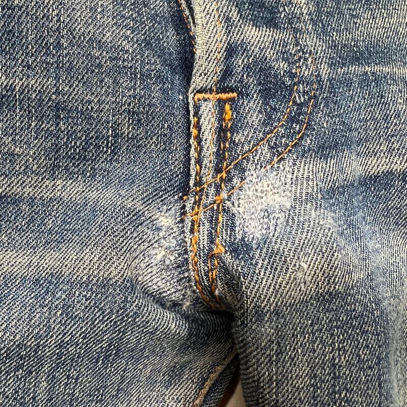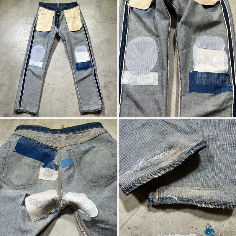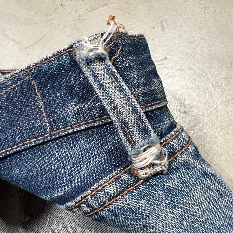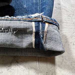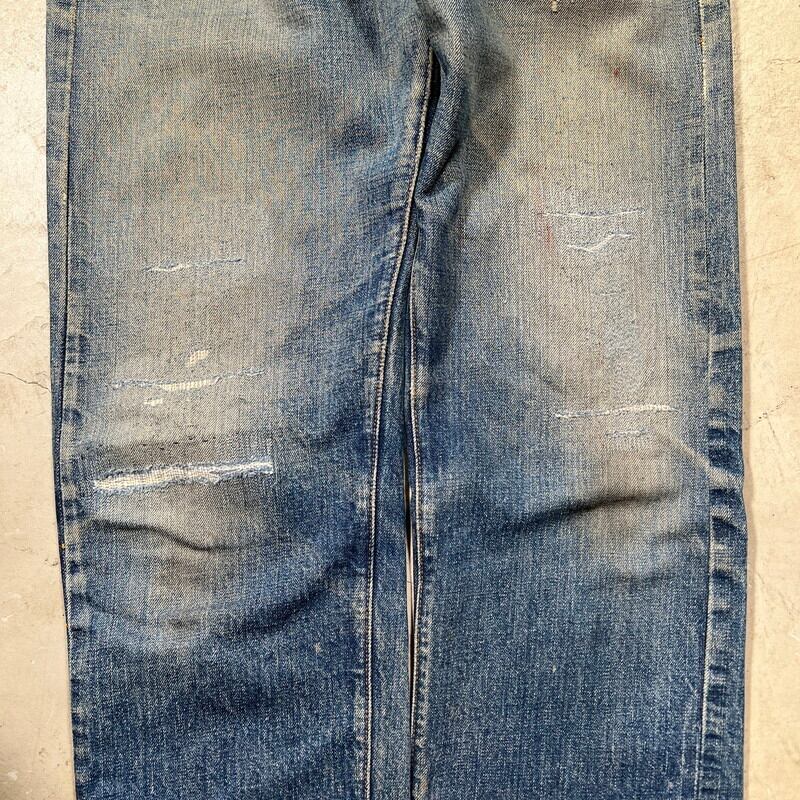 60年代から70年代頃のLEVI'S 501デニムパンツです。トップボタン裏刻印6、足長R、平行ステッチ、ウォッチポケット裏チェーン、バックポケット裏チェーン、セルヴィッジ裏両面シングル、赤タブBig E、不均等V。全体的にリペアが多く、ポケットや裾等にダメージも見られますが、色落ちのバランスは良くヴィンテージらしい1本です。ベルトループにもいくつかダメージがありますのでご購入後にまずリペアすることをオススメします。背面のダメージは大きいですが、全てリペアされています。気になる方は全て解いてリペアし直しても良いかもしれません。グランジ系ファッションがお好きな方はこのままのダメージカンをお楽しみいただけると思います。ウエストは実寸W30インチですので、男女共に着用しやすいサイズ感だと思います。色落ちやダメージ具合で存在感のある1本ですので、トップスは無地Teeだけで充分様になります。是非この夏の1軍に迎え入れてみてはいかがでしょうか。