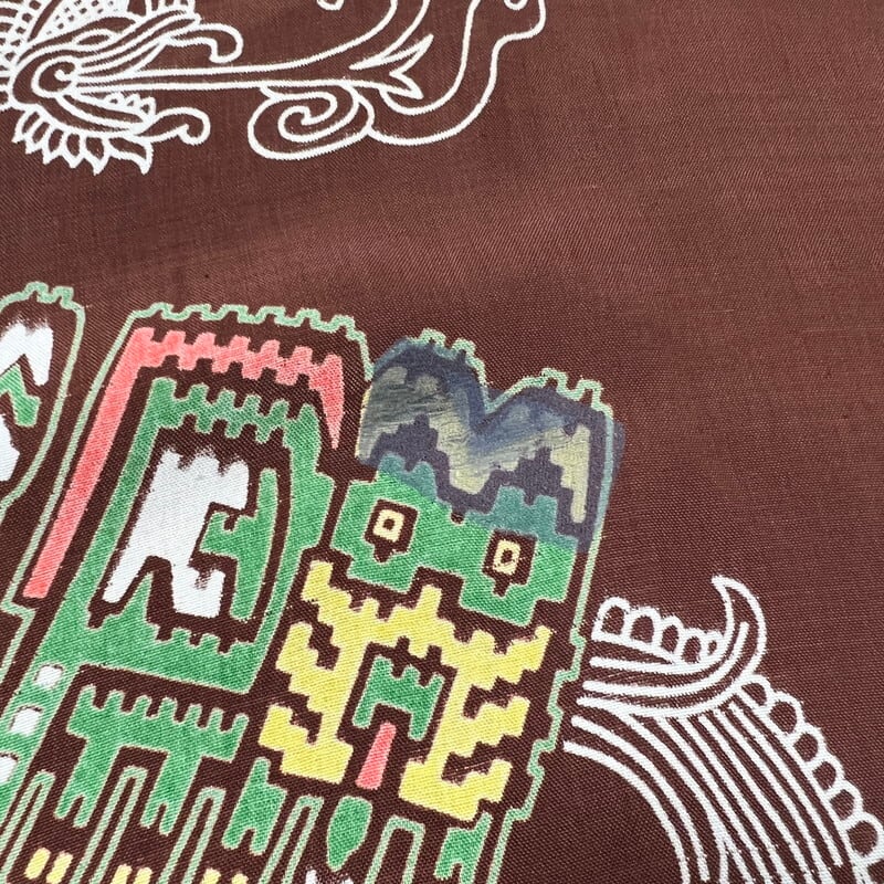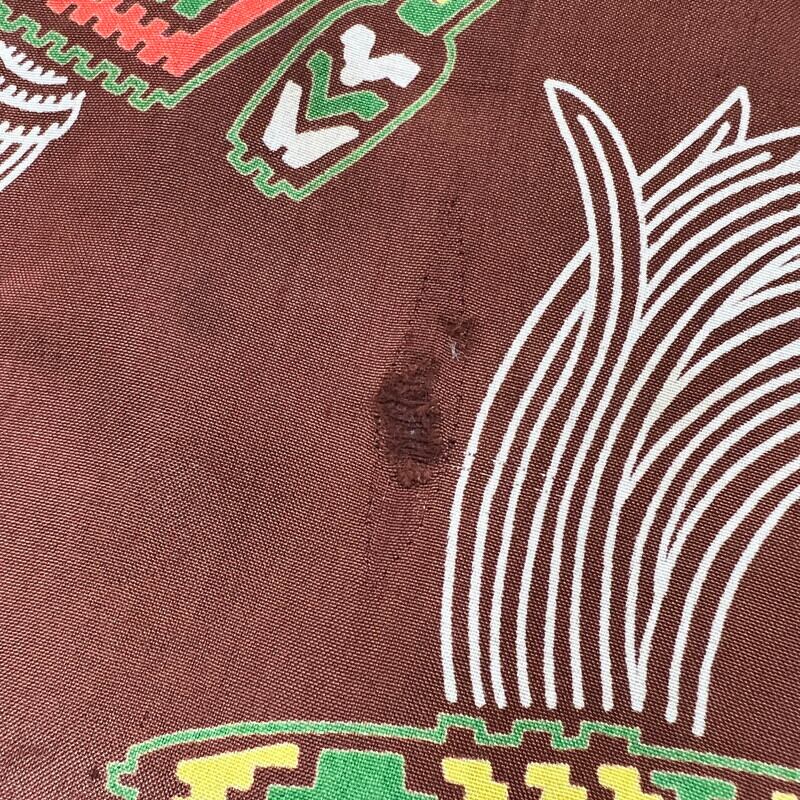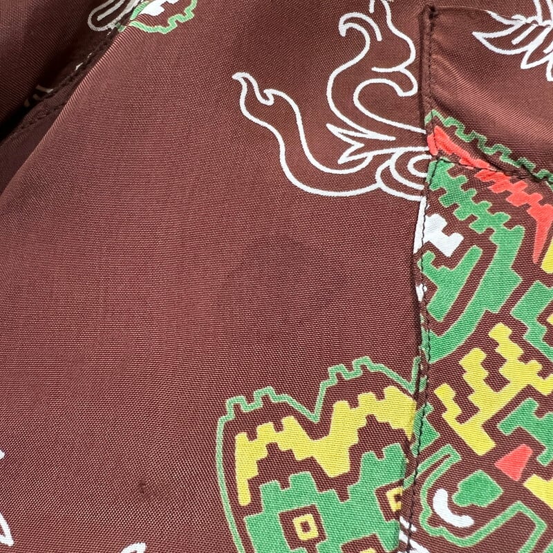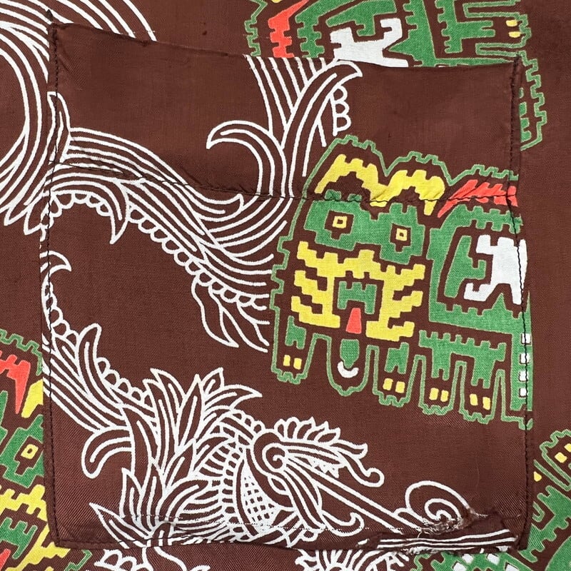 40年代から50年代初頭頃のBeau Brummelレーヨンハワイアンシャツです。Beau Brummelは1851年にJohn Barransとして設立され、イギリス紳士服の基準を創ったとされるジョージ・ブライアン・ブランメルの異名”Beau Brummel(伊達男のブランメル)”の名が冠されたアパレルブランドです。ご紹介するこちらは、ユーロブランドとは思えないポリネシアンなデザインで、デフォルメされた龍と虎のような動物が描かれています。ループボタン以外はココナッツボタンが使用されています。やや大振りな袋縫いの襟に、四角の胸ポケットが付きます。所々、小穴や擦れによるダメージが見られましたので、薄い接着芯で補強しています。左胸のポケット下部は元から当て布でリペアされていました。その他細かな擦れやシミ等ございます。リペアや補強が入りますが、ブラウンベースでとても雰囲気の良い個体です。Mサイズですので着れる方の多いサイズだと思います。ユーロブランド物のハワイアンシャツはなかなか見かけないと思いますので、デザインがお好きな方は是非いかがでしょうか。