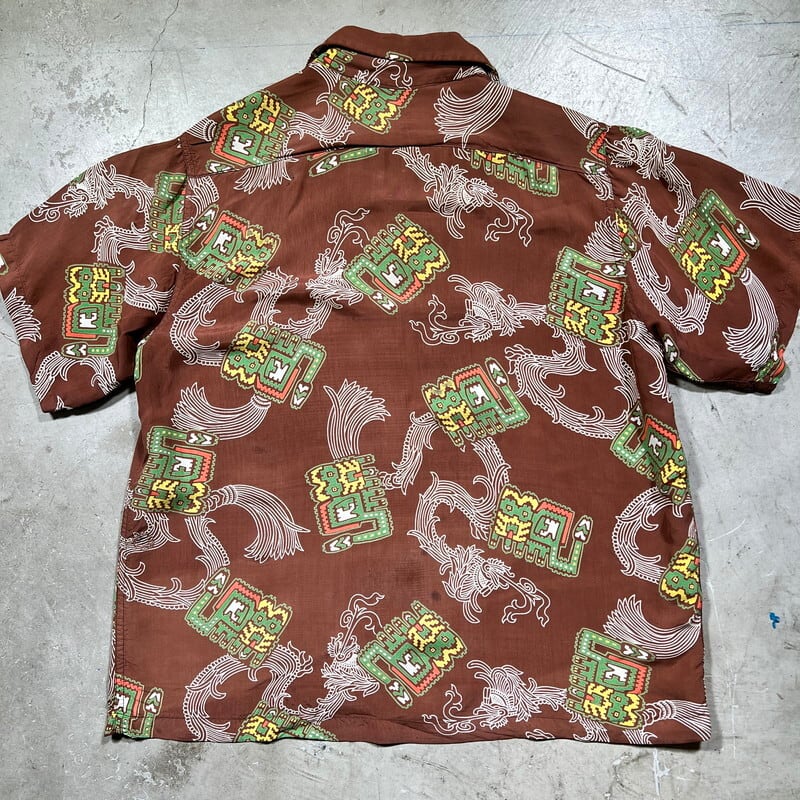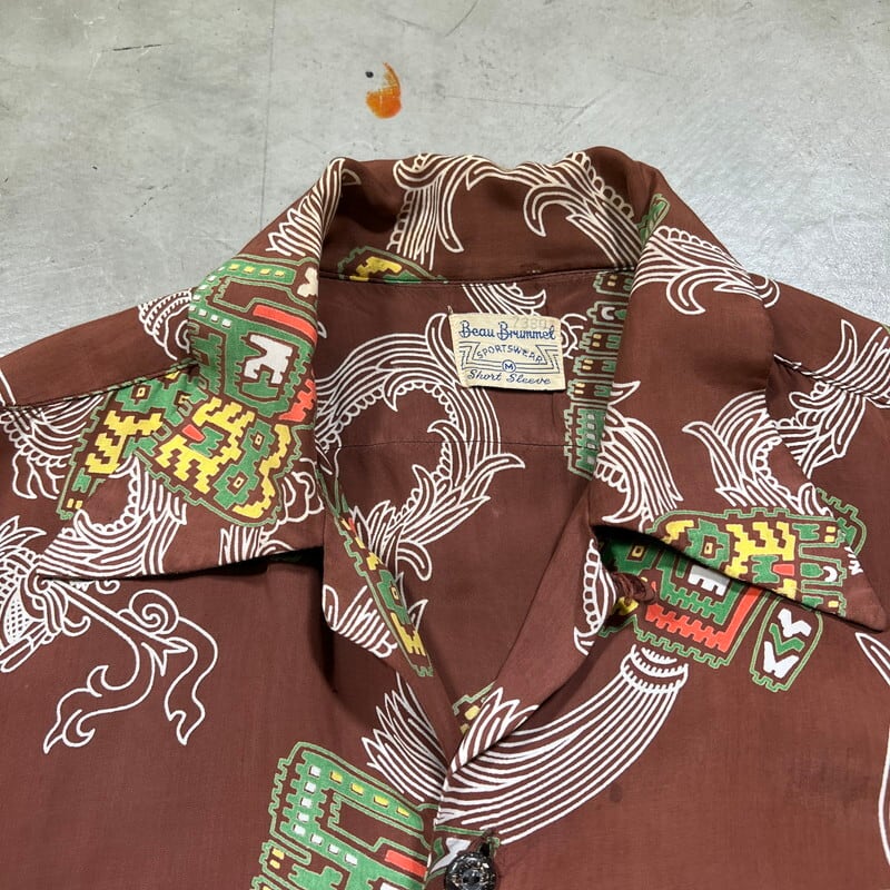 40's~ Beau Brummel SPORTSWEAR レーヨンハワイアンシャツ ブラウン 龍 虎 デフォルメ ココナッツボタン リペア有 Mサイズ 希少 ヴィンテージ BA-1923 RM2342H