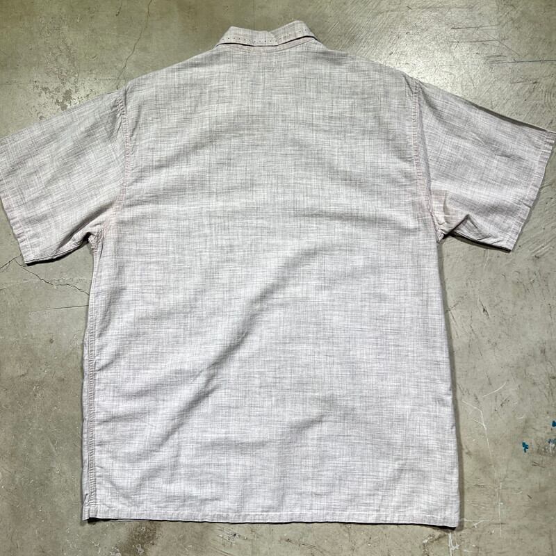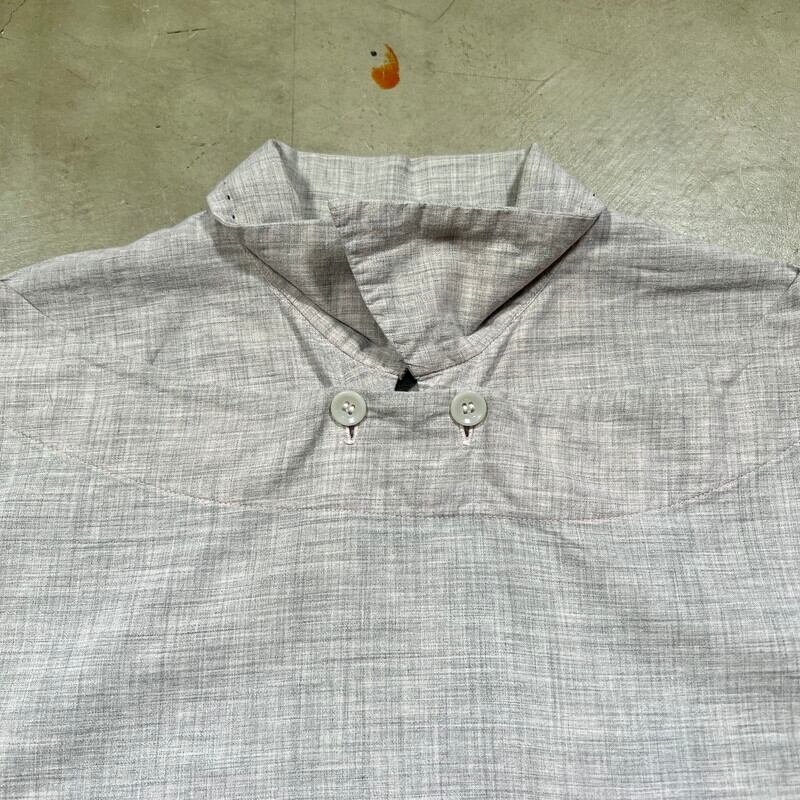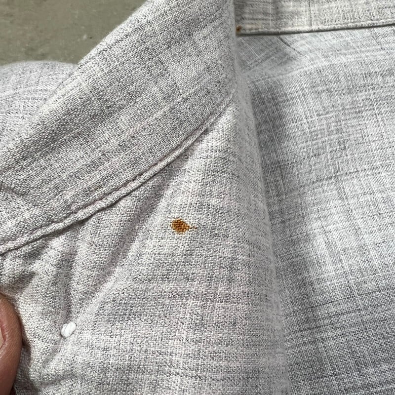 50年代頃のENSENADAピーターパンシャツです。ENSENADAは1898年イリノイ州シカゴで創業したReliance Manufacturing Company社が展開していたブランドで、ワークシャツで有名なBIG YANKも同社が展開していた事で知られます。ご紹介するこちらのアイテムは、首元が非常に印象的なデザインで、肩まで広がった襟ぐりをフロント2カ所のボタンで固定するプルオーバータイプの通称”ピーターパンシャツ”と呼ばれるデザインです。1900年代初頭から1920年代頃に無声映画等で演じられた際の衣装は、現在描かれているスキッパーのようなトップスでは無く、プルオーバーもしくはサイドオープンタイプでその上からつけ襟を着用したようなデザインとなっており、フロントが開閉しないデザインが酷似している為そう呼ばれるようになったのかもしれません。1970年代初頭に日本で発売された子供向けの童話集のピーターパンも上記に似たトップスで描かれています。このシャツの実際の名称は良く分かりません。。商品詳細に戻りますが、襟は袋縫いで、ステッチによる装飾がございます。写真ではかなり分かりづらいですが薄いピンクグレーのようなお色で、絣柄が入るコットン生地が使われています。非常にシンプルですが、50年代のロカビリーテイストも感じるお品です。襟の内側に小さなシミがあり、うっすらとですが、脇に若干の変色があります。その他目立つ汚れやダメージは無くコンディションは良好です。Mサイズ表記ですが、身幅もあり良いサイズ感だと思います。ピーターパンシャツ自体なかなか見かけないですが、コットンの絣柄はなかなか出ないと思います。少し変わり種で特徴的なシャツですが使い易いアイテムだと思いますので、お探しだった方やロカビリーカルチャーがお好きな方は是非この機会にいかがでしょうか。