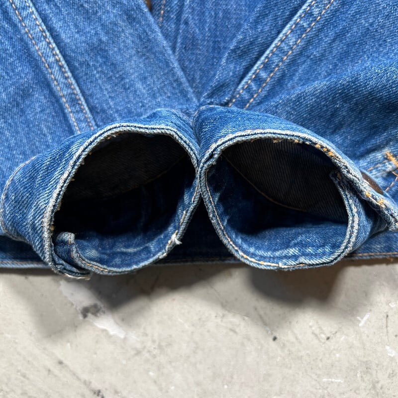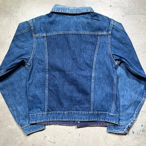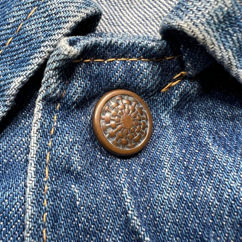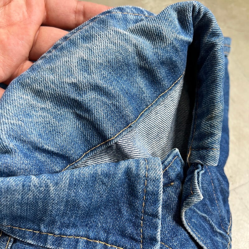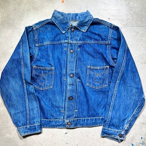60年代頃のUnknownデニムジャケットです。タグ等欠損していますので、ブランド等は不明ですが、恐らくストアブランド物かと思われます。ボタンはスナップ式で、リーバイスのセカンドモデルのように左右にプリーツが入るタイプです。ポケットにはモンゴメリーワードなどでも見かけるステッチが入ります。リベットは使われておらず、閂留めで縫製されています。見返り部分にはセルヴィッジが付きます。腰帯裏地にはバットダイデニムが使用されています。色残りは5~6割程度で首元に色落ちが見られますが、ダメージは無くコンディションは良好だと思います。サイズ表記はございませんが、36-38程度で、やや小さめなサイズです。この手のジャケットも見つかりづらくなってきましたのでサイズ感が合う方は是非この機会にいかがでしょうか。