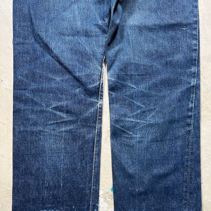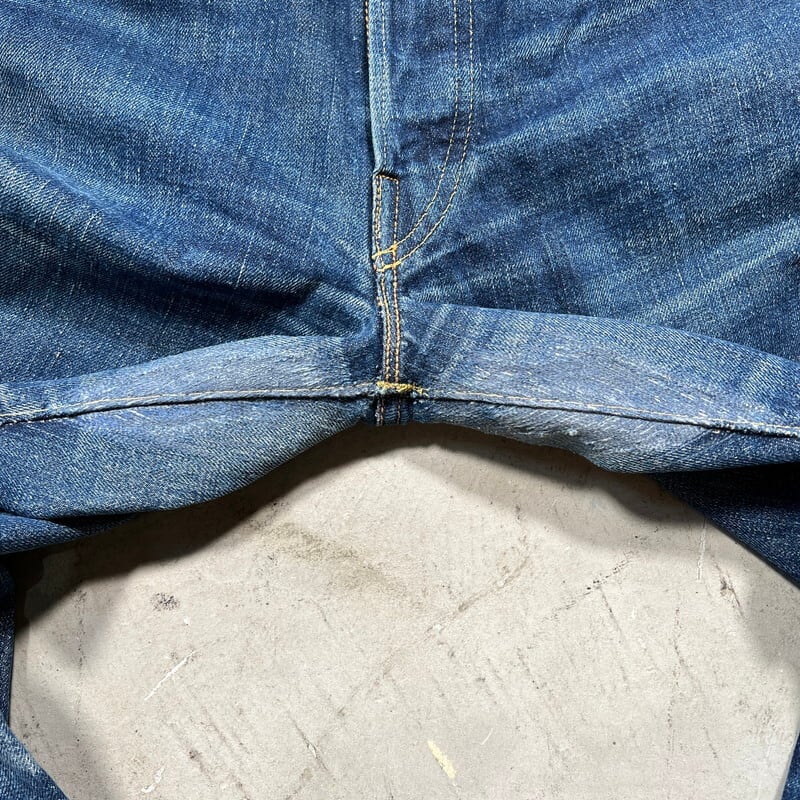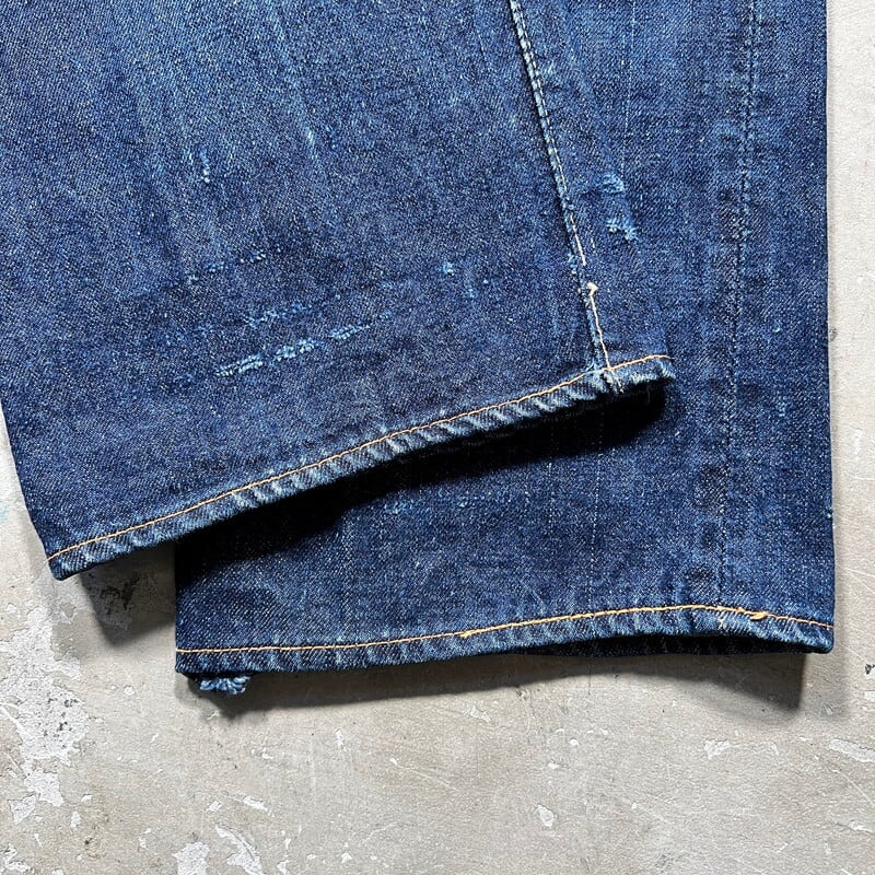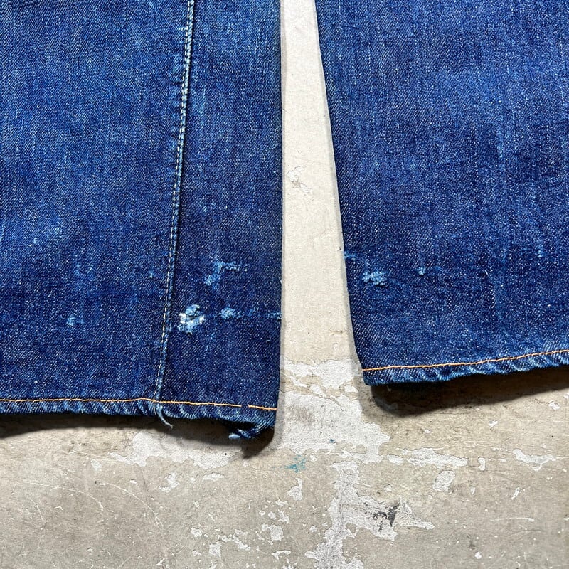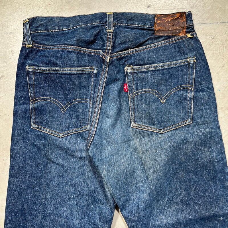 50年代のLEVI'S 501XXデニムパンツです。トップボタン裏刻印16、フロントVステッチ、銅リベット、隠しリベット、ウォッチポケット裏シングル、革パッチ付属、両面赤タブ、Big E、均等V。片面タブから両面タブへと移行する1952年から1953年頃の過渡期モデルだと思われます。フライボタンは通常Rで、ボツボツが無いフラットタイプ。磁石に反応しない銅リベットが使用されています。サイドのステッチは短めです。ベルトループはイエローとオレンジの糸で縫製されています。背面はセンターセット仕様で、ベルトループ幅は約12mmです。右サイドのベルトループが欠損しています。色味もまだまだ濃いめで、ヒゲやハチノスが入るメリハリのある色落ちをしています。内股にリペアがありますが、丁寧に施されています。ロールアップ跡のような細かなダメージがいくつかございます。欠損しがちな革パッチは奇跡的に残っており、やや割れはあるもののガチガチに硬化しきっていない状態です。タタキや細かなダメージはありますが、ここまで色残りがあり、ヒゲやハチノスが綺麗に入る個体はなかなか出会わないと思います。革パッチも残り、16番工場というのもヴィンテージリーバイスファンなら溜まらないディティールなのかなと思います。ウエストは実寸でW30インチです。着用はもちろんですが、コレクションとしても申し分ない迫力です。是非この機会にいかがでしょうか。