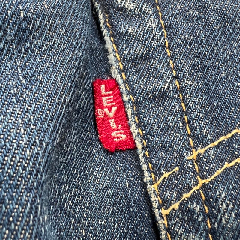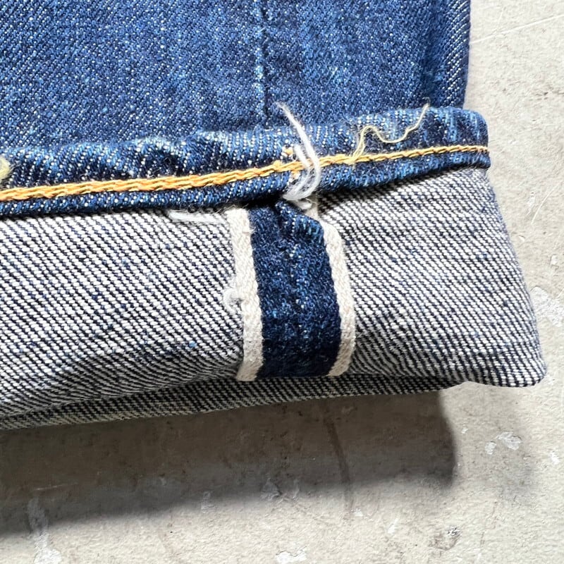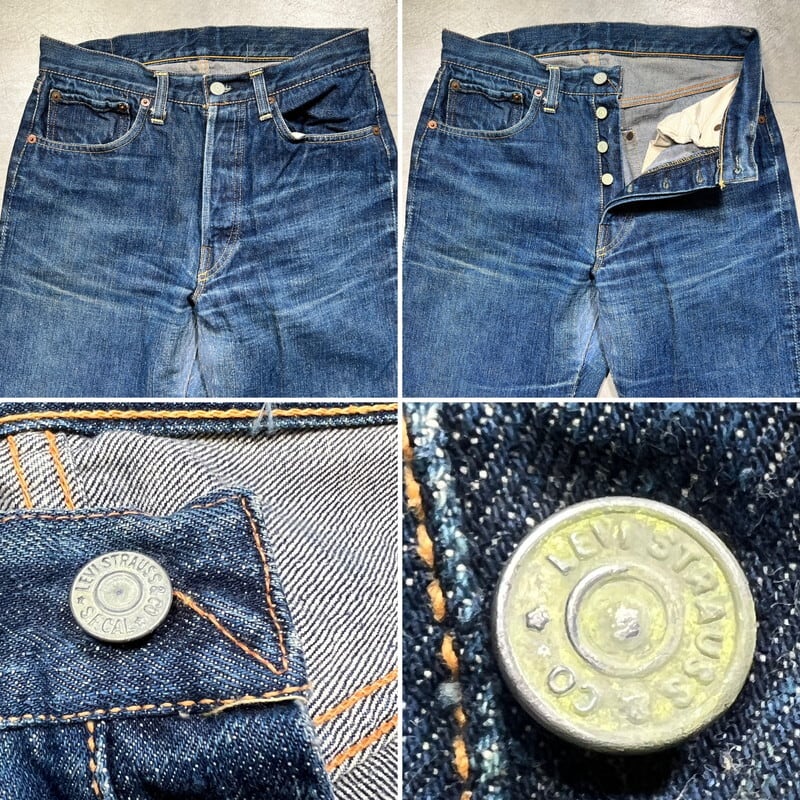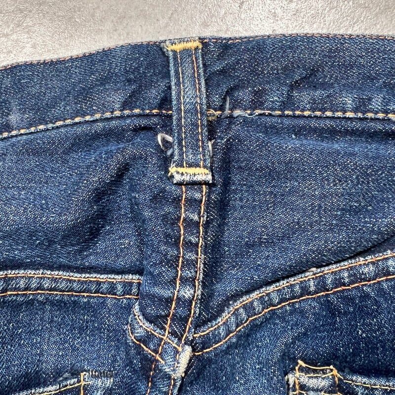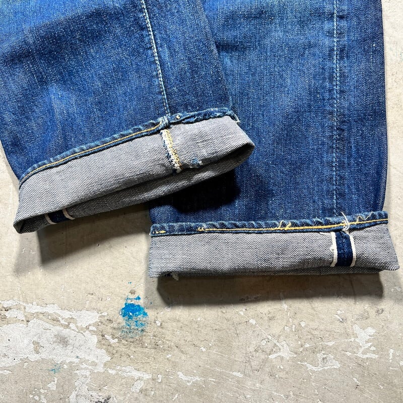 50年代のLEVI'S 501XXデニムパンツです。トップボタン裏刻印16、フロントVステッチ、銅リベット、隠しリベット、ウォッチポケット裏シングル、革パッチ付属、両面赤タブ、Big E、均等V。片面タブから両面タブへと移行する1952年から1953年頃の過渡期モデルだと思われます。フライボタンは通常Rで、ボツボツが無いフラットタイプ。磁石に反応しない銅リベットが使用されています。サイドのステッチは短めです。ベルトループはイエローとオレンジの糸で縫製されています。背面はセンターセット仕様で、ベルトループ幅は約12mmです。右サイドのベルトループが欠損しています。色味もまだまだ濃いめで、ヒゲやハチノスが入るメリハリのある色落ちをしています。内股にリペアがありますが、丁寧に施されています。ロールアップ跡のような細かなダメージがいくつかございます。欠損しがちな革パッチは奇跡的に残っており、やや割れはあるもののガチガチに硬化しきっていない状態です。タタキや細かなダメージはありますが、ここまで色残りがあり、ヒゲやハチノスが綺麗に入る個体はなかなか出会わないと思います。革パッチも残り、16番工場というのもヴィンテージリーバイスファンなら溜まらないディティールなのかなと思います。ウエストは実寸でW30インチです。着用はもちろんですが、コレクションとしても申し分ない迫力です。是非この機会にいかがでしょうか。