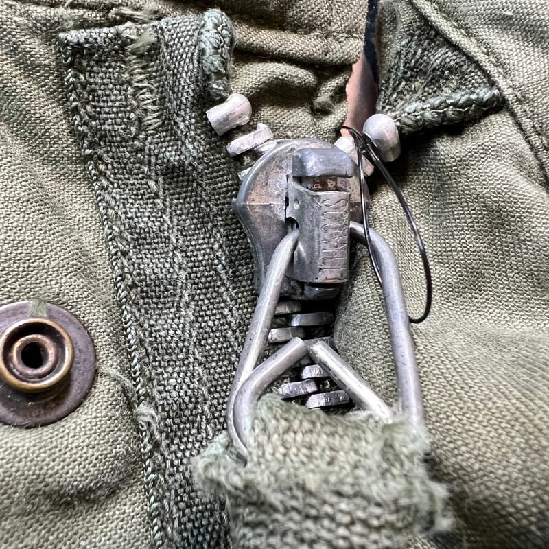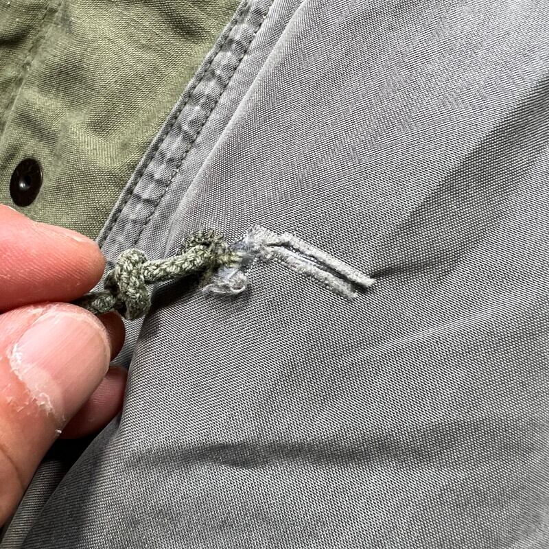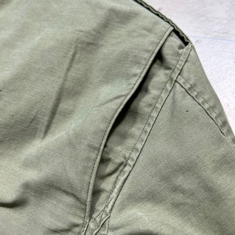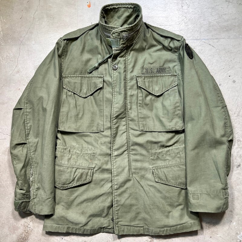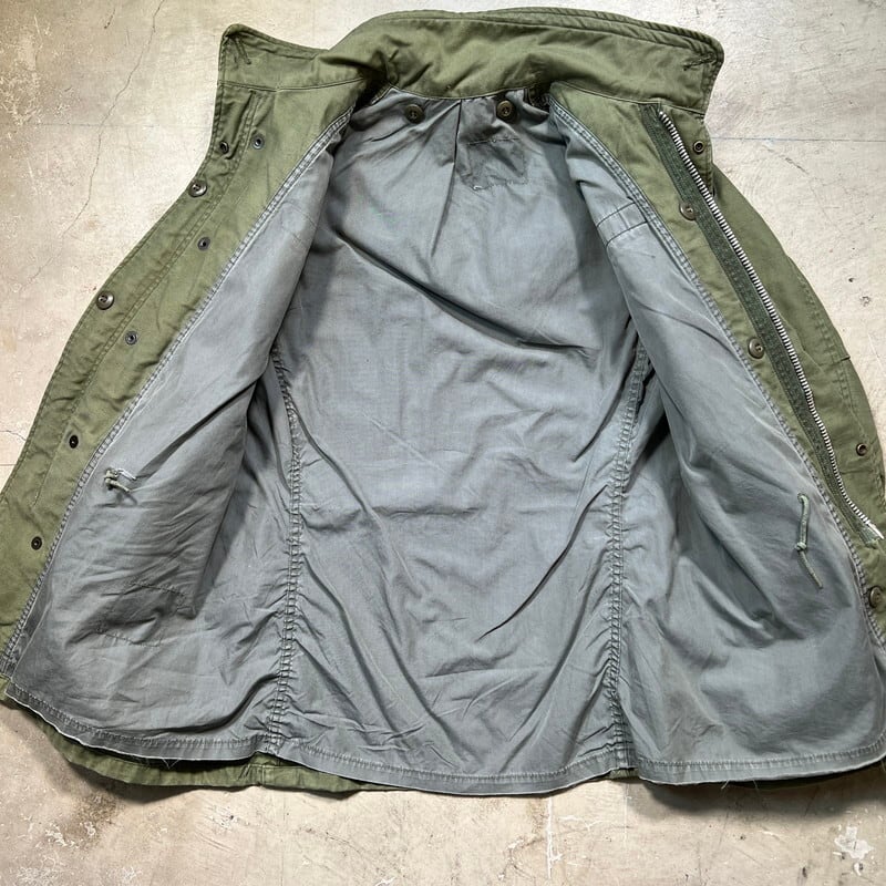 60年代のU.S.ARMY M-65フィールドジャケットです。アルミジッパーが採用された2ndモデルで希少なグレーライナー仕様です。内タグが欠損していますのでコントラクター等の詳細は不明ですが、恐らく1968年製造のモデルだと思われます。限られたコントラクターのみ製造していたとされ、通常のモデルに比べ非常に球数が少ないとされています。胸元にはU.S.ARMY、左腕には13th Sustainment Commandの部隊章が取り付けられています。フロントや袖、背面に汚れが見られます。ライニングの一部に小さな裂けがあった為裏側から薄い接着芯で補強しています。ライナーの裾に生地の擦り切れがございます。大きなダメージはございません。タグが欠損していますが、XSMALL-REGULARだと思われます。グレーライナーではなかなか出ないサイズだと思います。フィールドジャケットも価格が高騰傾向にあり、希少な2ndモデルのグレーライナーとなれば今後さらに見つかりづらくなると思われますので、サイズの合う方は必見のアイテムです。是非この機会にいかがでしょうか。