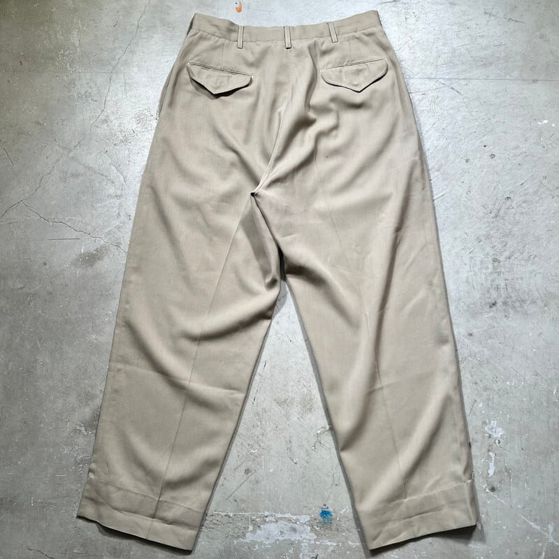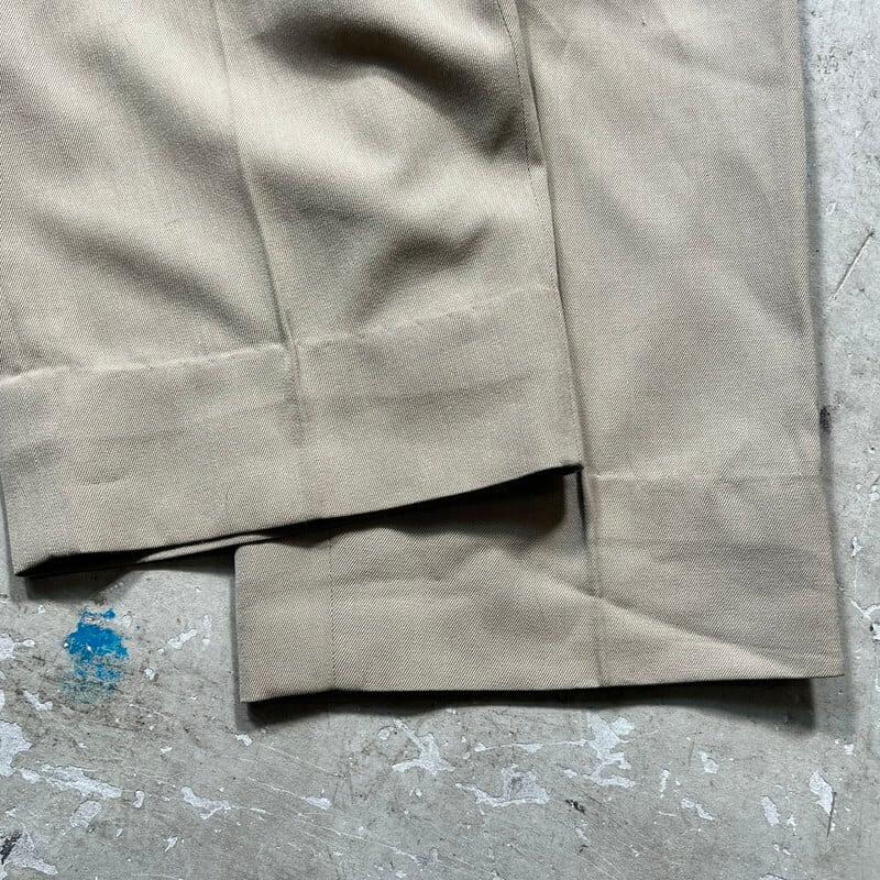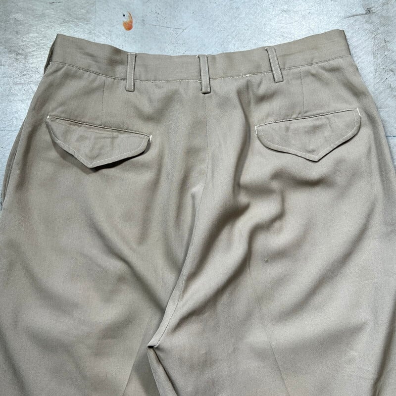 60年代頃のUSAF2タックオフィサーパンツです。タグにAIR MATERIEL COMMAND U.S.A.F.と記載があり、航空資材軍団のオフィサー等が着用していた物かもしれません。比較的薄手のウールのギャバジン織で作られています。フロントはアルミのTALONジッパーが採用されています。2タックが入り、ワタリもゆったりとしたワイドなシルエットが特徴です。背面の左ポケットのボタンが欠損していましたので、似たタイプのボタンを取り付けてております。レングスはオリジナルで、約7cm折り返して縫われていますので伸ばす事が出来ます。背面の右ポケット下に1ヵ所初糸が出ている箇所がございます。薄汚れ等はございますが、ダメージは特に無く状態は良好だと思います。ウエストは実寸W32インチです。ゆったりとしたシルエットが良いのでお勧めです。ウールですが厚手では無いので今の時期でも着用可能だと思います。ヴィンテージのアロハシャツを合わせてみてもカッコ良いので是非この機会にいかがでしょうか。