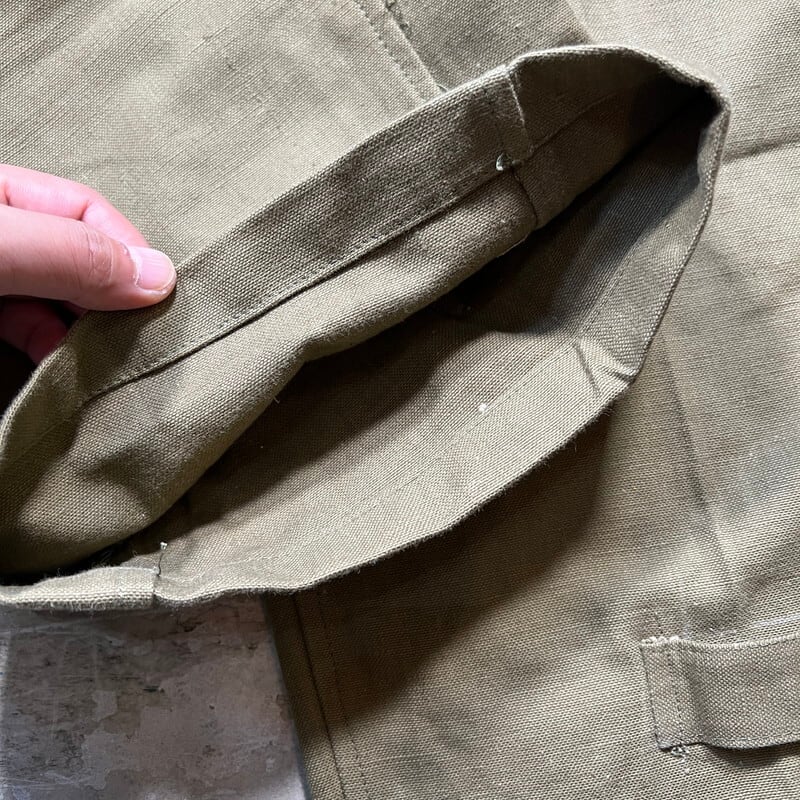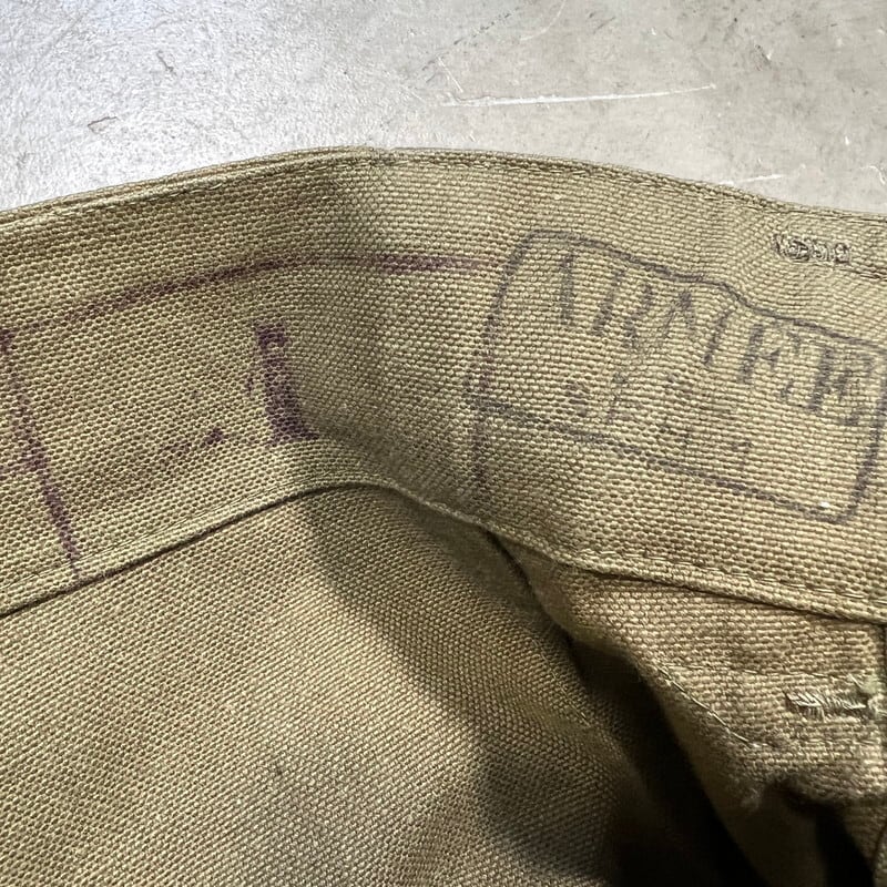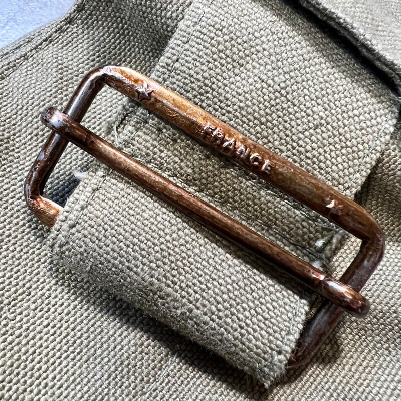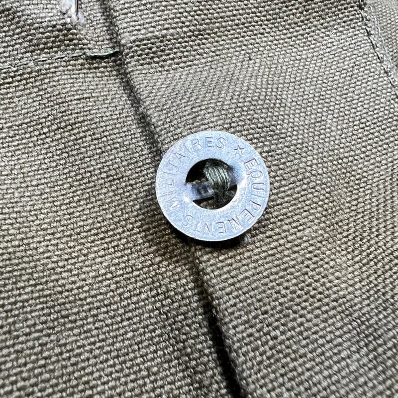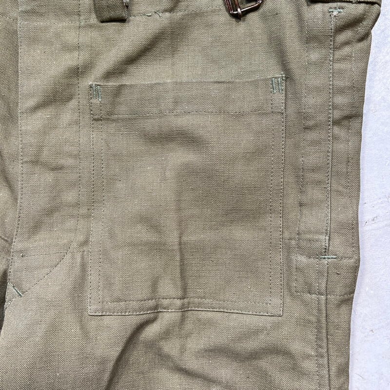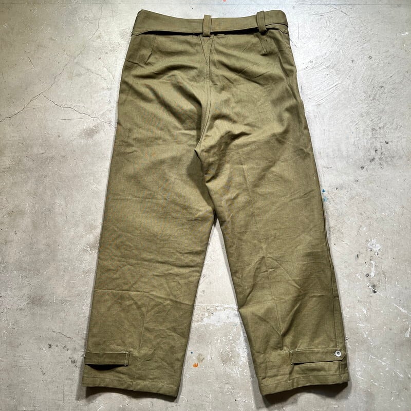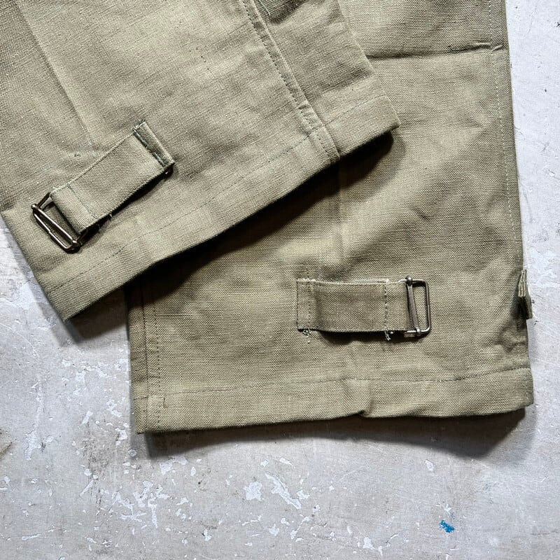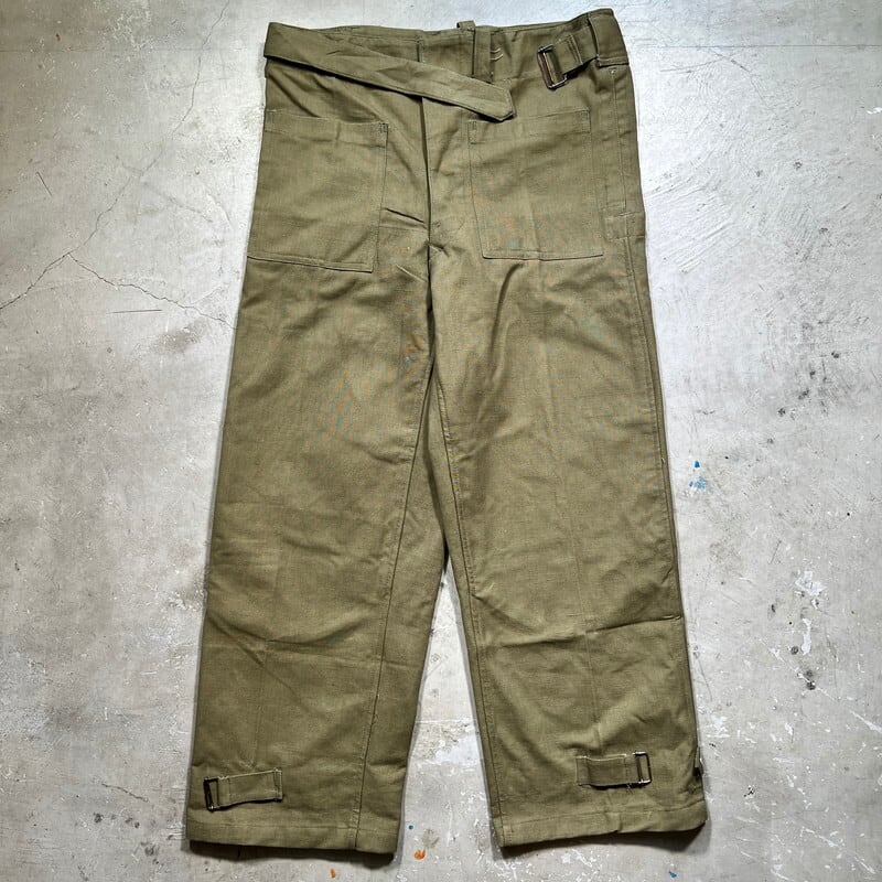 50年代頃のフランス軍M-38モーターサイクルパンツです。しっかりとしたコットンのキャンバス地で、フロントはフックにアルミボタン。無刻印のバックルが付く同素材のベルトで調整できます。裾にも絞れるストラップ付。マリンパンツのような四角いパッチポケット仕様の前期型で、バックにはポケットは付きません。前面内側は生地が2重でダブルニーとなっています。本来はバイクに乗る際に履いているパンツの上から着用するオーバーパンツですので、サイドから内側へ貫通したポケットがございますが、縫って閉じられています。必要であれば糸を解いていただくと本来の貫通式として使用できます。ウエスト内側にスタンプが押印されており、1952年モデルだと思います。畳みジワや僅かな汚れはございますが、ダメージ等無く、水にもあまり通っていないと思われるミントコンディションと言える1本です。近年の人気で注目度が一気に上がったフランス軍のモーターサイクルパンツですのでお探しの方も多いのではないでしょうか。サイズ表記は1で、W37位と前回ご紹介したアイテムに比べるとやや小さめですが、絞って穿くにはちょうど良いサイズ感だと思います。ゆったりとしたサイズ感がお好きな方は是非いかがでしょうか。