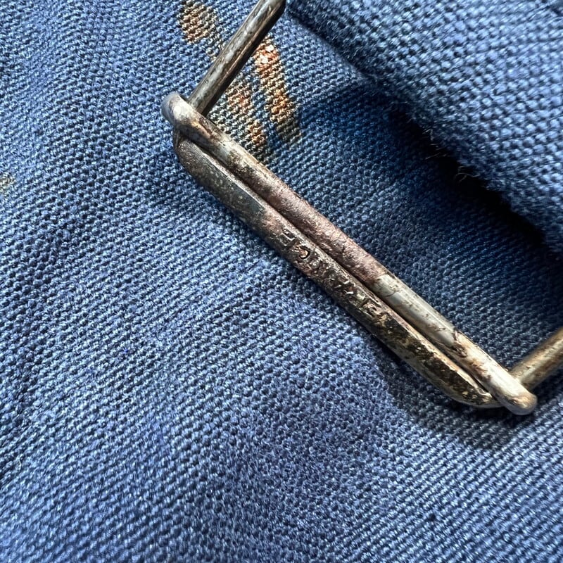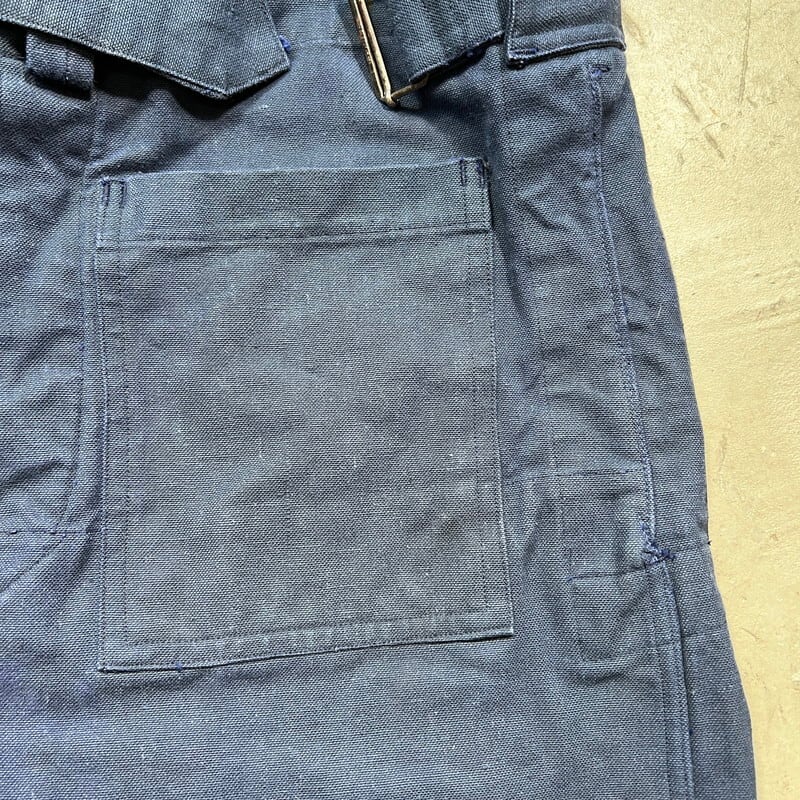 50年代頃のフランス軍M-38モーターサイクルパンツです。しっかりとしたコットンのキャンバス地で、フロントはフックにアルミボタン。無刻印のバックルが付く同素材のベルトで調整できます。裾にも絞れるストラップ付。マリンパンツのような四角いパッチポケット仕様の前期型で、バックにはポケットは付きません。前面内側は生地が2重でダブルニーとなっています。本来はバイクに乗る際に履いているパンツの上から着用するオーバーパンツですので、サイドから内側へ貫通したポケットがございますが、縫って閉じられています。必要であれば糸を解いていただくと本来の貫通式として使用できます。こちらは後染め加工されており、通常のモデルではあまり見ないネイビーカラーが特徴的です。ウエスト内側のスタンプは消えかかっていますので年式等は不明です。全体的にやや使用感があり、薄汚れや、フライボタンと裾にボタンの欠損がありましたので、古いシェルボタンを取り付けています。近年の人気で注目度が一気に上がったフランス軍のモーターサイクルパンツですのでお探しの方も多いのではないでしょうか。サイズ表記は確認できませんが実寸W38位です。ウエストをぎゅっと絞って穿くモデルなので、ゆったりとしたサイズ感がお好きな方は是非いかがでしょうか。