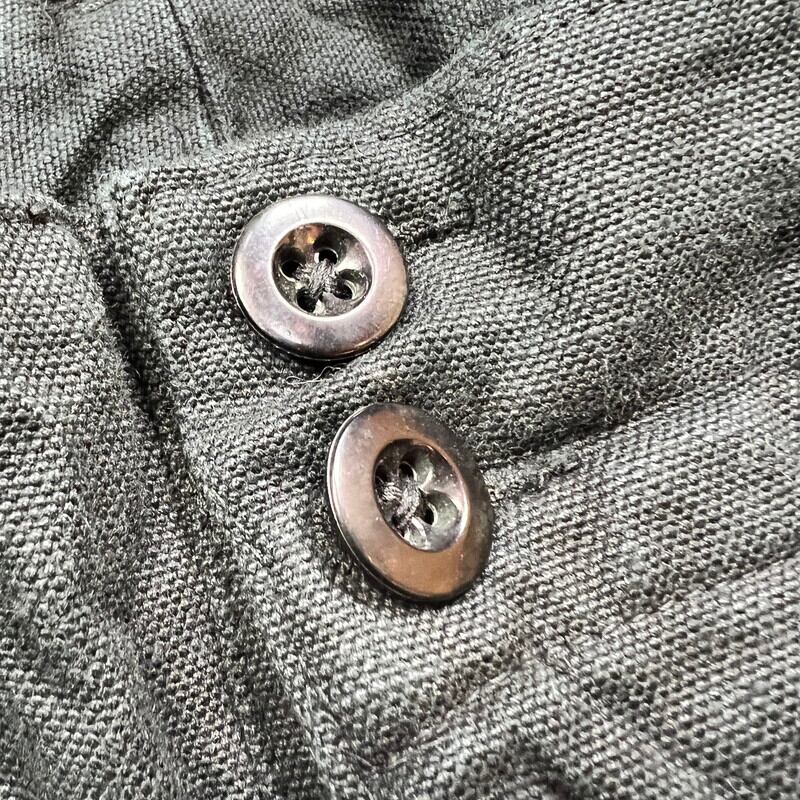50年代頃のフレンチアーミーM-38モーターサイクルパンツです。厚手でしっかりとしたコットン素材で、ブラックに後染めされています。M-38モーターサイクルコート(Pコートのようにボタンが配置されているタイプ)と上下で対となっているモデルです。フロントはバイク乗車時の防風対策としてエプロン仕様となっております。基本オーバーパンツでゆったりとしているので、ベルトループの無い代わりに縫い付けられているウエストベルトを締め上げて着用します。サイドのポケットは通常貫通式ですが、こちらの個体も開かないように縫い付けられています。糸を解けば元通り貫通式として使えます。後染め特有の色褪せや色むらがあり、背面に白っぽく汚れた箇所もございます。目立つダメージはございません。前掛けを垂らしてのコーディネートも楽しめます。サイズ表記は確認できませんが、ウエスト実寸W36インチ位です。オリジナルのオリーブカラーも良いですが、後染めだと雰囲気も変わり新鮮でオススメです。