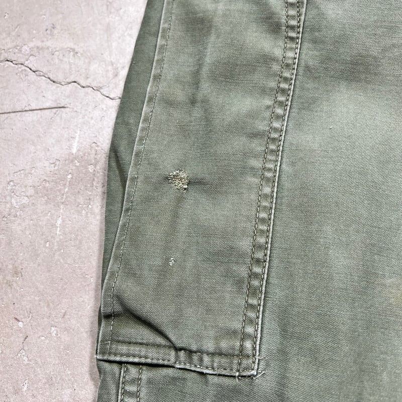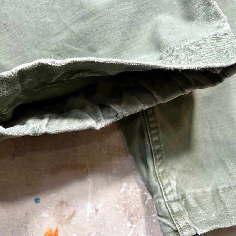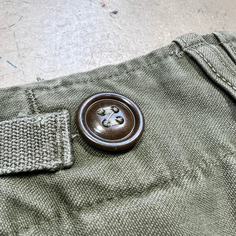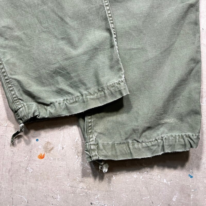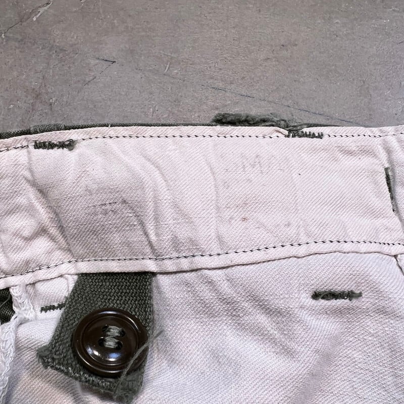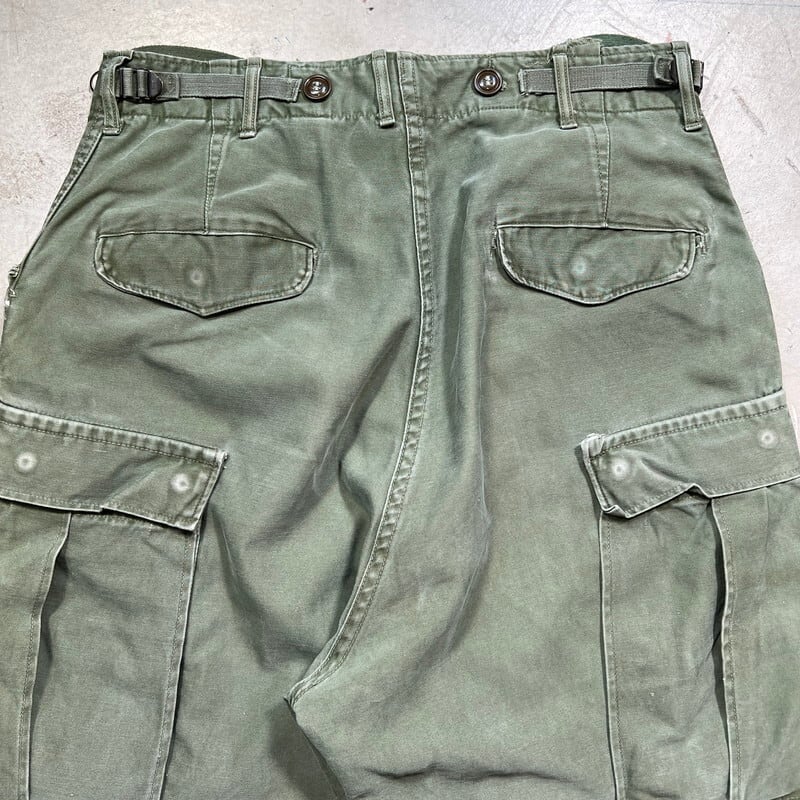 50年代のU.S.ARMY M-1951フィールドパンツです。内側の印字がほとんど消えかかっていますので、コントラクターやミルスペックは不明です。フロントはPRENTICEのブラスジッパーで、こげ茶の尿素ボタンが1つ欠損しています。全体的に使用感があり、コットン地ならではのフェード感が良い雰囲気の1本です。右腿と右のカーゴポケットに小さなリペアがございます。その他裾等に擦れたダメージなどございますが、生地はとてもしっかりとしていますので、ガンガン着用していただけます。サイズは恐らくSMALL REGULARで、アジャスターを伸ばした状態で実寸W32インチです。アジャスターをマックス絞ればウエストが細い方でも十分に着用できます。ゆったりとした特徴的なこのシルエットがお好きな方は多いと思います。フィールドパンツも徐々に高騰していますので、サイズが合う方は是非この機会にいかがでしょうか。