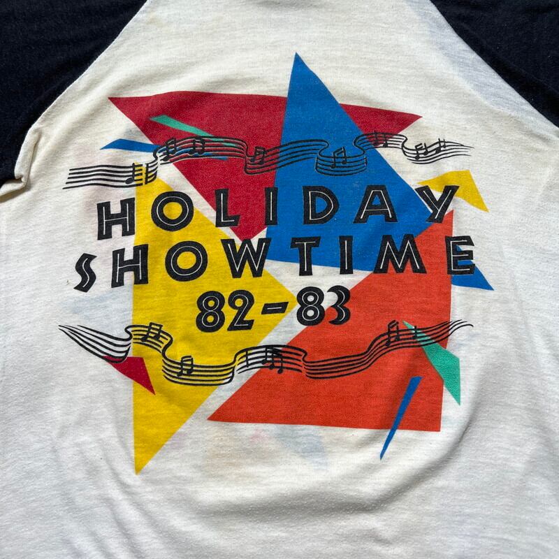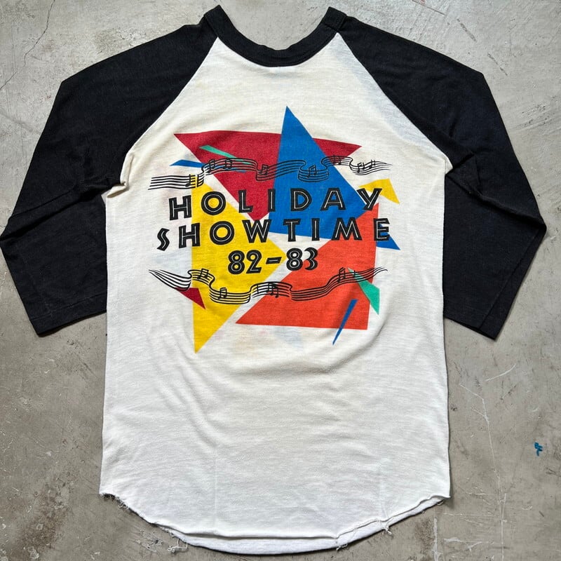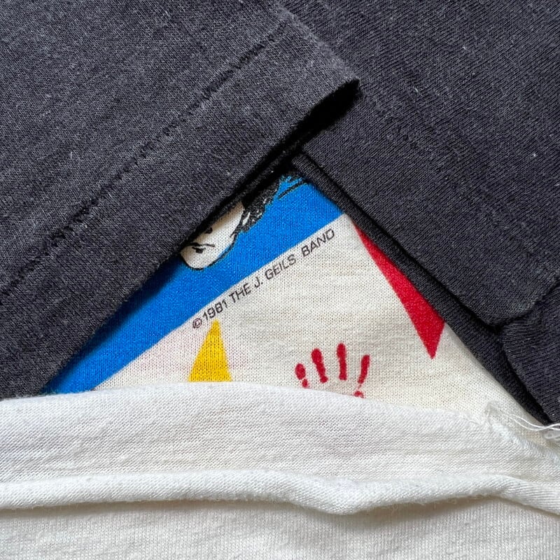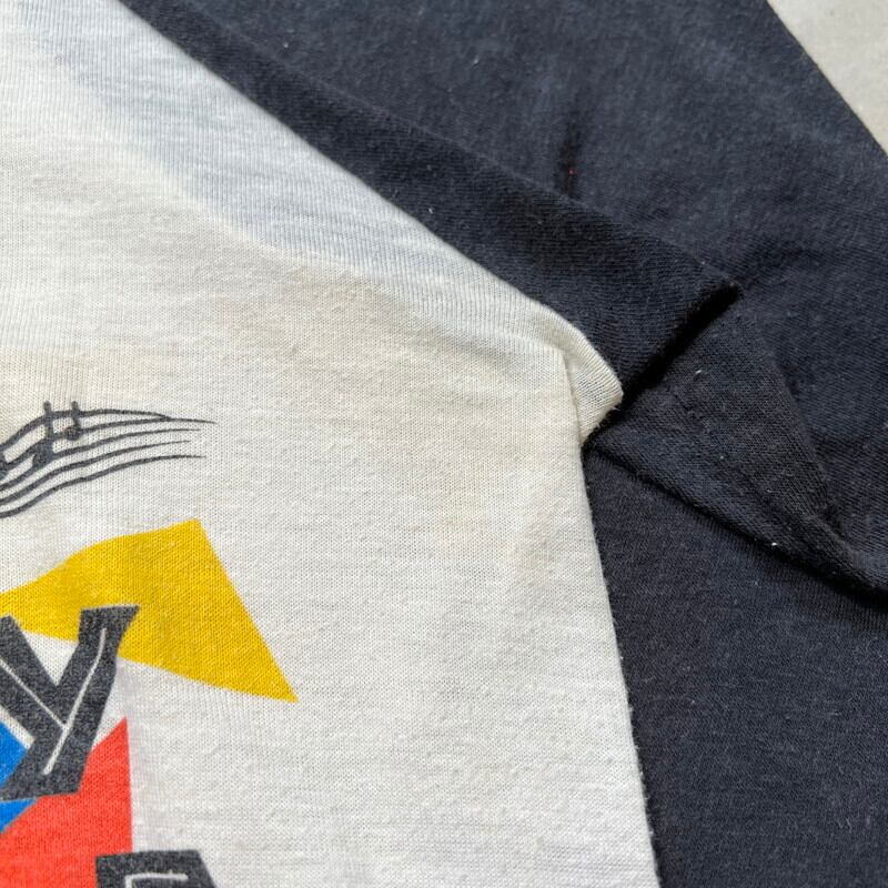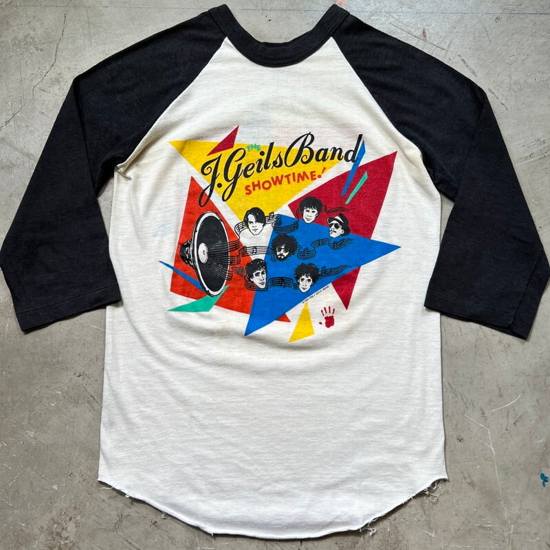 80年代のTHE J.Geils Band ”SHOW TIME"ラグランTeeです。1967年ボストンにて結成されたブルースロックバンドで、1982年に発売されたライブアルバムの#SHOW TIME!”ジャケットデザインのアイテムです。1982年9月4日にミシガン州クラークストンのパインノブミュージックシアターでのライブ音源が収録されてリリースされました。コピーライトは1981年なので、販促用に事前に作っていた物かもしれません。THE J.Geils Bandの楽曲は度々CM等で使用され、「Centerfold」という曲は一度は耳にしたことがあると思います。ポップでカラフルな色合いで、スピーカーから流れる音楽とメンバーの顔がプリントされています。袖はシングルステッチ、裾はラグランTeeで見られる篝縫いが施されています。全体的に色褪せや、黄ばみ、毛羽立ちが有り、うっすらとですが、脇に変色がございます。裾のステッチに一部ほつれが見られます。ボディはバンTeeで良く見られるGIANTのOEM生産等を請け負っていたTee Jaysで、USA製です。サイズはS表記ですが、やや小さめでXS相当です。男性よりは小柄な女性向けのサイズ感だと思います。白×黒のラグランにポップなカラーリングのプリントが映えるアイテムですので、お好きな方も多いのではないでしょうか。デニムにコンバースでシンプルに合わせてみてはいかがでしょうか。