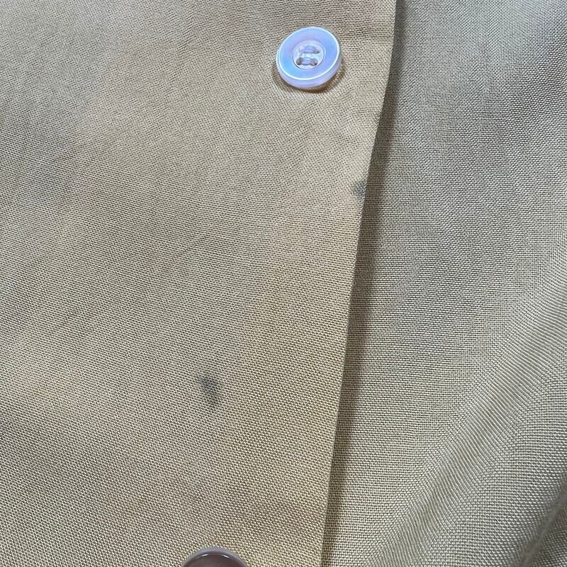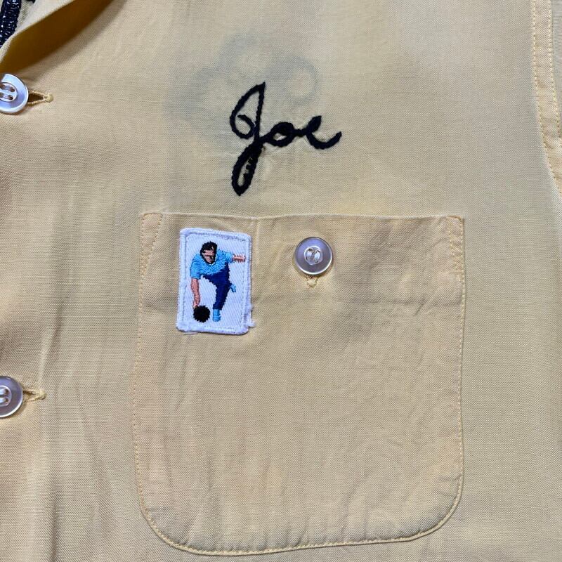 60年代頃のDon Carterボーリングシャツです。1950年代から1970年代初頭に活躍した伝説のボーラー「Don Carter」が1964年にボーリングメーカーのEboniteと契約を結び、当時ではアメリカのスポーツ史上初の$1,000,000プレーヤーとなりました。ご紹介するこちらのシャツは、Ebonite社が彼の名前を冠したブランドとして販売されたアイテムで、タグには彼のサインが刺繍されています。襟には芯が入りで、肩周りにはアクションプリーツの入らないプレーンなボックスシルエットです。胸元にはボーラーのワッペンとネーム、背面にはチェーンステッチが施されています。フロントに小さなペンキ飛びや、薄汚れ、ピンホールが見らえます。胸ポケットのボタン裏の生地にややダメージがあったので、接着芯で補強してからボタンを縫い直しています。背面のヨークにハンドステッチによるリペアがありますが、コンディションは悪くないと思います。サイズ表記はMです。イエローとブラックのコントラストが良く、デニムとの相性も抜群です。ボーリングシャツや、チェーンステッチがお好きな方は是非いかがでしょうか。