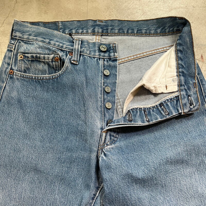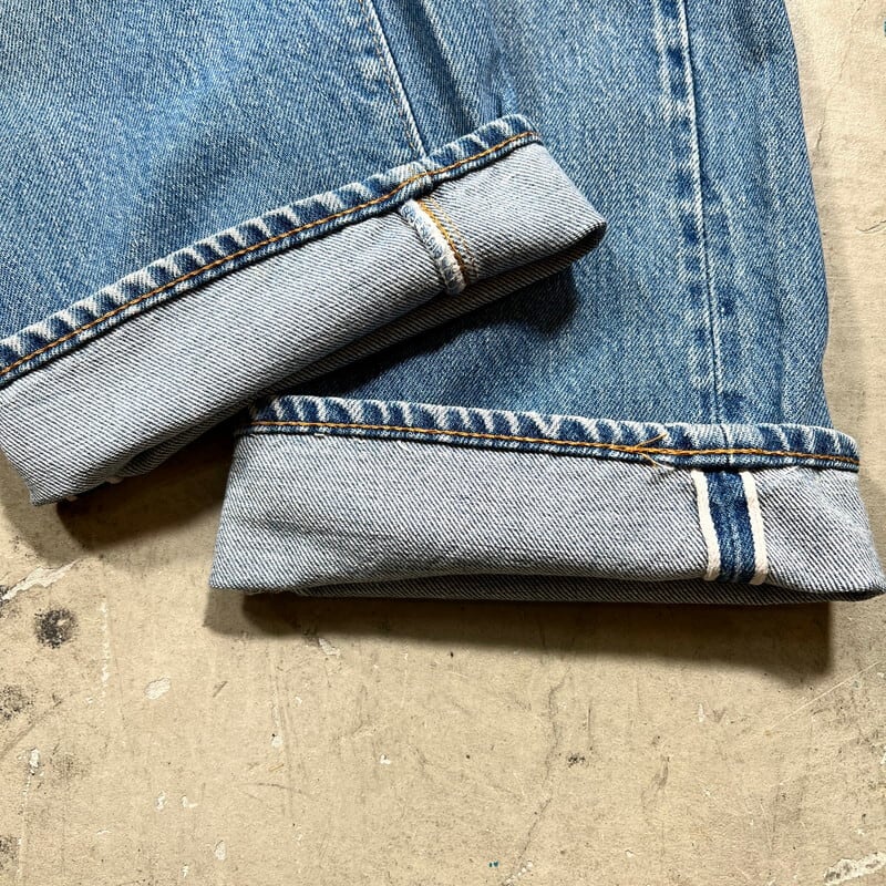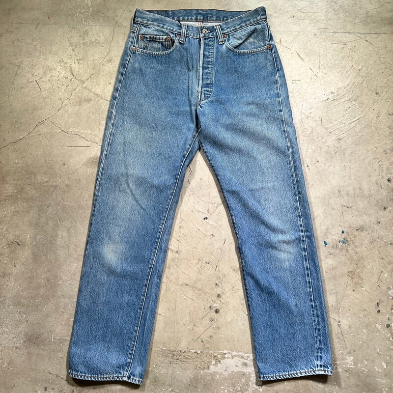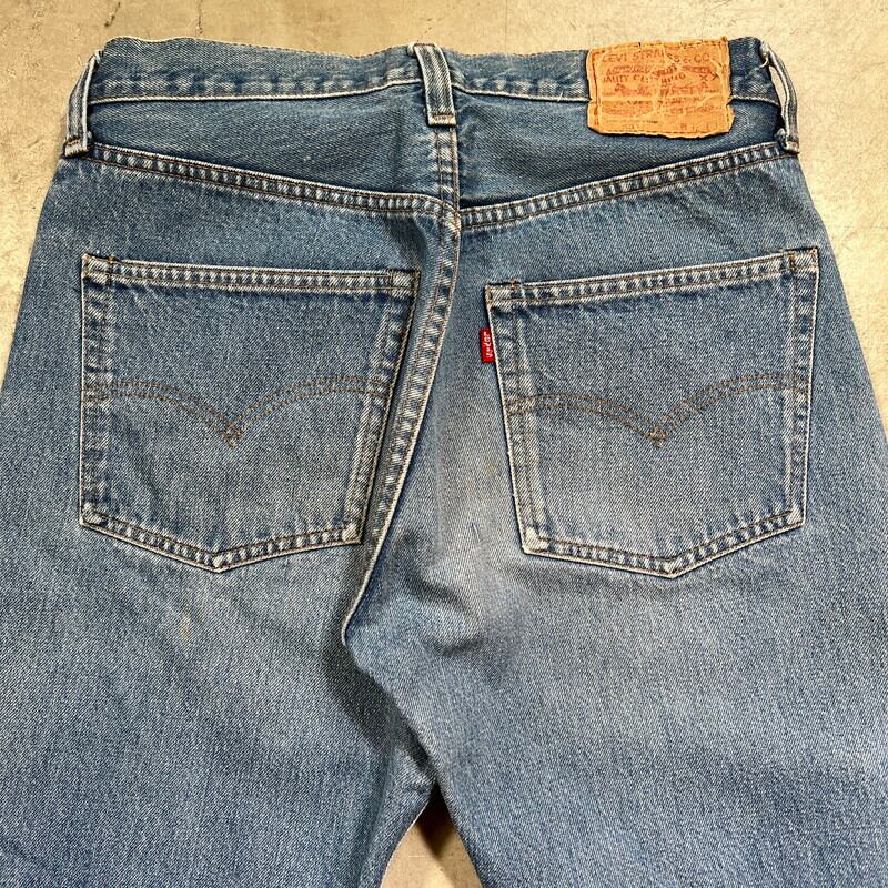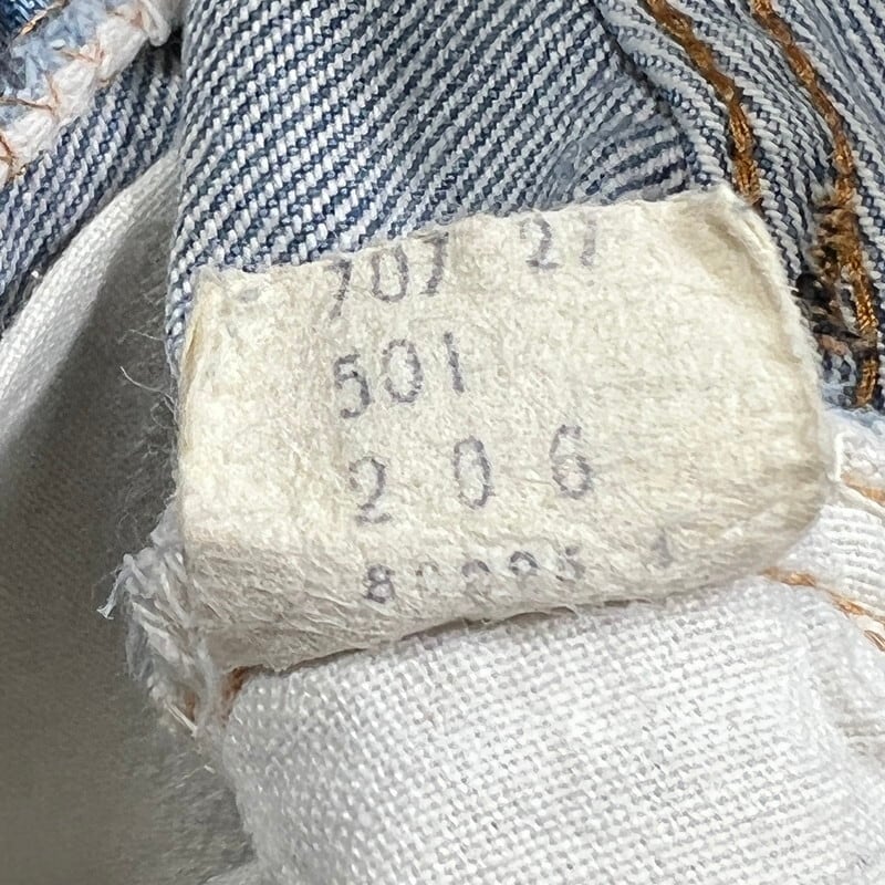 80年代初頭のLevi's501 デニムパンツです。トップボタン裏刻印6、ウォッチポケット裏チェーン、セルヴィッジ、アウトシーム裏シングル+チェーン、縮率8%、赤タブスモールe、バックポケット裏チェーン。全体的に色落ちしており色残りは3割程度です。1980年製造の66後期モデルですが、なぜか股のカンヌキがズレカンになっています。裾等に多少の擦れはございますが、その他ダメージ等無く、状態は良好です。W32表記ですが、実寸で約W30インチです。夏に合わせやすい色味ですので、バンTee等と合わせてみてはいかがでしょうか。男女共に穿きやすいサイズでオススメです。