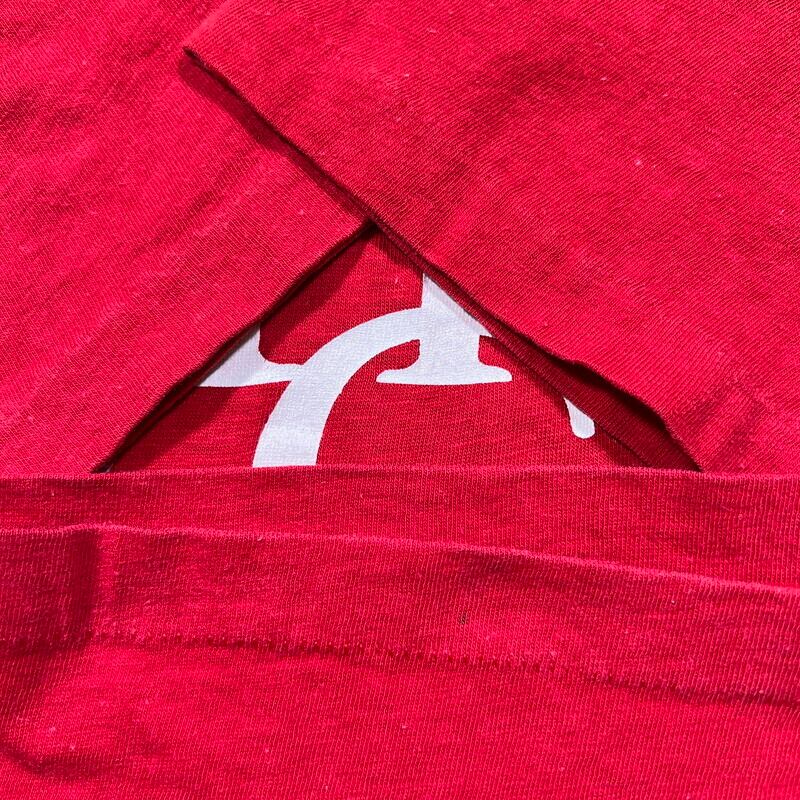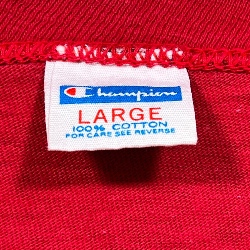 70年代頃のChampionプリントTeeです。バータグが付くこちらにプtリントされているNEW YORK HEALTH &RACQUET CLUBとは1973年に設立されたフィットネスクラブです。真っ赤なコットンボディーに白いプリントが映える1着です。袖と裾はシングルステッチで縫製されています。全体的にややフェードしておりバランスの良い色味です。LARGE表記で身幅はありますが、着丈がやや短めです。ダメージや汚れは特に無く状態は良好だと思います。デニムやミリタリーウェアとの相性が良いので、夏のアメカジファッションを楽しんでみてはいかがでしょうか。