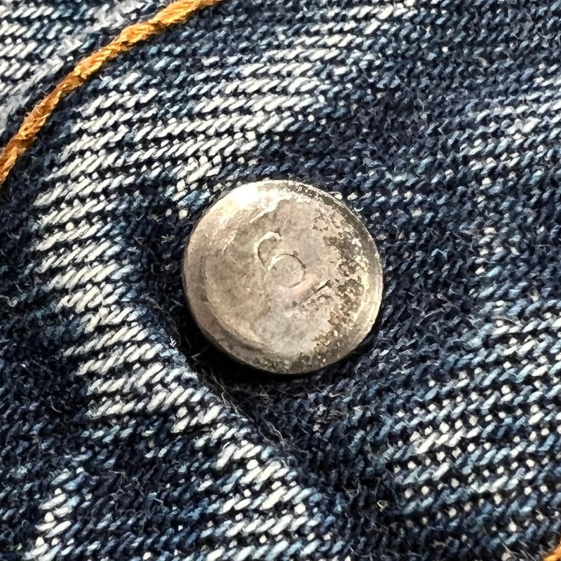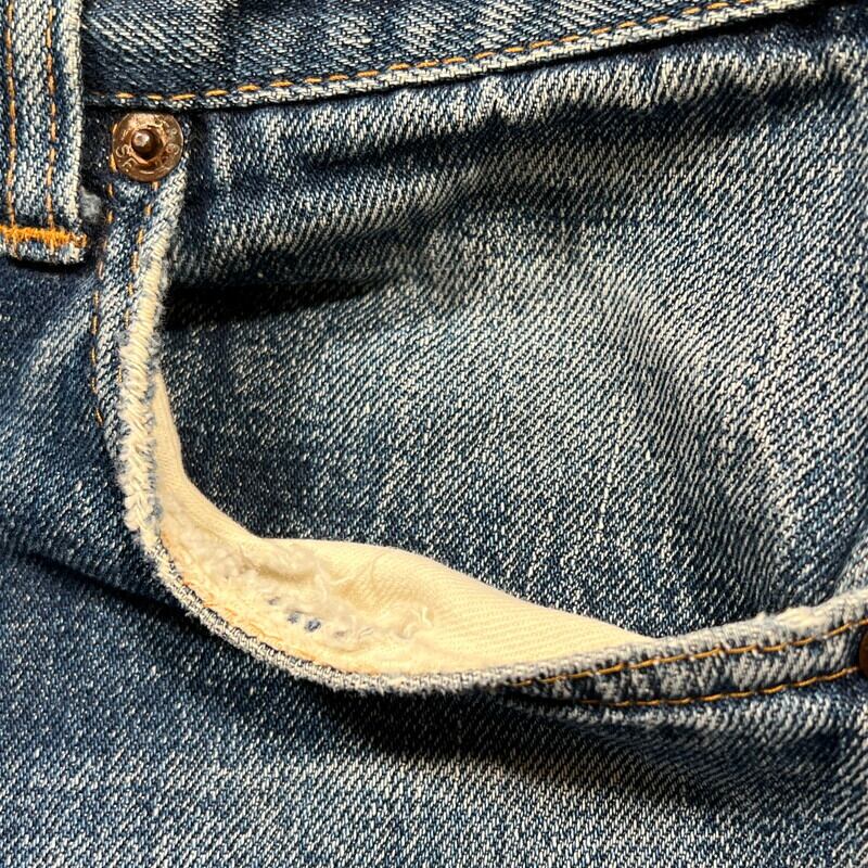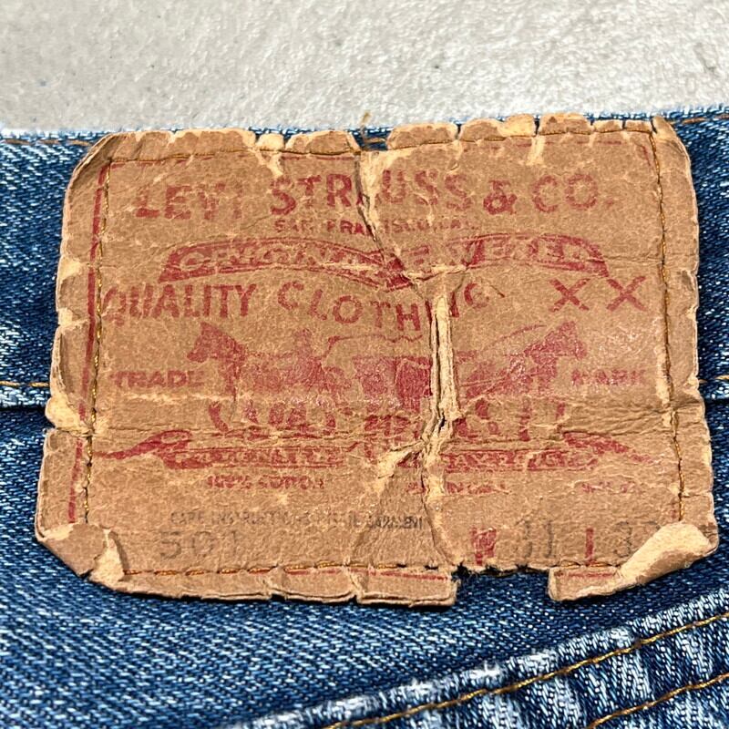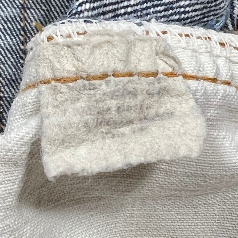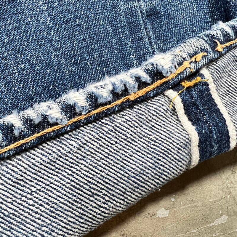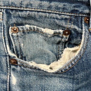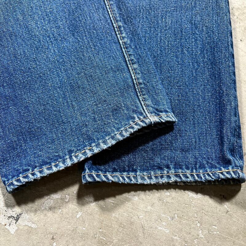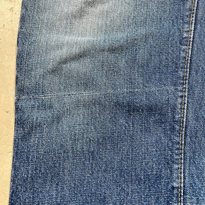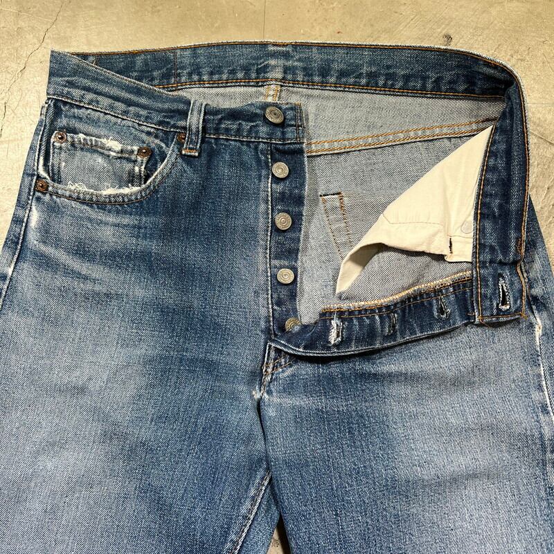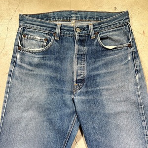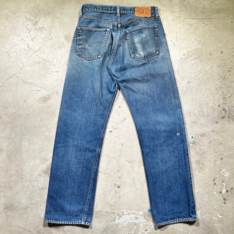 70年代頃のLevi's501デニム66前期モデルです。フロントトップボタン裏刻印66、ウォッチポケット裏チェーン、バックポケット裏シングル、スモールe。欠損しがちな紙パッチも残っています。全体的に粗めな色落ちが見られ、フロントにヒゲが入ります。ポケットや前立て付け根、股付け根、左膝、右膝裏、ポケットスレーキ等にダメージがございます。裾にも擦れによるダメージがございます。前立て付け根と左膝は裏から薄い接着芯で補強しています。右膝に横横1直線の糸抜けがございますが、今のところ着用に支障は無いと思います。ウエストの表記はW31ですが、実寸はW30インチです。少しダメージはございますが、色具合は雰囲気も良いのでシンプルなトップスと合わせても充分かっこ良いと思います。赤耳モデルも徐々に手に入れづらくなってきていますので、サイズでお探しだった方は是非いかがでしょうか。