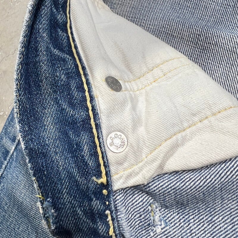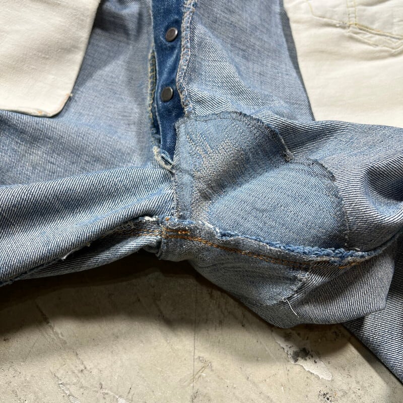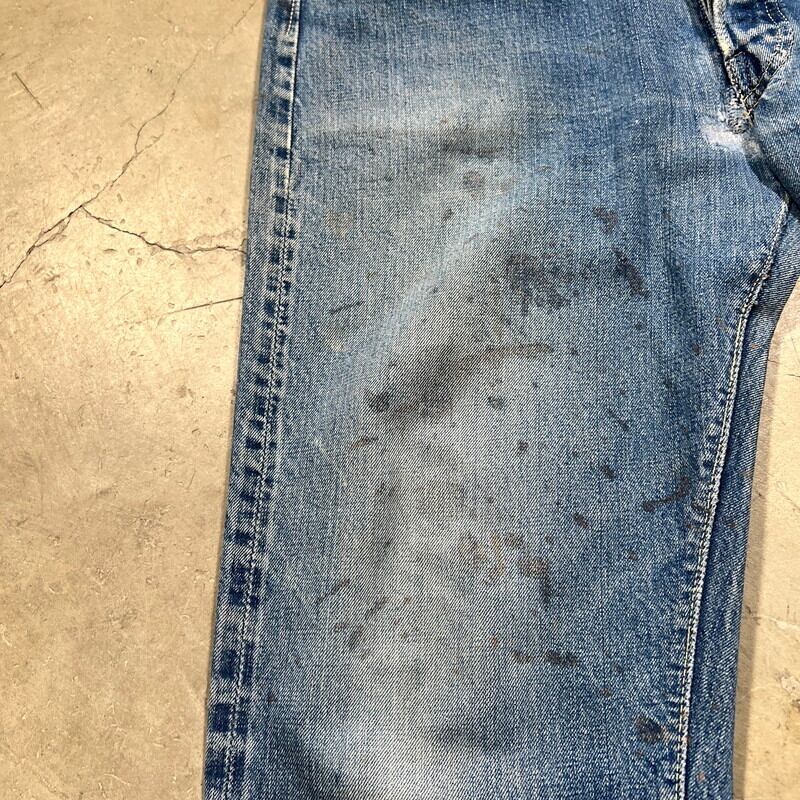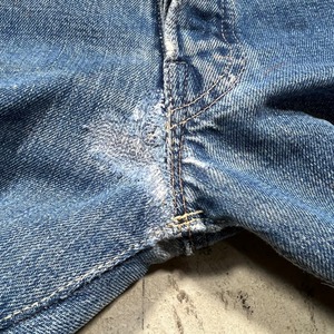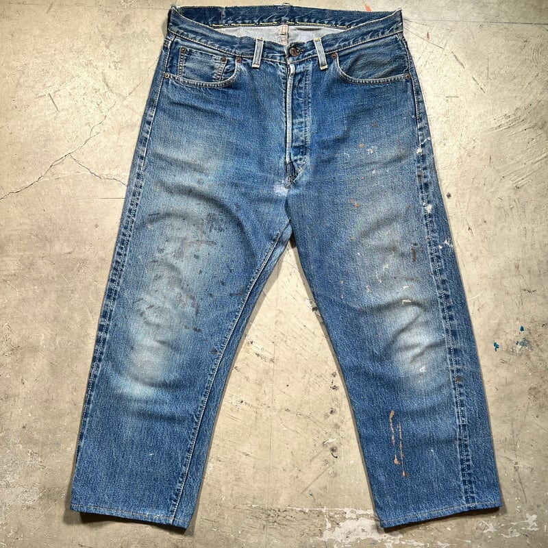 60年代のLEVI'S 501XXです。トップボタン裏刻印J、Vステッチ、足長R、アルミリベット、隠しリベット、ウォッチポケット裏セルヴィッジ、センターループ、赤タブBig E(ダメージ有り)。501XXとしては後期にあたらギャラ無し期のモデルです。全体的に色落ちし、フロントを中心にシミやペンキ飛びが見られる雰囲気の良いアイテムです。お尻から股の付け根にタタキリペアが施されています。ウエスト等にも擦れや小さなダメージ等がございます。こちらの個体も裾上げがされておりレングスが短い仕様ですので、8~9分丈感覚で合わせると使い易いと思います。ソックスをチラ見せしたり、秋冬はシャフトの高いブーツと合わせてもカッコよいのでは無いでしょうか。ペンキ飛びのバランスも良いので、シンプルな無地Teeで充分様になると思います。ウエストは実寸W34インチとゴールデンサイズです。サイズの良い501XXは今後さらに入手しづらく思いますので、レングス短めをお探しだった方は是非この機会をお見逃しなく。