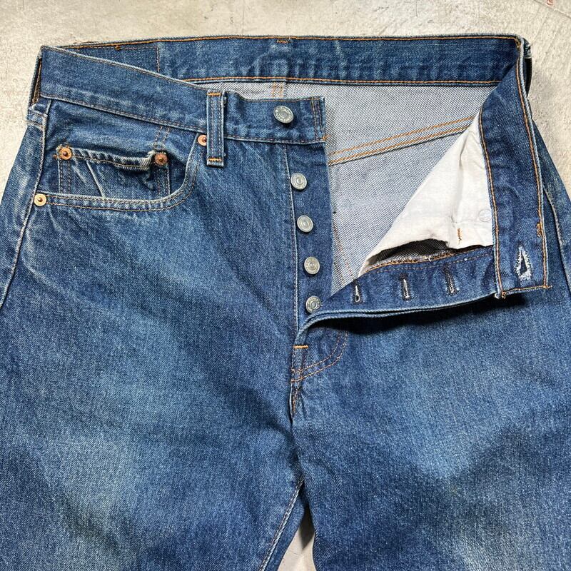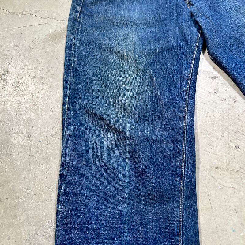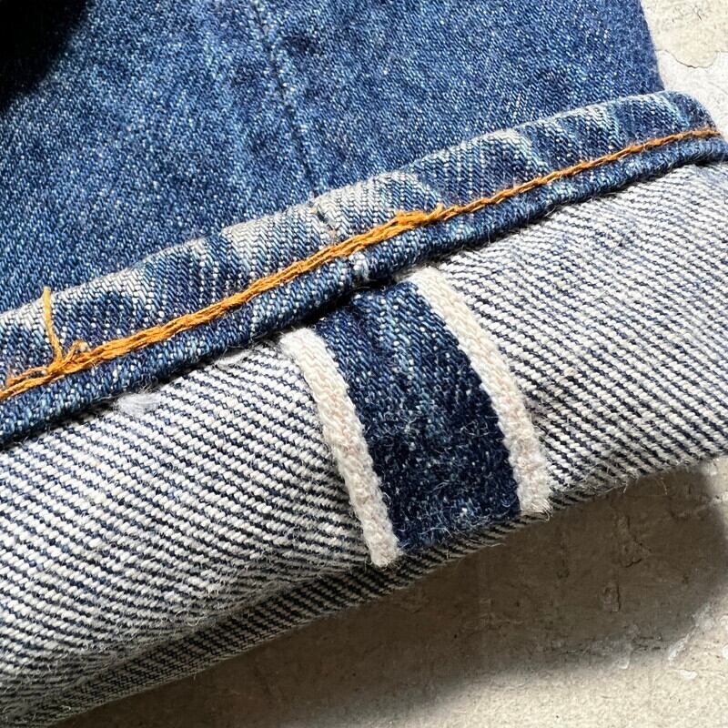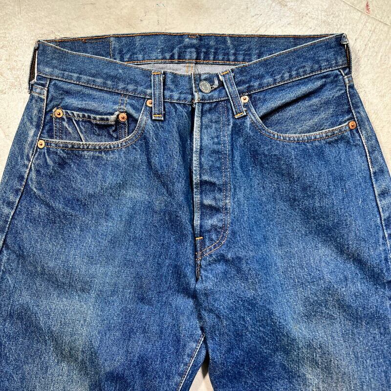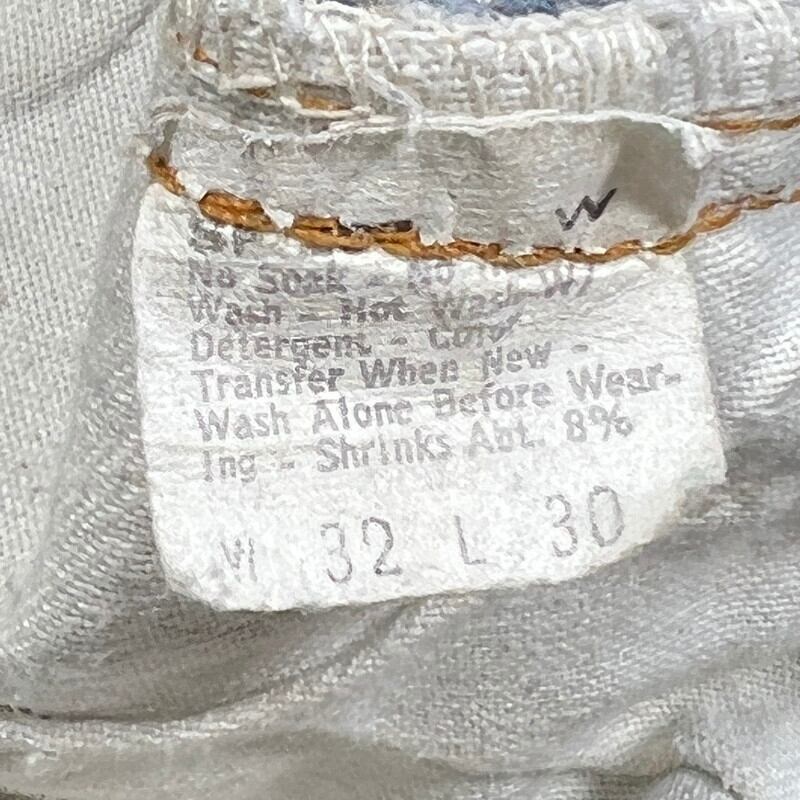 80年代初頭のLevi's501 デニムパンツです。トップボタン裏刻印6、ウォッチポケット裏チェーン、赤耳セルヴィッジ、縮率8%、赤タブスモールe、バックポケット裏チェーン、1980年製。比較的色が残る個体で、5~6割の色味です。ヒゲやハチノスは入っていませんが、センターの折り跡が見られます。バックポケットにも財布あとの様な色落ちも見られます。アタリや細かな擦れは見られますが、ダメージやリペアの無いグッドコンディションです。これからのエイジングも充分楽しんでいただける個体だと思います。表記はW32でウエスト実寸はW30位です。レングスは恐らくオリジナルかと思われますが、表記のL30からは3インチ程縮んでいます。66後期でも色味が残っている個体はかなり見つかりづらくなっているので、サイズが合う方は是非この機会をお見逃しなく。