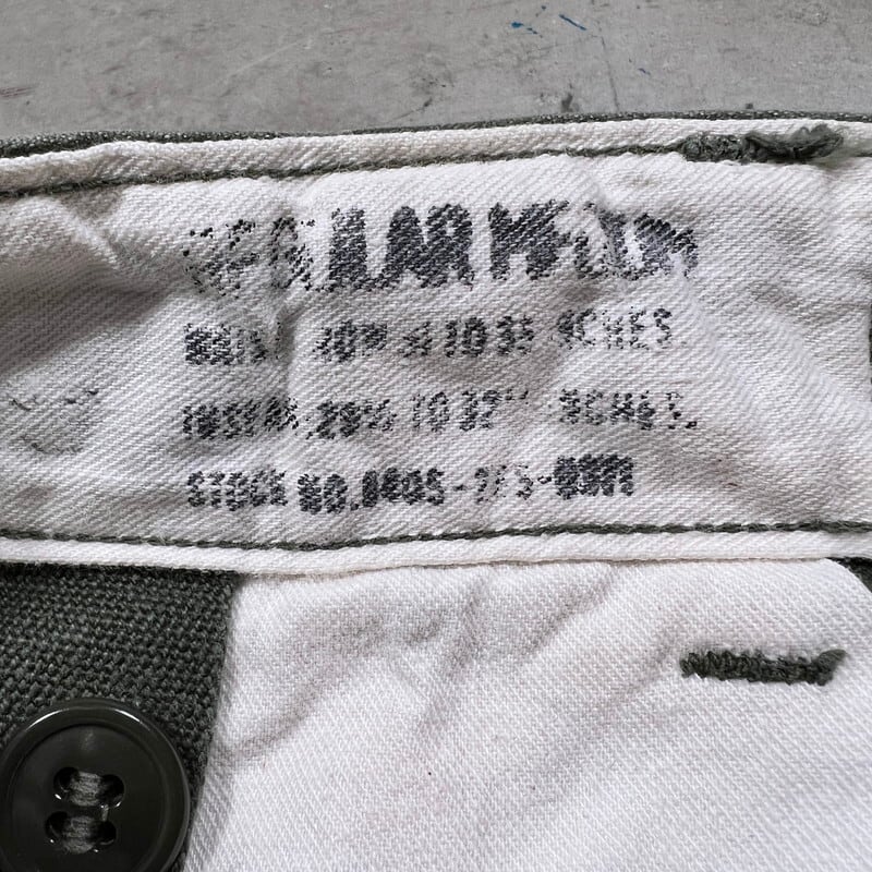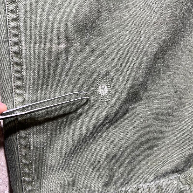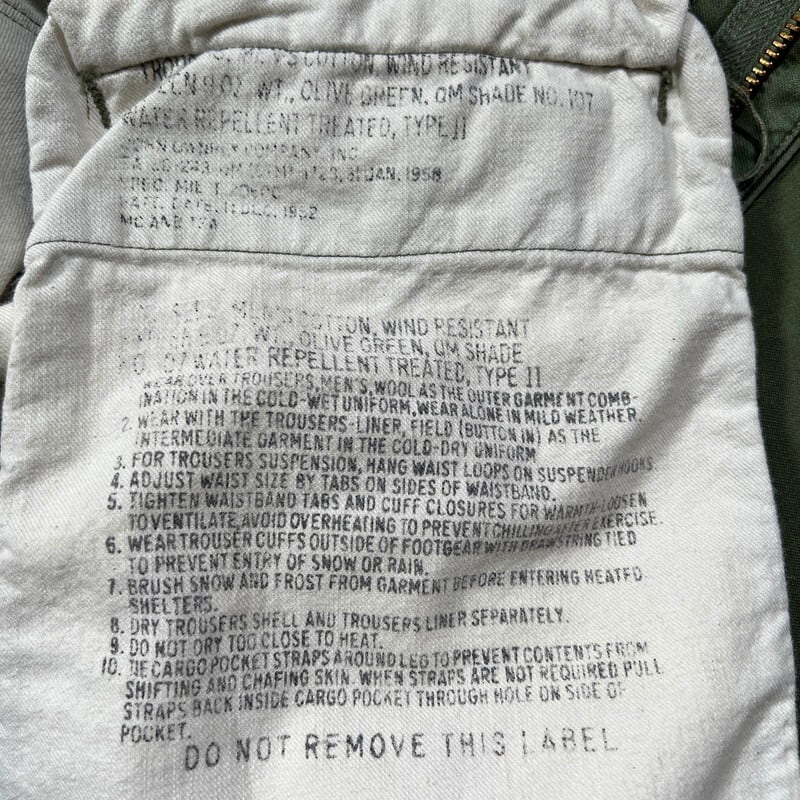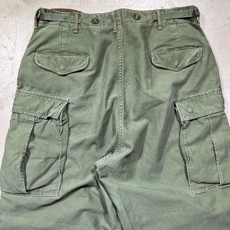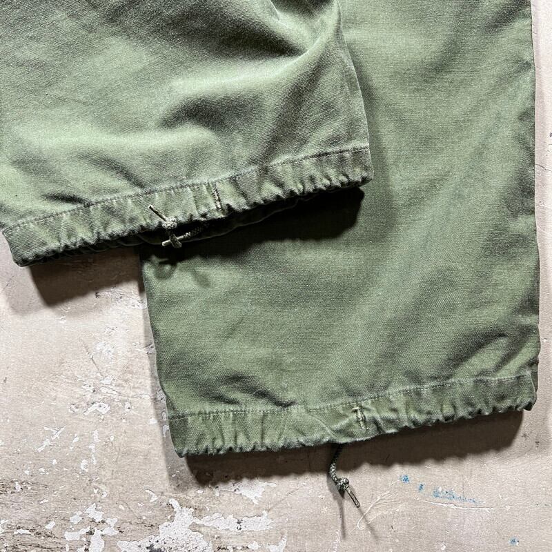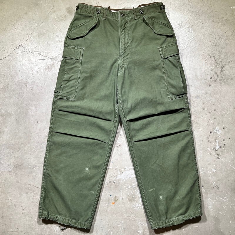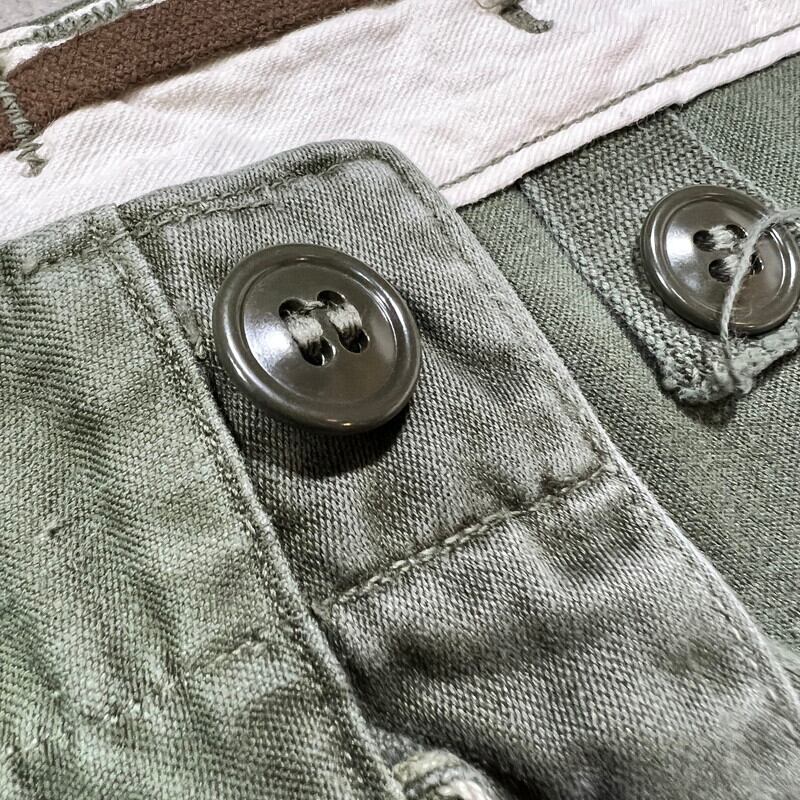 50年代のU.S.ARMY M-1951フィールドパンツです。MIL-T-2060C、JOHN OWNBEY COMPANY INC。コットンサテンのツイル生地で、濃いグリーンの尿素ボタンは欠損無く揃っています。フロントはRAPIDジッパーが採用されています。全体的にやや色あせており、細かなシミや、両足裾付近に小さなリペアが2カ所ございます。特筆する大きなダメージはございません。ミルスペックの表記がややかすれてはいますが、MC AND TSA表記が確認できます。MC&TSA(Military Clothing&Textile Supply Agency)はDSA表記に変わる前のわずか5年ほど使用されていたもので、USMC(海兵隊)への調達を行っていた発注機関のようです。WATER REPELLENT TREATEDとあるように撥水加工が施された個体ですので、もしかするとUSMC関連のアイテムかもしれません。サイズはMEDIUM REGULARで、サイドのアジャスターを使用すればW29インチからW35インチまで調整できます。M-1951や後継モデルのM-65はここ数年でかなり人気も高くなり高騰傾向にありますので、サイズでお探しだった方は是非いかがでしょうか。