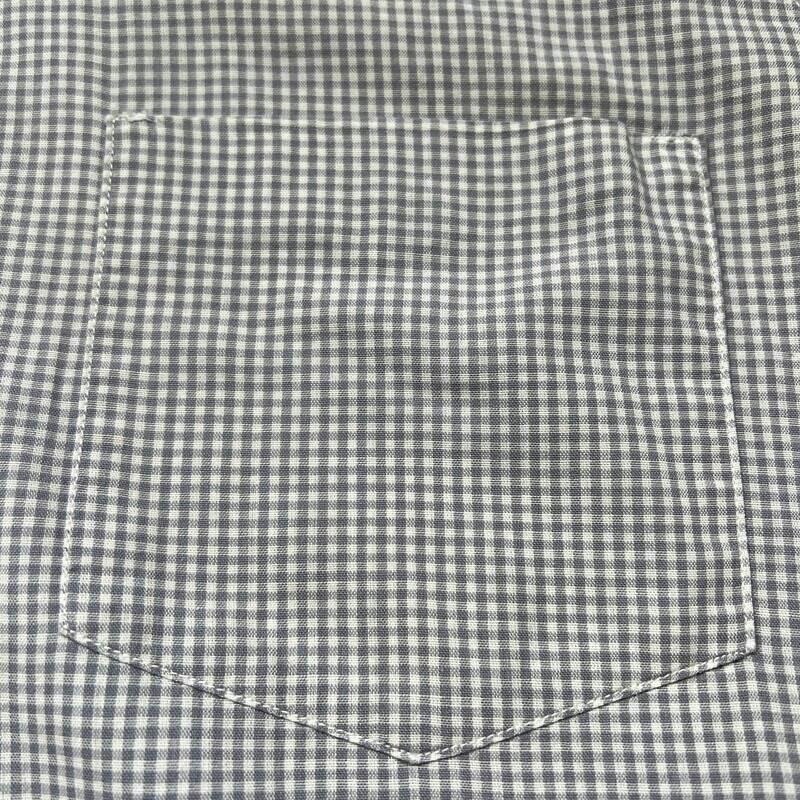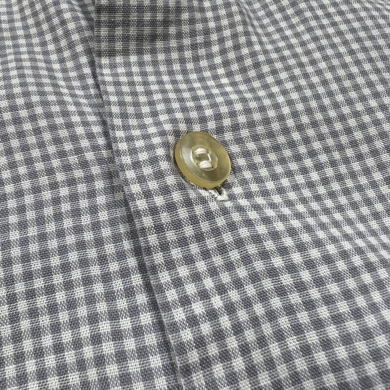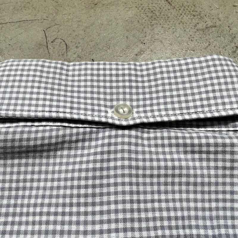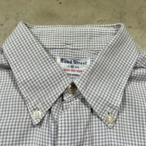 60年代頃のBond Street ギンガムチェックBDシャツです。Bond Streetというブランドは、アメリカのBOND FIFTH AVENUEとは別の会社で、イギリスのブランドなのかな?と思っていましたが、見返し部分にユニオンチケットらしきスタンプが押印されているのでアメリカのブランドの様です。BOND FIFTH AVENUE社との関係は不明です。グレーの小ぶりなギンガムチェック柄で、襟後にもボタンが付く3点留めのボタンダウンシャツです。背面の裾付近に2ヵ所修復跡がございます。修復跡近くに小さなシミがございます。その他はダメージや汚れの少なくコンディションは良好だと思います。Mサイズ表記ですが、肩幅がやや狭めですので、普段Sサイズを着用する方に丁度良いサイズ感かもしれません(身幅にはゆとりがございます)。シンプルなシャツでヴィンテージっぽくないデザインなので、オンオフ共に使い易い1着だと思います。