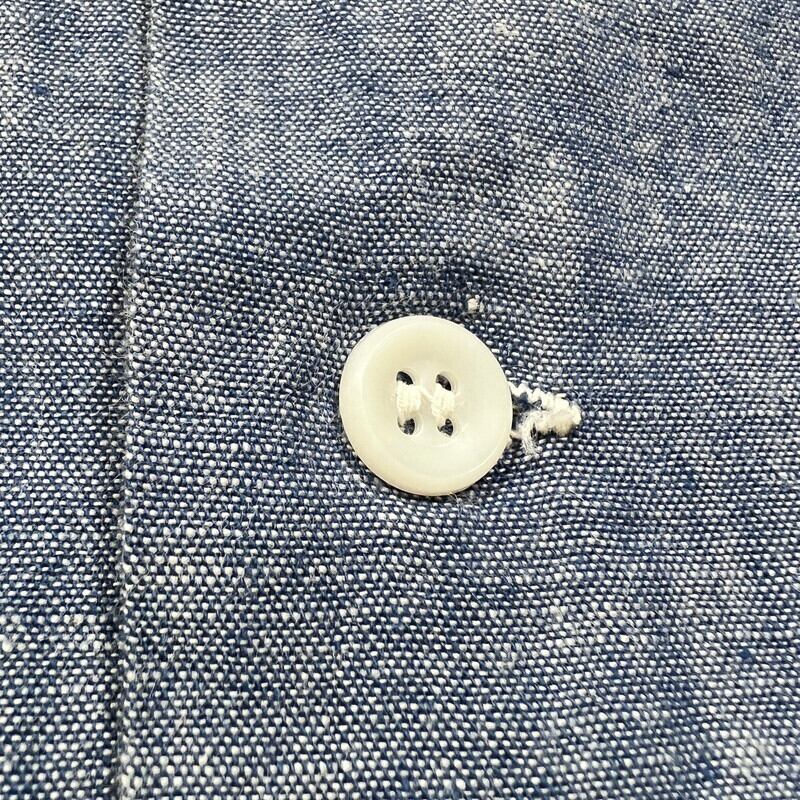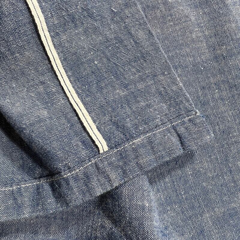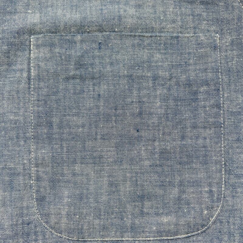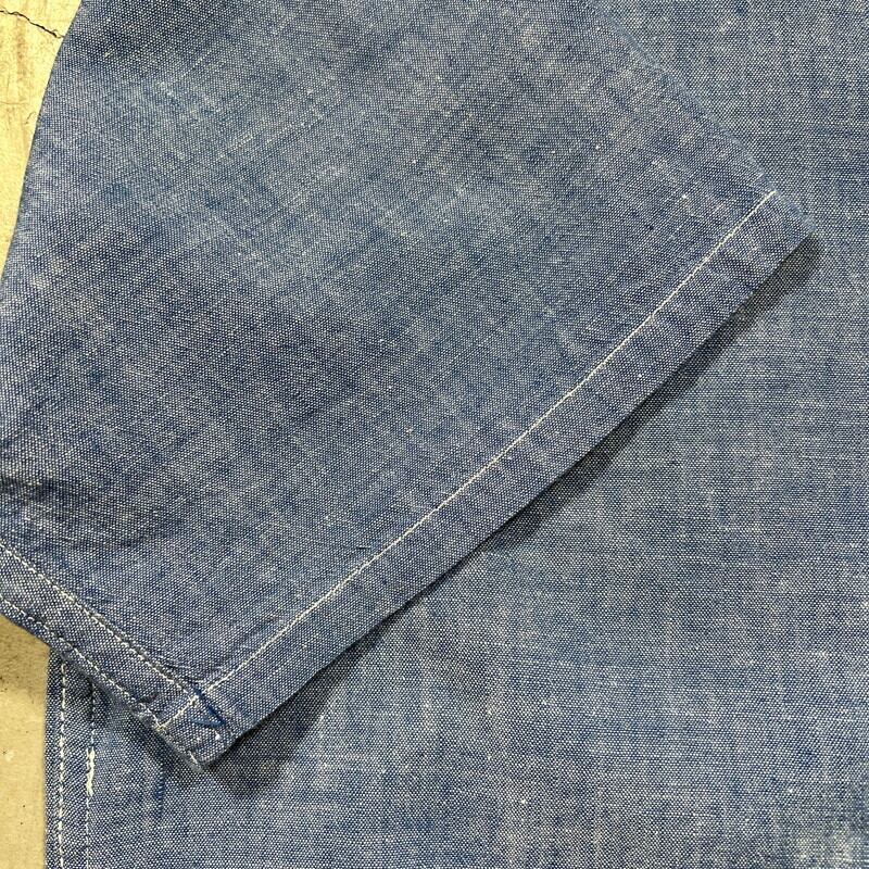 60年代頃のCustom Tayloredシャンブレーシャツです。ブランド詳細は不明ですが、デパートメント系のオリジナルラインなのかもしれません。襟は袋縫いで、襟芯は入らないタイプで、オリジナルのショートスリーブです。裾の縫製はピッチ幅が違うので若干着丈を詰めているかもしれませんがボックスシルエットで仕立てられています。襟元はループボタンは付きませんが開襟での着用も想定したカッティングとなっています。見返しには耳が使われています。汚れやダメージは無くコンディションの良い個体です。サイズ表記はSですのでやや小さめですが、細身な男性や女性の方に丁度良いサイズ感だと思います。なかなかこの年代あたりのシャンブレーで状態の良い物は見つかりにくい印象ですので、サイズが合う方は是非この機会にいかがでしょうか。