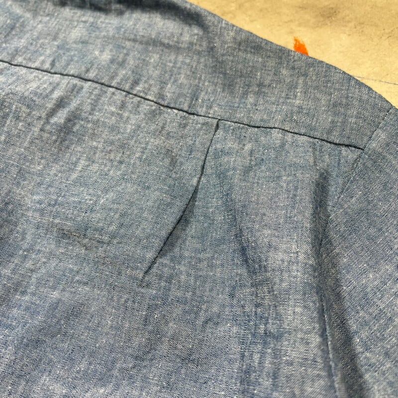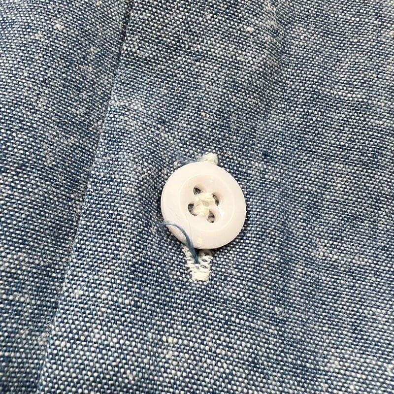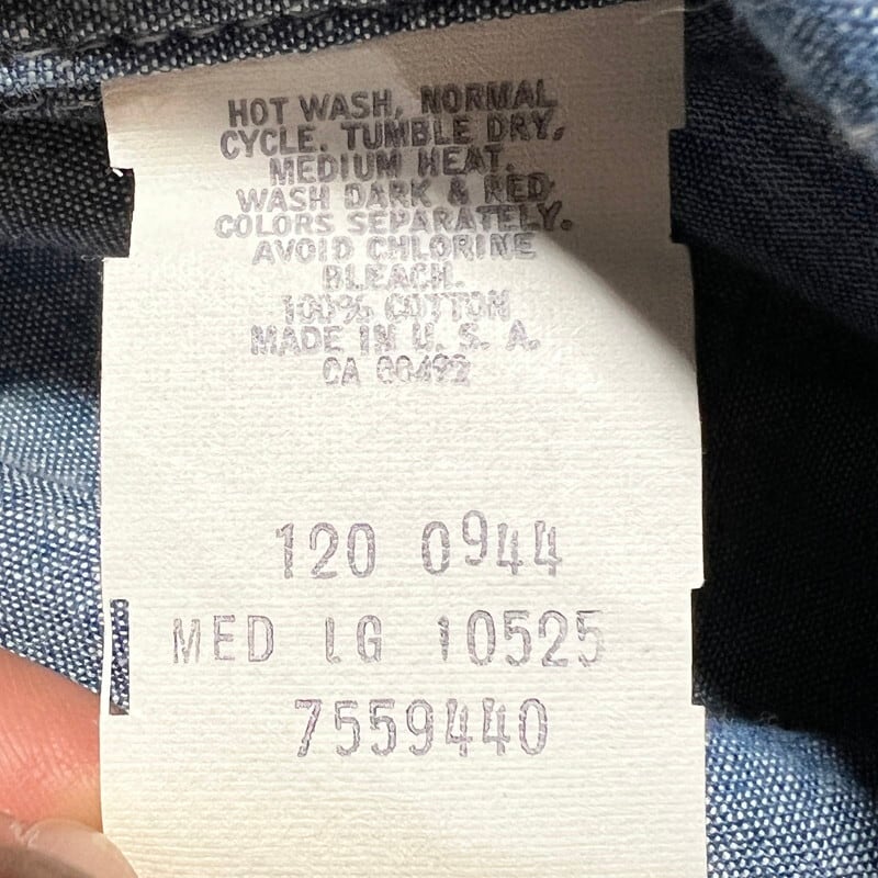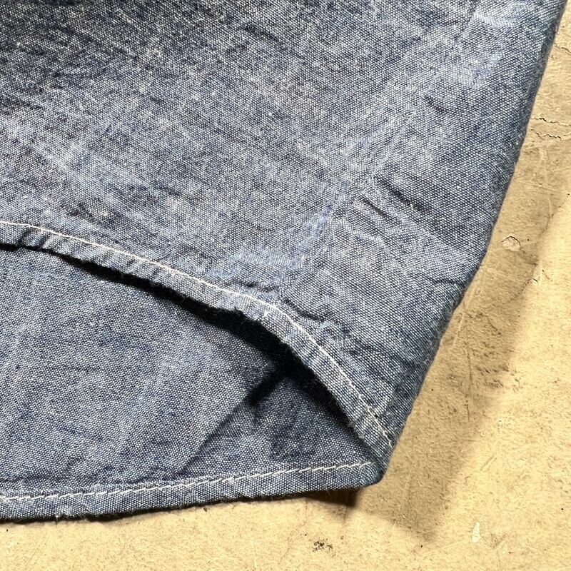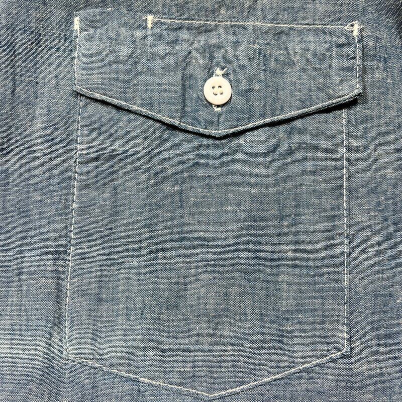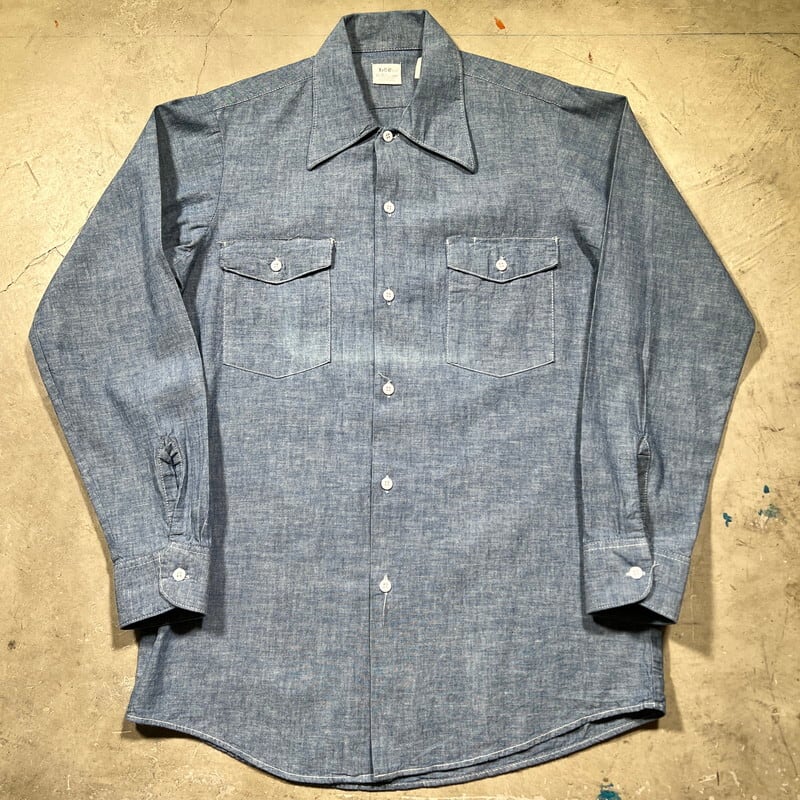 60年代後半から70年代初頭頃のLeeシャンブレーシャツです。ホワイトにグレー刺繍のタグが付くこちらは、®MR表記が入り、コットン100%の生地が使用されています。襟は大き目で、襟芯が入るタイプです。まだ糊が若干残るワンウォッシュ程度のグッドコンディションです。フロントの中央付近に長期保管によるヤケが見られますが、許容範囲だと思います。袖やサイドは内縫いで縫製されています。メジャーブランドですが、100%コットンのシャンブレーシャツは意外と見かけない印象です。ワンウォッシュ程度のコンディション物となれば特に見つからないのでは無いでしょうか。サイズはMEDIUM LONG表記でやや着丈がございますので、タックインもしくは、背の高い方も合わせやすいサイズ感では無いでしょうか。オーバーオールのインナーとしても良いかと思います。シャンブレーシャツは合わせやすいので、何枚あっても使えますし、まだお持ちでは無かった方はこの機会にいかがでしょうか。