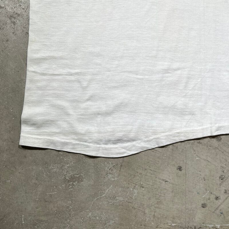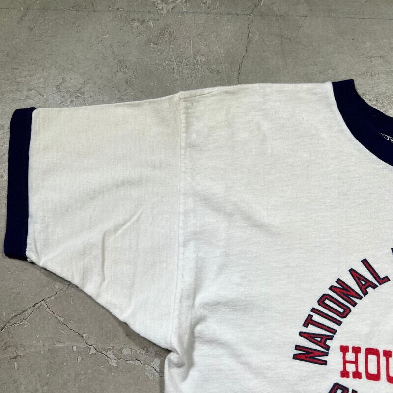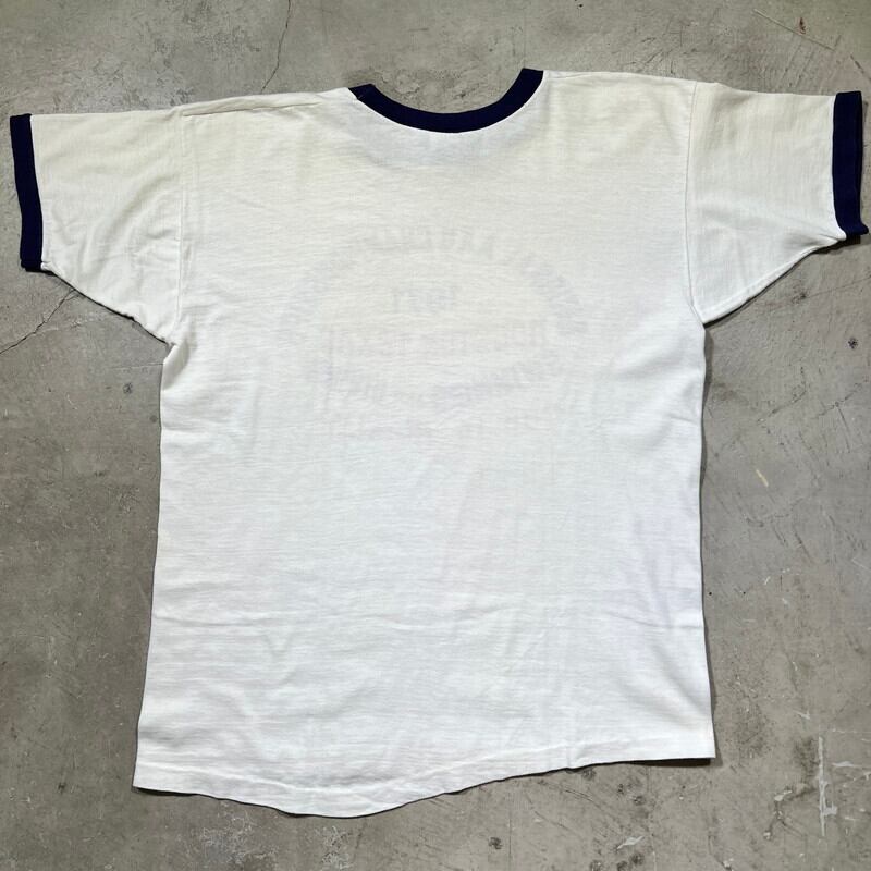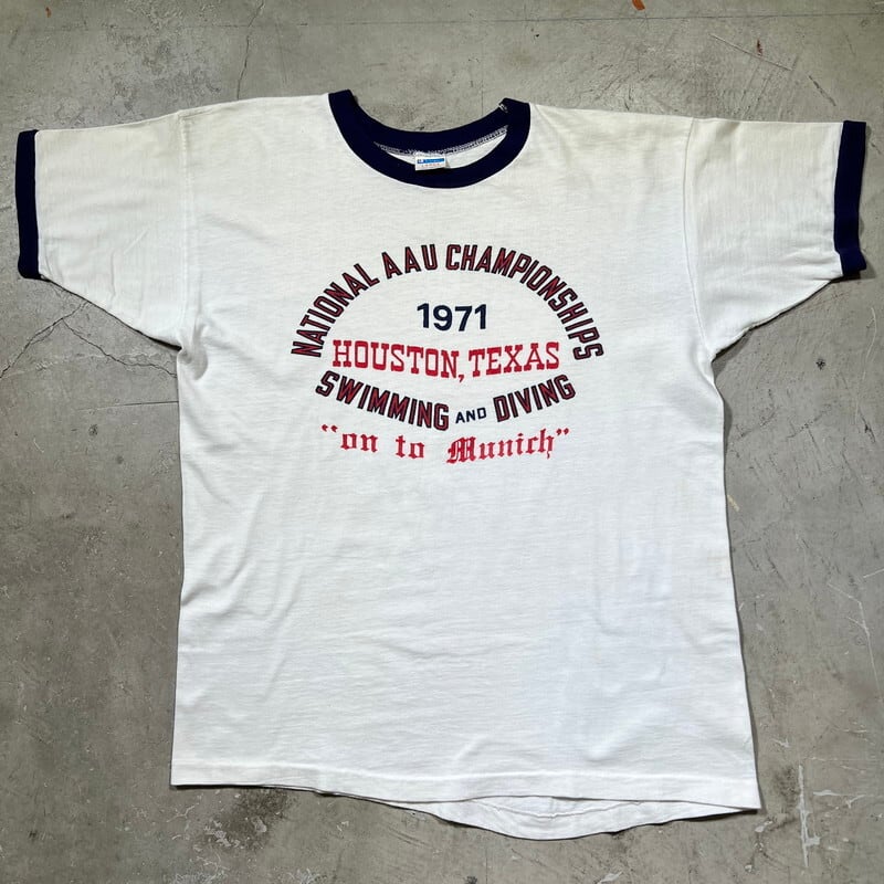 70年代のChampion染み込みプリントリンガーTシャツです。70年代前半頃のバータグが付くこちらは、フロントに5段の染み込みプリントが施された1着です。1972年西ドイツで開催されたミュンヘンオリンピックの前年に行われた水泳と飛び込み種目の選考会の関係者に配られたアイテムだと思われます。トリムはネイビーの様にも見えますが、濃いパープルだと思います。Tシャツ中心より上部(胸や肩)に若干うっすらと変色が見られます。腹部サイドにも薄汚れがございます。背面の裾に一部伸びがあります。ダメージ等は無く生地の状態は良好です。こちらもLARGE表記ですが着丈がやや短めとなっています。今季人気のリンガーで染み込みプリント、しかも5段プリントというのは非常にポイントが高いのではないでしょうか。首元や袖のトリムは経年でナス紺のように変化していくと思われますので、着こむ程にアジのある表情を楽しめるのでは無いでしょうか。