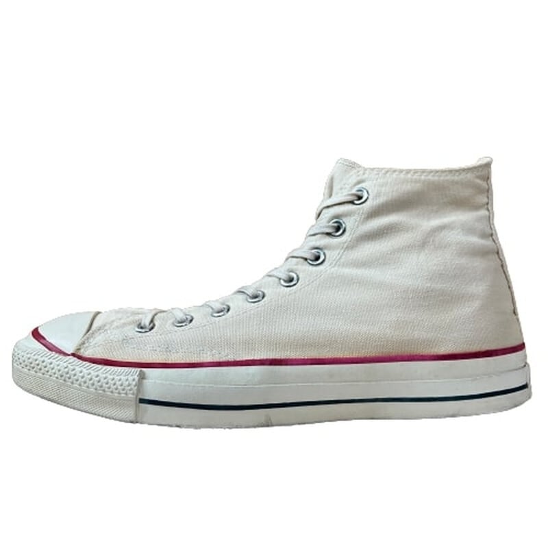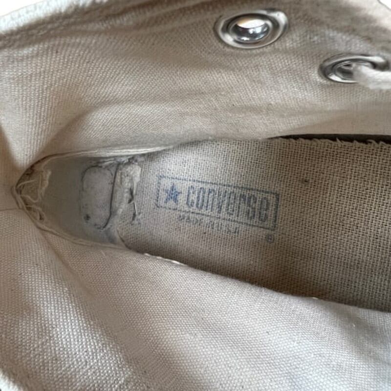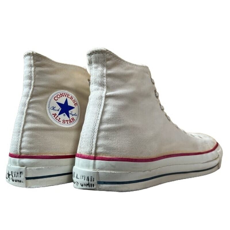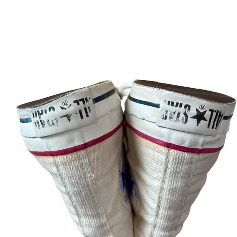 80年代のCONVERSE ALL STAR HIキャンバススニーカーです。紺色のヒールパッチから白へと変更になり、それまでのチャックテイラーからオールスターへと呼び名が変わったモデルです。インソールは青文字青枠、サイドステッチ、当て布が付きます。キャップトゥもこの年代ではまだ小ぶりです。トゥ、ソール共に硬化は無くしなやかです。インソールかかと部分の生地にダメージがございます。若干汚れはあるもののソール減りも少な目で比較的状態は良好です。シューレースは細いコットンのものに交換されています。サイズはUSA11ですので、やや大き目ではありますが、ぎゅっと絞って履いても良いかと思います。80年代初頭頃のモデルでも状態の良いものは見つかりづらくなったと思いますので、お探しだった方は是非いかがでしょうか。永遠の定番アイテムですので、あると重宝すること間違いなしです。