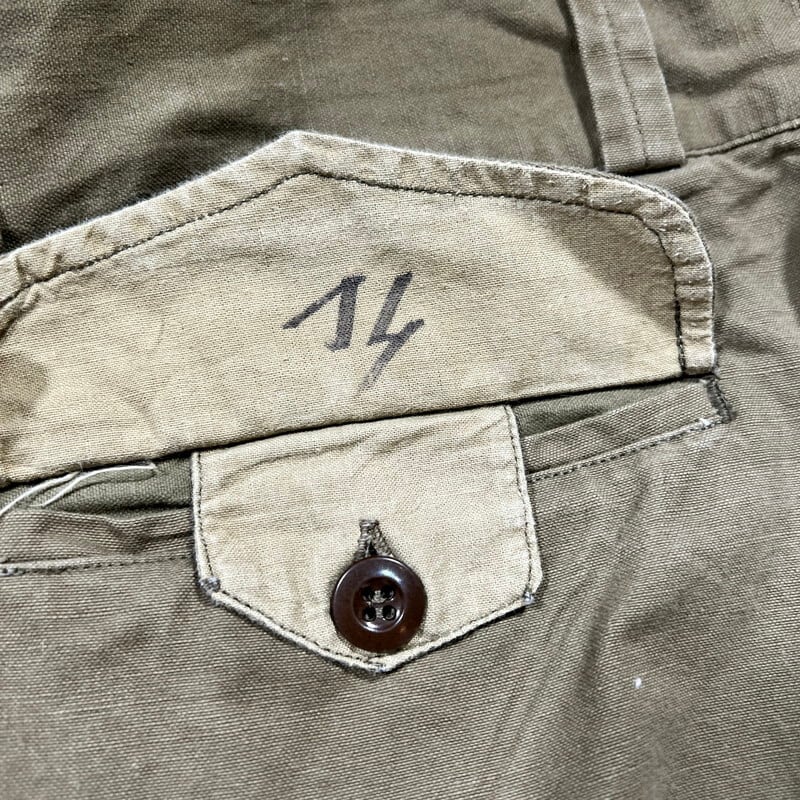 40年代から50年代頃のフランス軍M-47フィールドパンツです。マルジェラがサンプリングした事で有名なフレンチミリタリーの名作です。フロントは剥き出しの2つボタンタイプです。モーターサイクルパンツ同様に裾は、ばたつかないように絞れる仕組みです。ご紹介するこちらは、前期型と呼ばれる個体はコットンツイルが一般的ですが、こちらの個体は平織のキャンバス地で作られた珍しい個体です。ツイルのモデルに比べると少し薄手で穿きやすいと思います。全体的に色褪せがあり、擦れ等の使用感はありますが。状態は良好です。左バックポケットのフラップ裏にマジックで何か書かれています。ウエスト表記は33で、実寸W34インチのゴールデンサイズです。M47も仕様が様々ございますが、平織りのキャンバス地モデルはあまり出ないと思いますので、お探しだった方は是非この機会にいかがでしょうか。