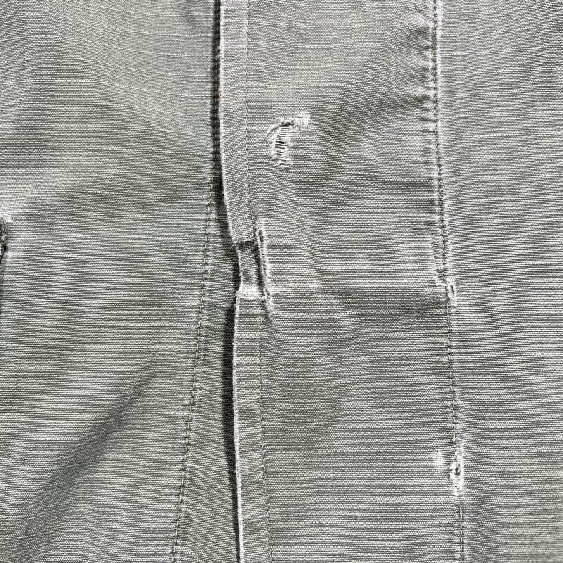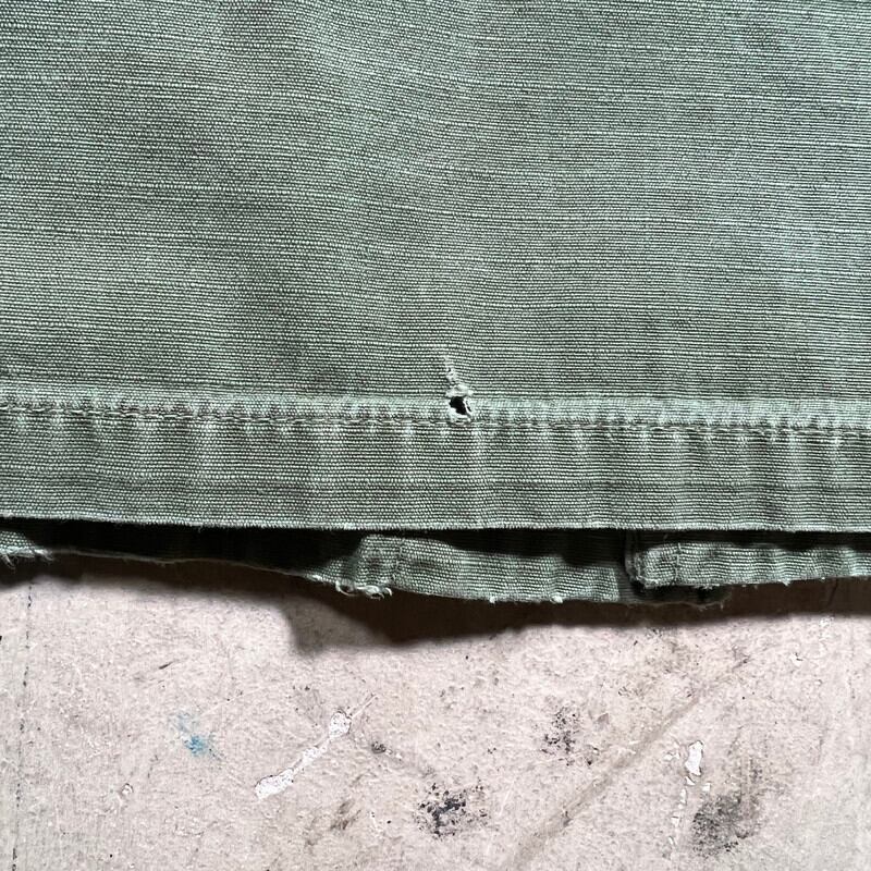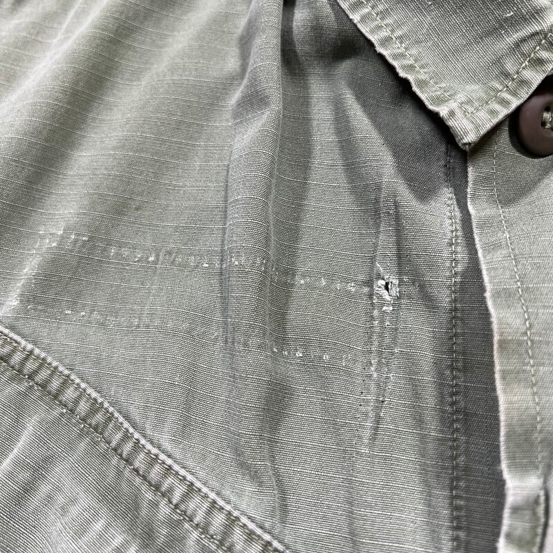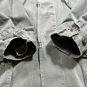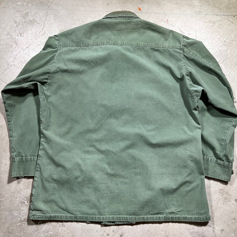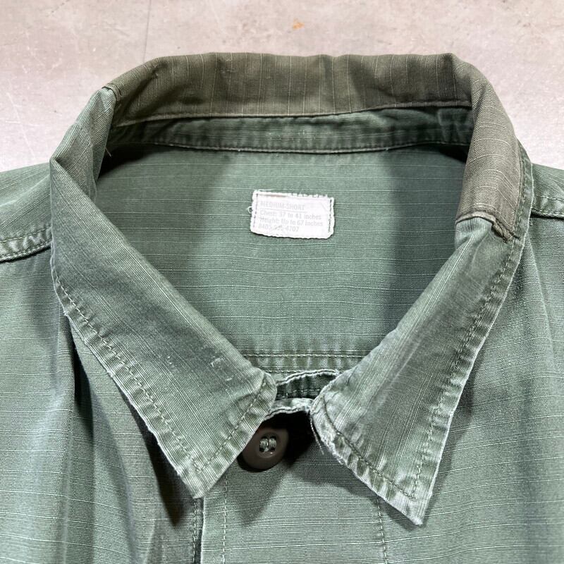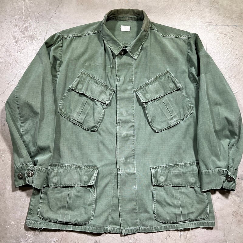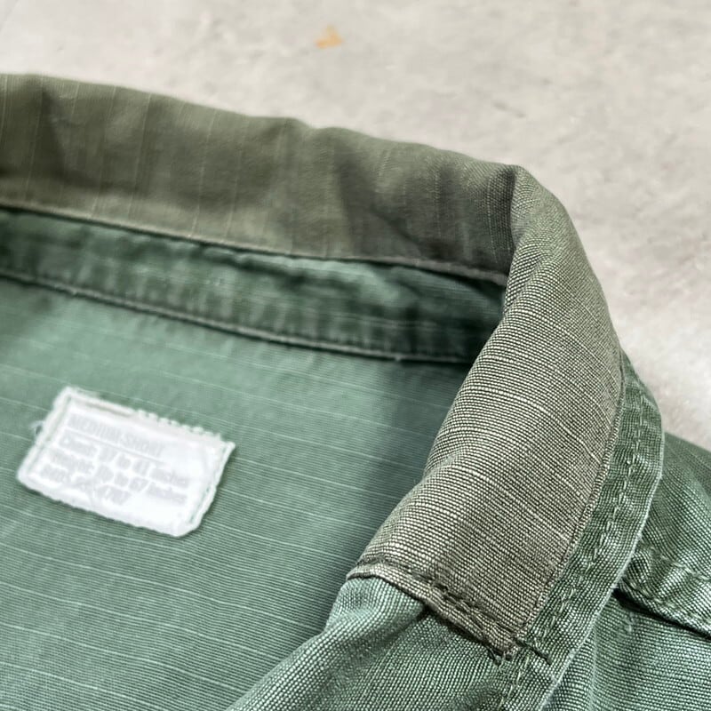 70年代のU.S.ARMYジャングルファティーグジャケットです。DSA100-70-C-0208、MACSHORE CLASSICS社。リップストップ地の所謂4thタイプです。袖の仕様が簡略化された後期のタイプです。全体的に色褪せや小さなダメージがあり、裾に擦り切れなどございます。右胸と左腕にはワッペンを取り外した形跡がございます。襟は生地を足してリペアされています。使用感はございますが、雰囲気の良い個体です。ボタンもすべてオリジナルで揃っています。サイズはMEDIUM SHORT。ジャングルファティーグに限らず、ミリタリーアイテムの中でも比較的球数の少ない言われるSHORTモデルでゴールデンサイズのMEDIUMですので、お探しだった方は是非いかがでしょうか。