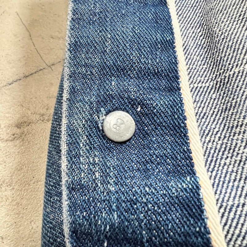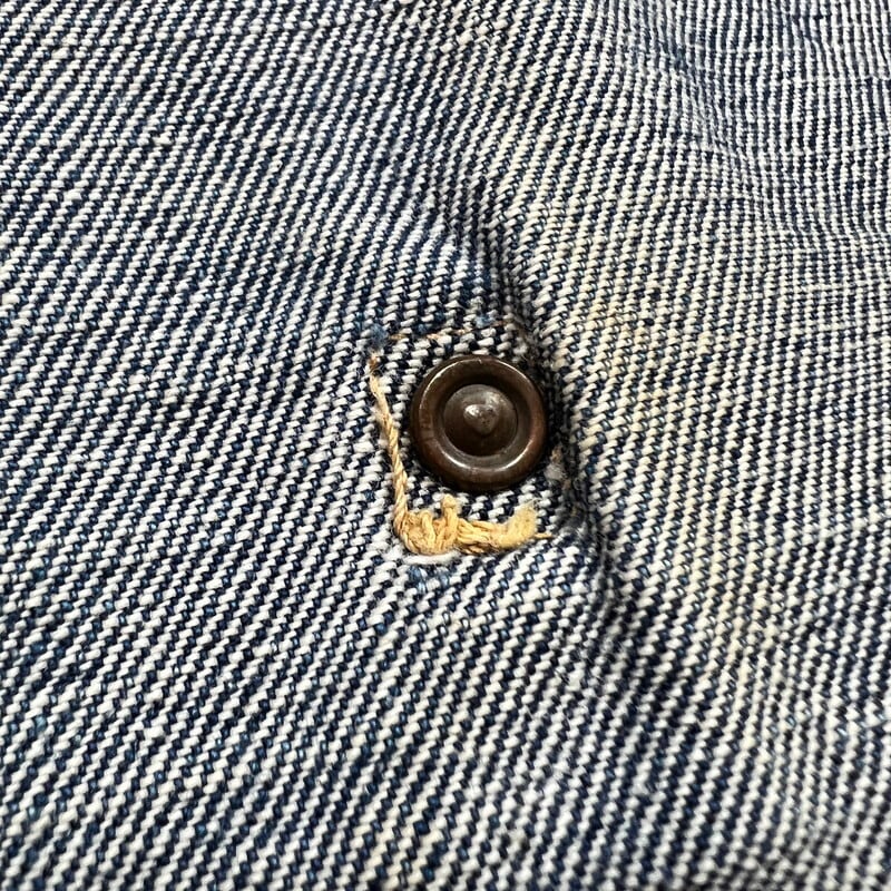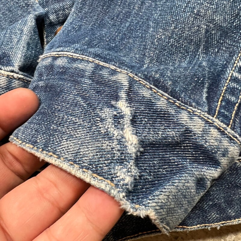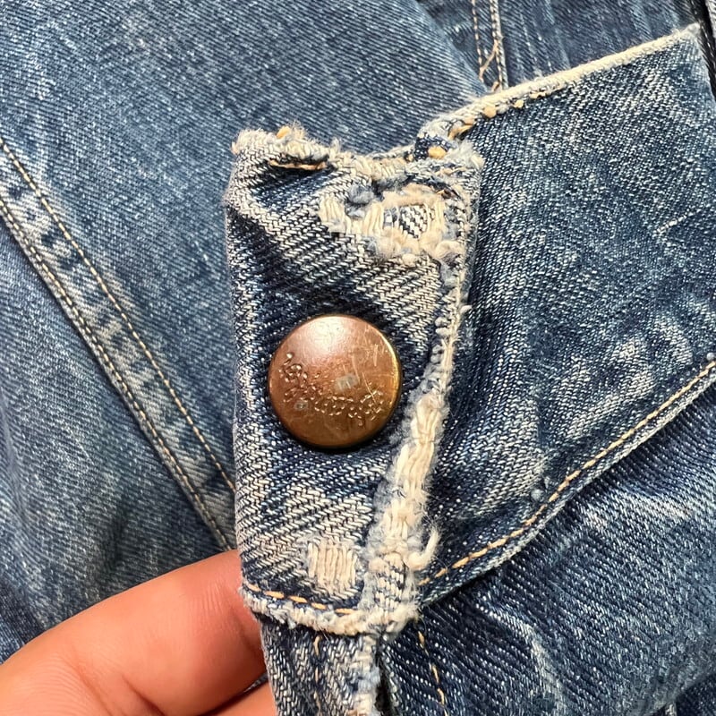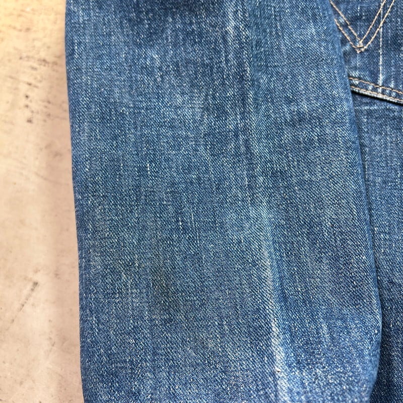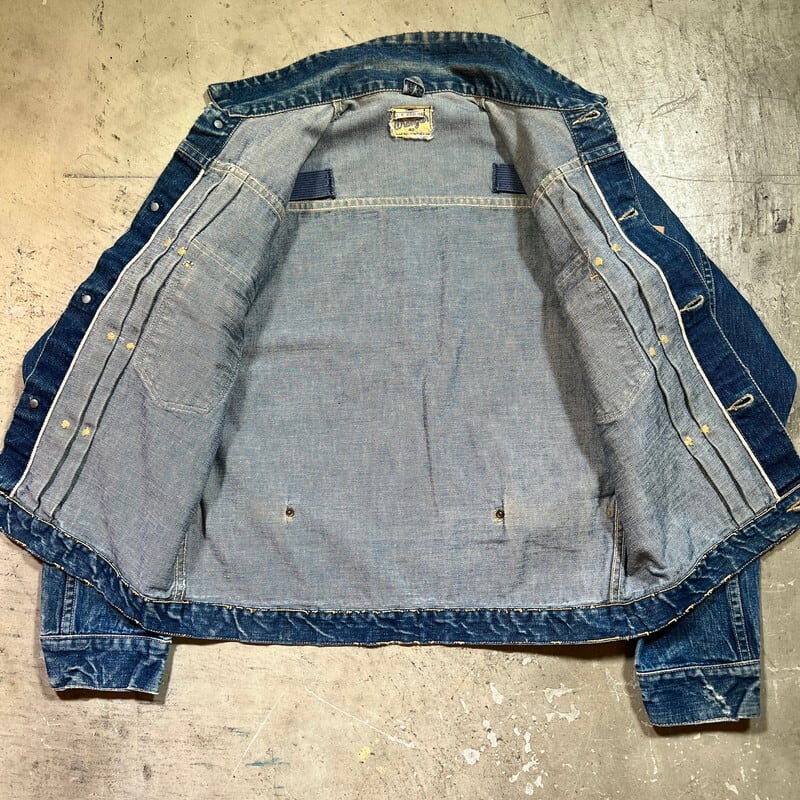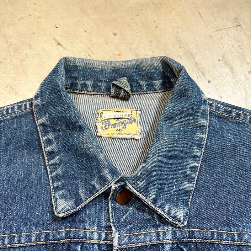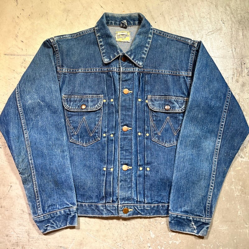 50年代のWRANGLER 111MLデニムジャケットです。1940年代にプロトタイプと呼ばれる11MJの後継モデルとして誕生したのがこの111MJです。初期のモデルは塩ビパッチが採用されており、ご紹介するこちらは塩ビパッチから縦ベルの布タグへと変わった直後のモデルです。センタープリーツを固定する丸い閂留めや、サイレントW、アクションプリーツ、サイドアジャスターなどラングラー特有のディティールが見てとれます。5~6割程度色残りがありますので、これからのエイジングも充分に楽しめる1着です。袖先に擦れや細かなダメージはございますが、その他は比較的コンディションも良い個体です。サイズは40表記です。ビートルズのジョン・レノンが愛用していた事で知られており、リーバイスやリーに比べると圧倒的に球数が少ないと言われていますので、お探しだった方は是非いかがでしょうか。着用はもちろんですが、コレクションとしても素晴らしいアイテムです。
