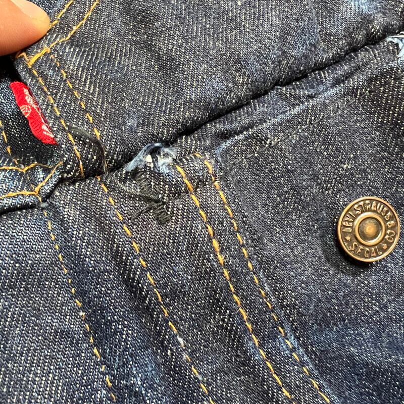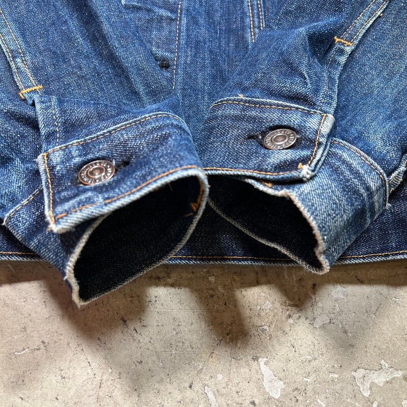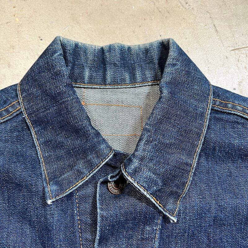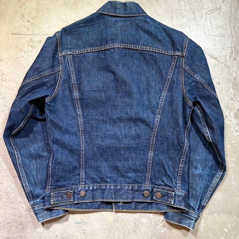 60年代頃のLEVI'S 71505デニムジャケットです。刻印524、赤タブBig E、不均等V。70505に比べるとやや着丈が長いようなの気もしますので、71205の可能性も無きにしも非ずといったところですが紙パッチが欠損している為詳細は不明です。8割ほど色残りがあり、濃紺と呼んでも差し支えの無いレベルです。ポケットフラップあたりはまだ糊が残っており、あまり水に通っていない個体なのかもしれません。襟や袖先に色落ちや擦れなどございますが、非常にコンディションの良い個体です。サイズは36~38位でしょうか。着丈がある方なのでとても合わせやすいのでお勧めなアイテムです。4thモデルも価格が高騰しており、コンディションが良い物は見つけた時が買い時だと思います。少しサイズは小さめではありますが、サイズが合う方は是非この機会をお見逃しなく。