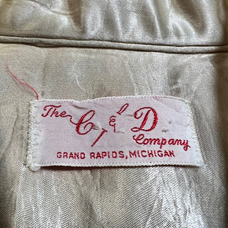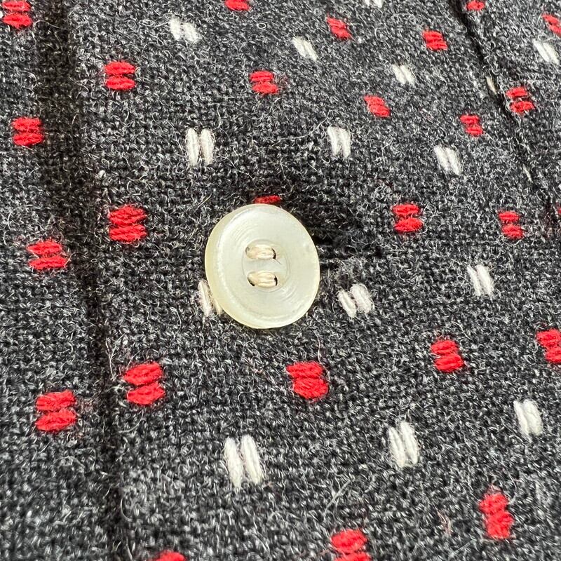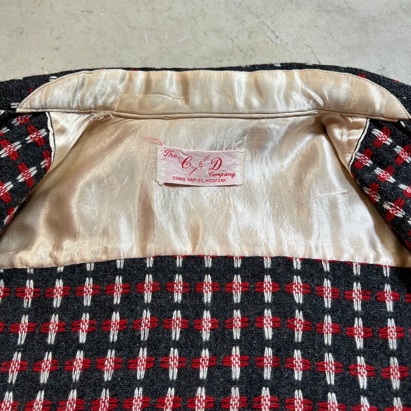 50年代頃のThe C&D Companyウールオープンカラーシャツです。このThe C&D Companyという会社の詳細は不明ですが、ミシガン州のGRAND RAPIDSという都市を拠点に展開していたようです。グレー地に赤と白の刺し子のデザインが入るこちらは、やや丸みのある袋襟でループボタンの付くオープンカラーシャツです。胸ポケットにはフラップは付かない仕様です。袖先のプリーツの入り方も綺麗です。サテンの裏地もダメージはほとんど無く、ウールに虫食いも無いグッドコンディションです。S表記ですが、縮みはほとんど無いのでM~L相当の大きさはあるかと思われます。この手のシャツで、ここまで状態が綺麗な物はなかなか見かけないと思います。色味も落ち着いていますので、コーディネートの幅は広く使い勝手の良いアイテムだと思います。ミリタリーチノやワイドスラックス等と合わせたルード感あるスタイルに合わせてもカッコ良いのでは無いでしょうか。