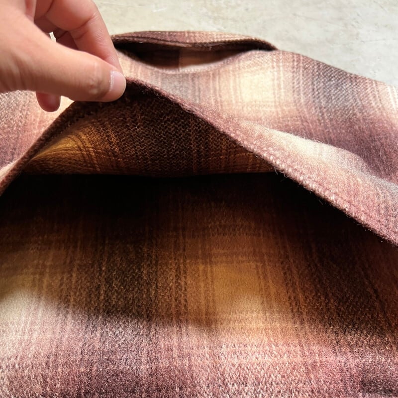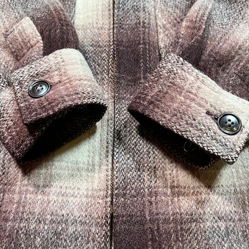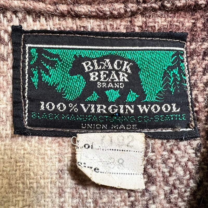 40年代から50年代頃のBLACK BEAR ウールマッキーノージャケットです。BLACK BEARは、1904年にGeorge G Black氏によりシアトルで設立されたワークウェア等を製造していたブランドです。ご紹介するこちらは、アウトドアシーン等で使用されるマッキーノージャケットで、裏地の付かないタイプです。この手のジャケットではバッファローチェックが主流ですが、オンブレチェックのウールで仕立てられています。フロントはブラスのTALONジッパーです。胸から背中中央付近まで生地が2重になっていますが、袖は1枚生地です。右胸ポケット内側にユニオンチケットが縫い付けられています。襟元に薄汚れはございますが、その他ダメージ等なくコンディションは良好です。Lotナンバーとサイズが表記されたタグも綺麗に残っています。38表記です。ウールですが、ヘヴィーアウターではありませんので、着やすいアイテムだと思います。ブラウンベースですので渋めなスタイルで合わせていただくとカッコ良いのではないでしょうか。BLACK BEARはお好きな方も多いと思いますので、お探しだった方は是非この機会いかがでしょうか。