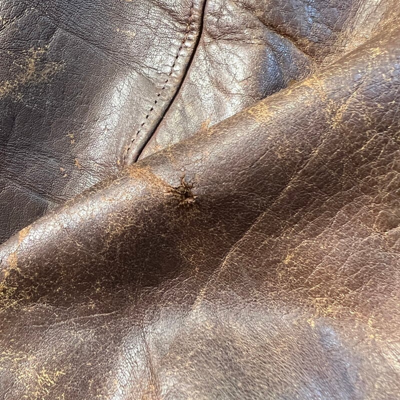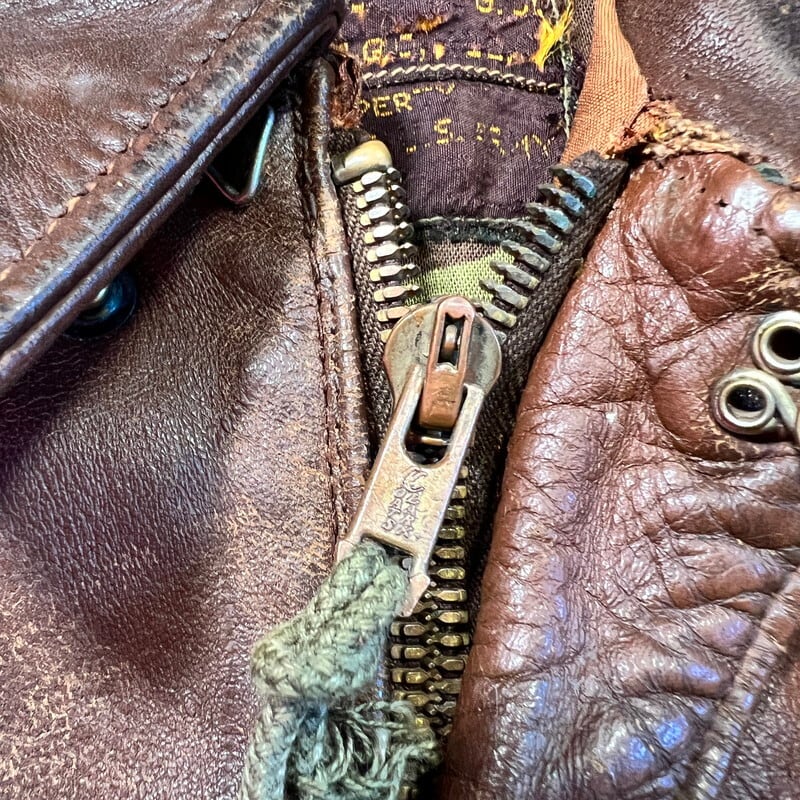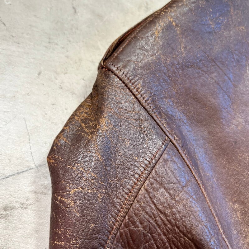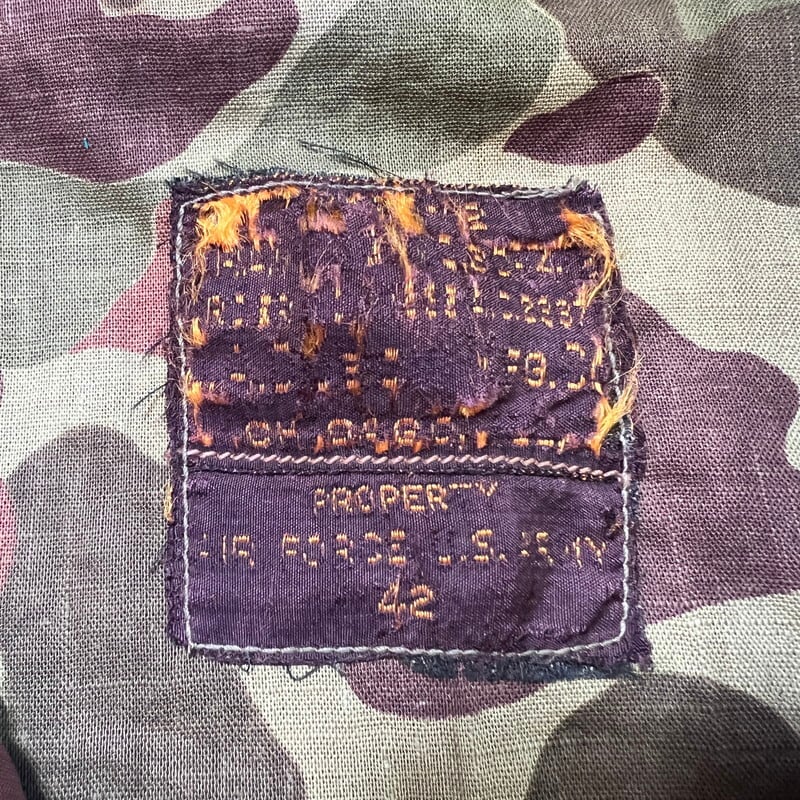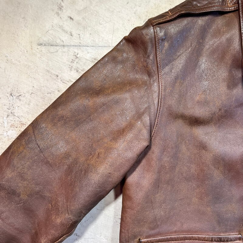 40年代頃のUSAAF A-2レザーフライトジャケットです。ライニングがリペアの際にフロッグスキンカモの生地に取り換えられており、タグが移植されています。タグは擦り切れによりコントラクター等詳細は不明です。ジッパーはCorts&Clarc社の物に取り換えられており、リブも2トーンに付け替えられています。全体的に 擦れやダメージがあり、ヴィンテージらしい面構えの1着です。襟や袖に一部レザーが裂けた箇所がございます。マスタングペーストで軽くオイルメンテナンス済です。42表記で、良いサイズ感だと思います。状態的には完品ではございませんが、第二次世界大戦を乗り越えて現存していると考えれば良好なコンディションなのかもしれません。オリジナルのA-2はコンディションが良ければ数十万円はする非常に希少なアイテムです。ライニングのカスタムも雰囲気が良いので、お好きな方は是非この機会にいかがでしょうか。