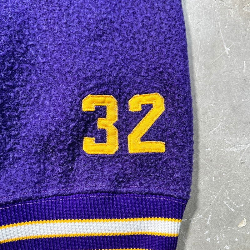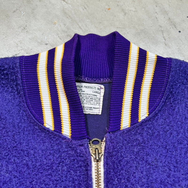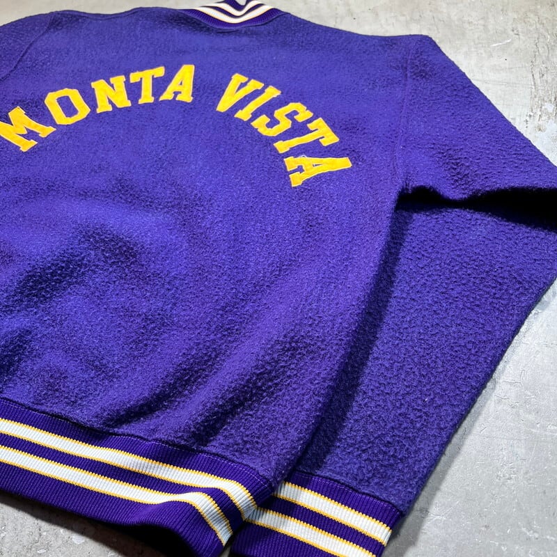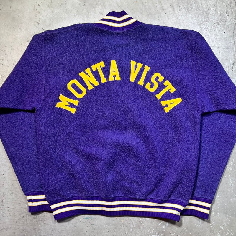 60年代のCHAMPION PRODUCTS INC ハーフジップナイロンフリーススウェットです。タタキタグが付くこちらムは、カリフォルニア州クパチーノにあるMonta Vista High Schoolのアイテムです。この高校は1969年に節理されたので、1969年もしくは1970年代初頭頃に作られた物だと思われます。毛羽立ちのあるナイロン地のスウェットで、ハーフジップにはTALONが使用されています。フロント下部にナンバリング、背面に高校名がサテンのようなパッチが縫い付けられています。このナイロンフリーススウェットに限らず、パープルカラーはあまり見ない印象です。LARGE表記で良いサイズ感だと思います。ナイロンフリース特有の毛羽立ちはありますが、ほとんどダマになっていません。全体的にややフェードも見られ。ナス紺のような雰囲気もございます。チャンピオンといえばリバースウィーブに注目が行きがちですが、このあたりのアイテムも年々良いサイズの物が見つかりづらくなっています。ダメージは特にありませんので、お探しだった方は是非この機会に手に入れられてはいかがでしょうか。