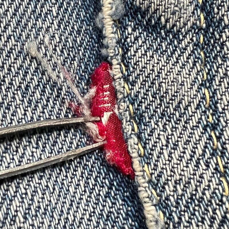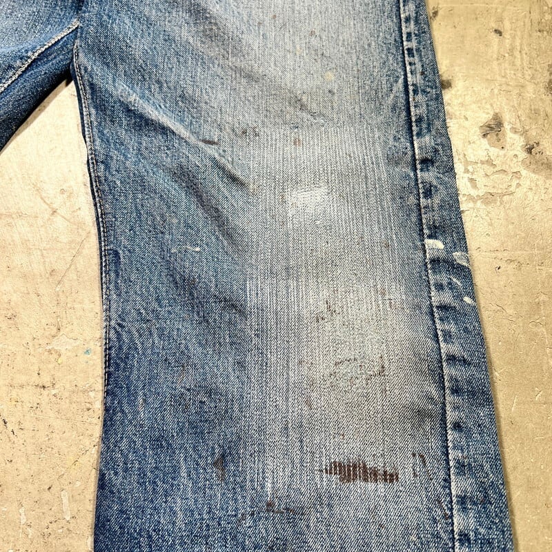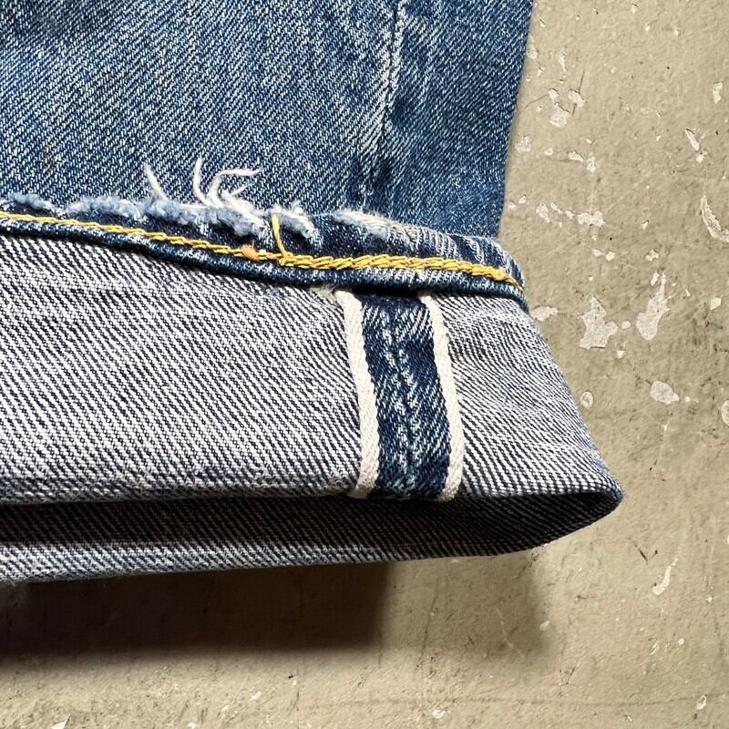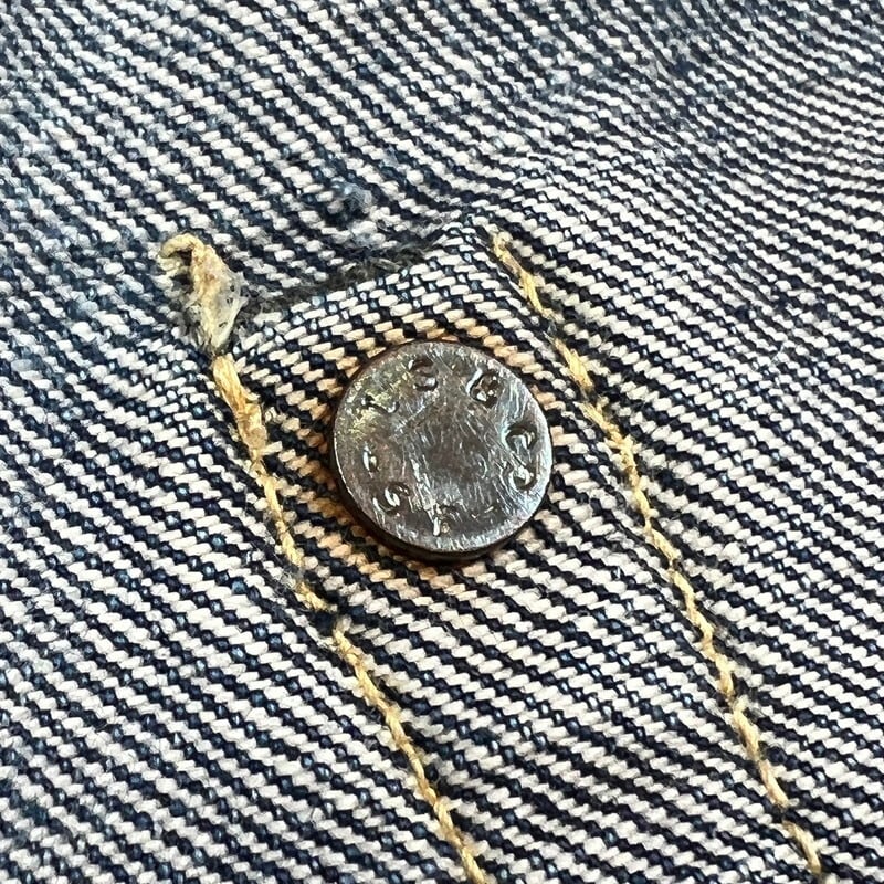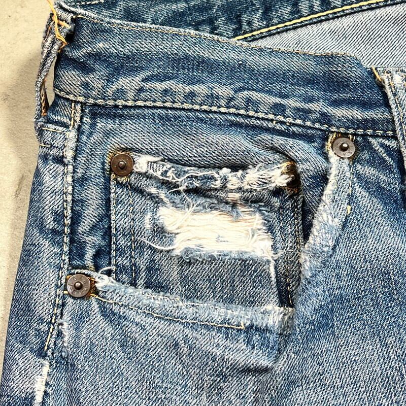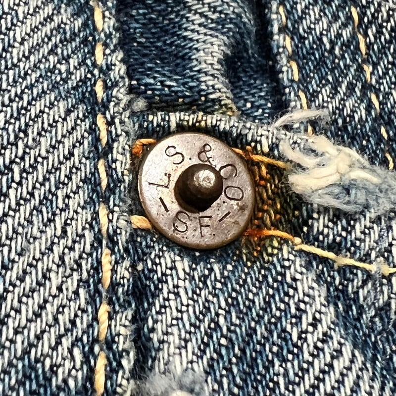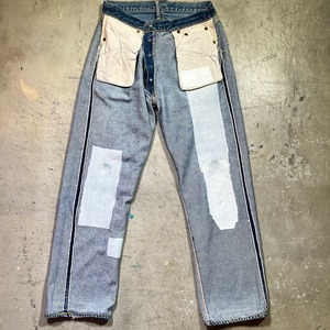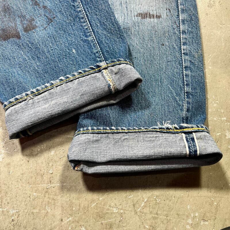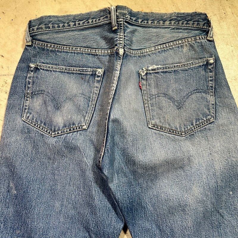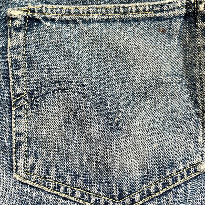 50年代頃のリーバイス501XXです。パッチはほぼ欠損していますが、右上部に小さな破片がかろうじて残っています。フロントVステッチ、フライボタン通常R、トップ裏ドット刻印、隠しリベット刻印12、ウォッチポケット裏シングル、鉄製銅メッキリベット、オフセットループ、両面赤タブBig E。色残りは4割程で、ヴィンテージらしい色落ちのデニムです。ウォッチポケットにダメージがあり、裏から接着芯の様な生地が当てられています。両膝と両ポケット縁もリペアが施されています。リペアは丁寧に施されています。背面べセンターループの付け根もデニム地を当てたリペアあがあります。直しはいくつかありますが、ペンキ飛びが入る事でワーク感も増し雰囲気の良い個体だと思います。何より、破片ですが革パッチが残っているというだけで希少性もグッと上がるのではないでしょうか。ヴィンテージウェアの中でも常に評価され続けている501XX。中でも革パッチ期のモデルとなると評価も高く、お探しの方も多いと思います。リペアこそありますが実寸W33~W34インチとゴールデンサイズですので、幅広い方に刺さる1本では無いでしょうか。今後さらに入荷が少なると思われますので、この機会をお見逃しなく。
