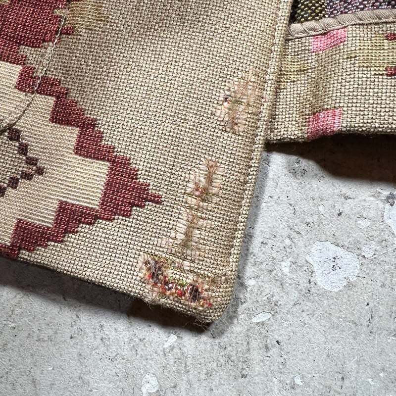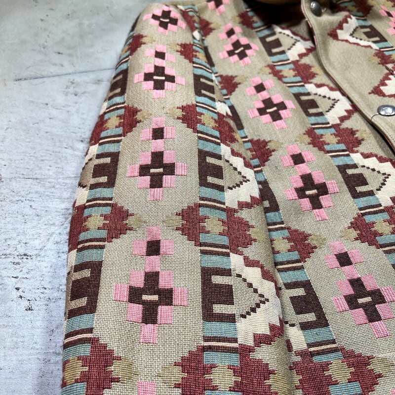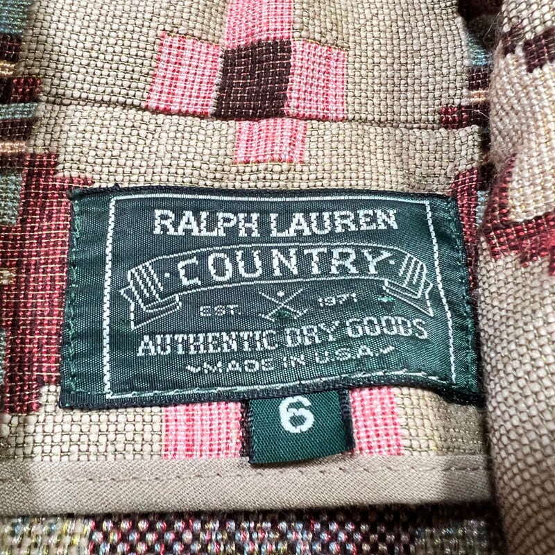 80年代後半から90年代初頭頃頃のRALPH LAUREN COUNTRY ネイティブ柄ラグジャケットです。こちらのRALPH LAUREEN COUNTRYは1988年に誕生したPOLO COUNTYのレディースラインです。ネイティブ柄があしらわれたラグジャケットで、レーヨンとウール(5%コットン)の混紡です。フロントにはコンチョボタンが使用されており、3つのポケットが配置されたカバーオールタイプです。フロント下部やポケット下部の生地に擦れや小さなダメージがございます。使用感はございますが、気になる汚れ等は特にございません。レディースラインでありながら、メンズ合わせでサイズもメンズのM相当ございます。ボディがベージュメインですので、落ち着いた印象です。ハットにデニムのBDシャツでタイドアップしても非常にカッコ良いと思います。シルエットも綺麗ですので、お勧めです。今では希少なUSA製でCONTRYの中では比較的初期の頃のモデルだと思いますので、お好きな方は是非この機会にいかがでしょうか。