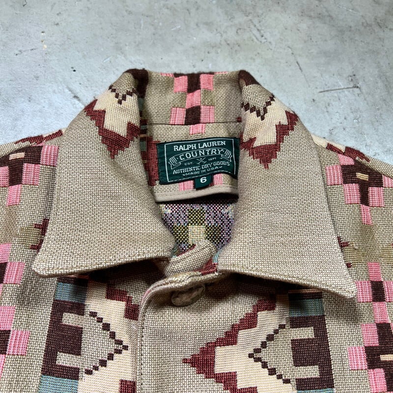 80's~ RALPH LAUREN COUNTRY ラルフローレンカントリー ネイティブ柄 ラグジャケット レーヨンウール ベージュ ポロカン カバーオール USA製 メンズM相当 希少 ヴィンテージ BA-2025 RM2444H