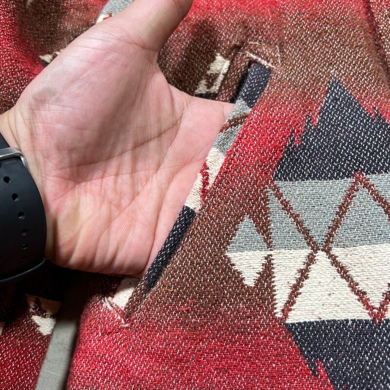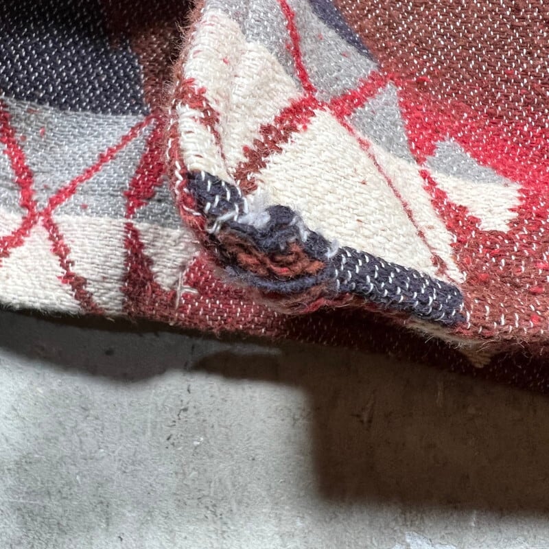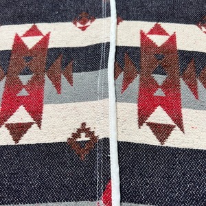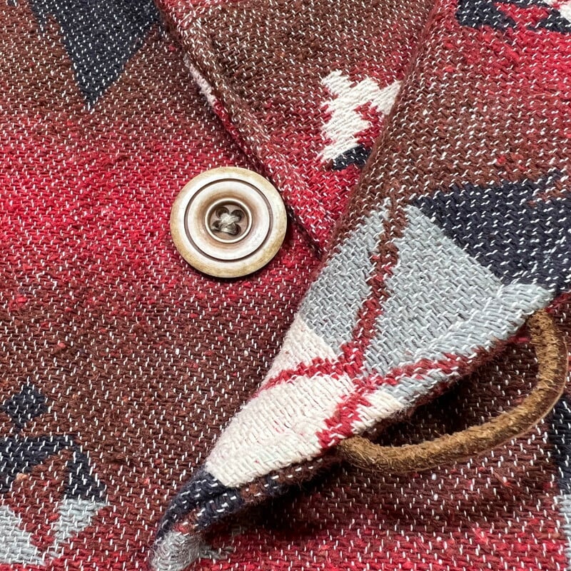 90年代のRRL ネイティブ柄ショールカラージャケットです。RRLは1993年POLO COUNTRYの後継として登場したヴィンテージスタイルラインです。人気のネイティブ柄で、こちらはコットン100%です。ショールカラーにダブルブレストのPコートタイプで、ハンドウォーマーポケットとフラップポケットがございます。木製(水牛?)のような大振りなボタンが付きます。ヴィンテージのBEACONガウンのようなグラデーションが特徴的です。多少擦れ等の使用感がある、フロント中央裾に若干ダメージがございます。元々は、腰ベルトが付くモデルのようですが、ベルトループを取り除いてある可能性がございます。綺麗に取り除かれていますので、あまり気にならないと思います。内側で留めるためのボタンが付け替えられています。サイズはMでやや身幅が細身なモデルです。初期の三ツ星タグで希少なUSA製のネイティブ柄となるとお探しの方も多いのでは無いでしょうか。サイズも良いのでお探しだった方は是非いかがでしょうか。