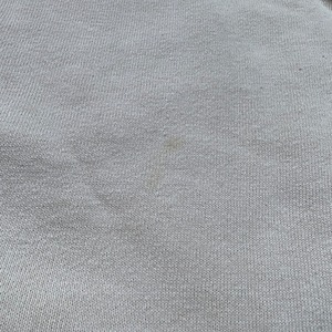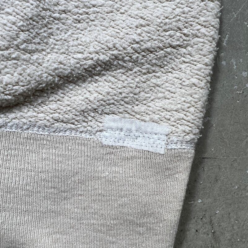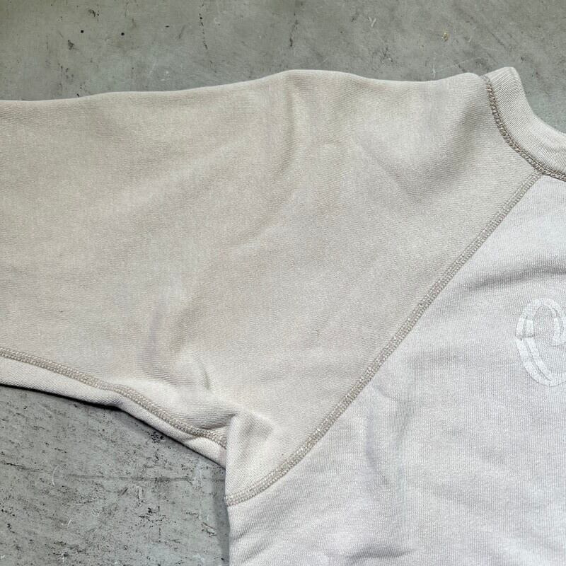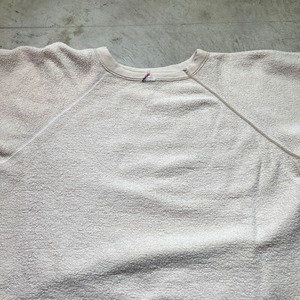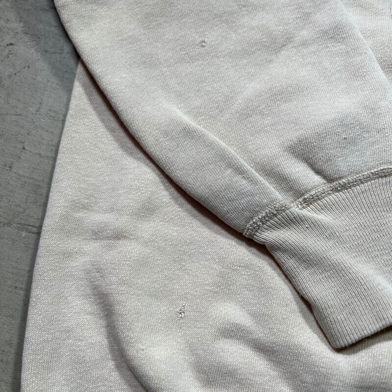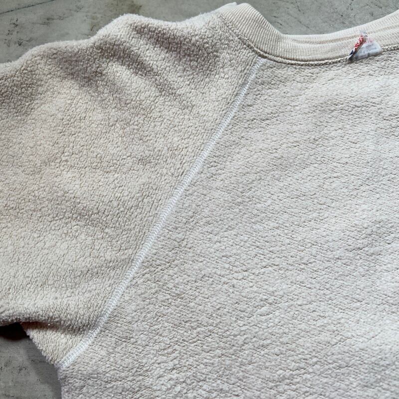 60年代のCHAMPIONラグランカレッジスウェットです。1906年に設立されたニューヨーク州立大学のCanton校のプリントがフロントに施されたアイテムです。この年代辺りのスウェットでは比較的出現率の低いライトベージュボディです。ネックは2本針、その他は4本針で縫製されています。左後のス裏側のみベージュの糸でステッチされておりますが、リペア等では無く当時のエラーなのかもしれません。表からはわからないですが、珍ピオンがお好きな方には刺さるディティールでしょうか。ランタグのスウェットは縮みが入り、表記サイズに比べると小さい物が多いですが、こちらはXL表記で縮みをほとんど感じない希少な大き目サイズです。左背面の裾リブ付け根にリペアが施されています。袖や腹部に小穴や、薄汚れが見られます。なかなかここまでのサイズ感の個体は見かける事も少ないので、サイズでお探しだった方は是非いかがでしょうか。色味も非常に興味深いので、チャンピオンフリークにもオススメしたい1着です。